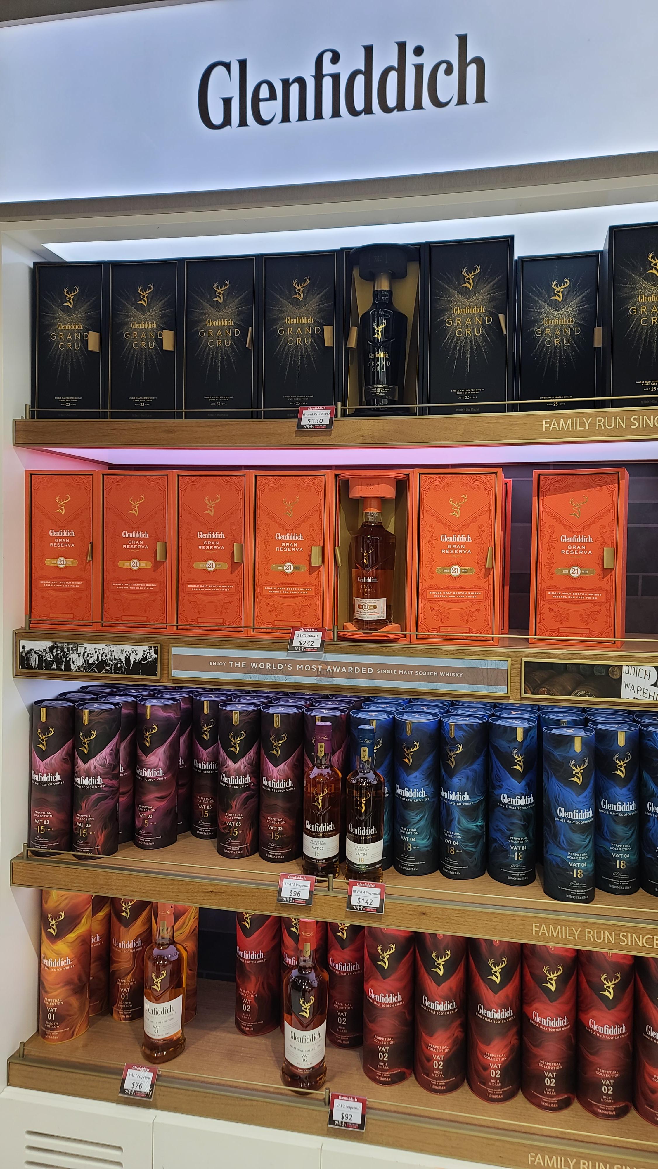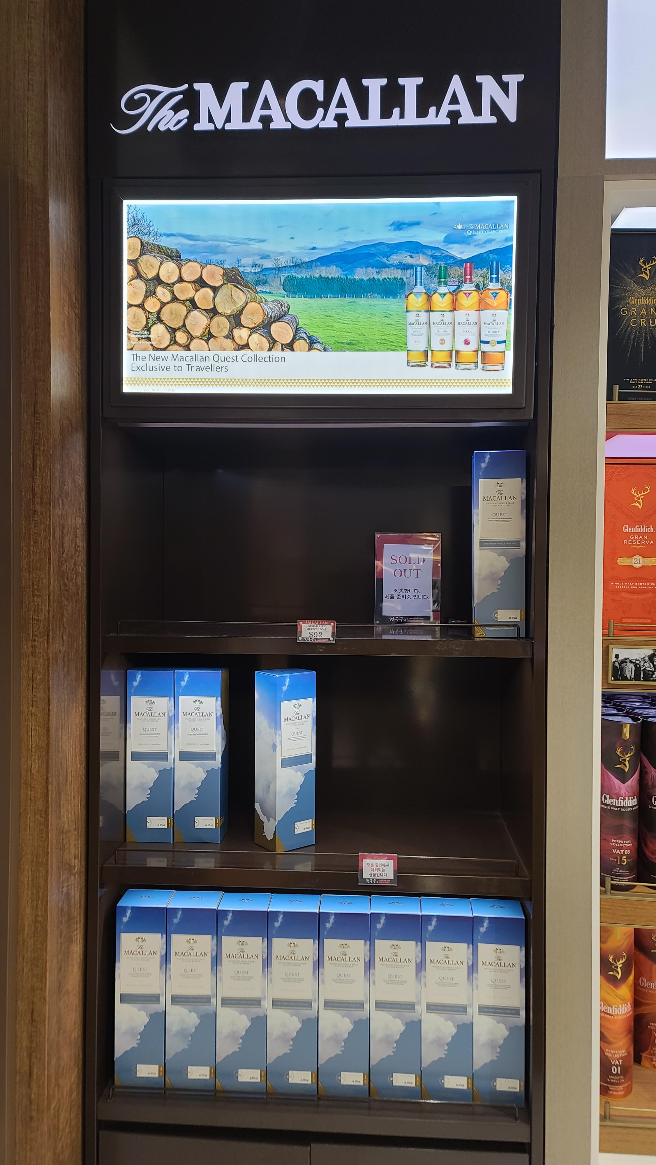 디아지오의 매대 옆쪽으로는 국내 싱글몰트 위스키 판매의 쌍두마차 맥캘란과 글렌피딕이 나란히 진열되어 있습니다. 맥캘란 퀘스트가 $92에 판매되고 있으며 프로모션 없이 단품으로 구성되어 있는 모습은 참으로 안타까움을 금할 길이 없습니다. 이에 반해 글렌피딕은 그랜드CRU부터 그랑 리제르바, VAT2번에서 4번까지 이어지는 페페추얼 컬렉션, 21년, 15년, 18년 시리즈가 매대를 가득 채우고 있으며 다양한 가격대들로 구성되어 있어 상당히 구매욕을 자극하는 상반된 모습을 보여주고 있습니다.