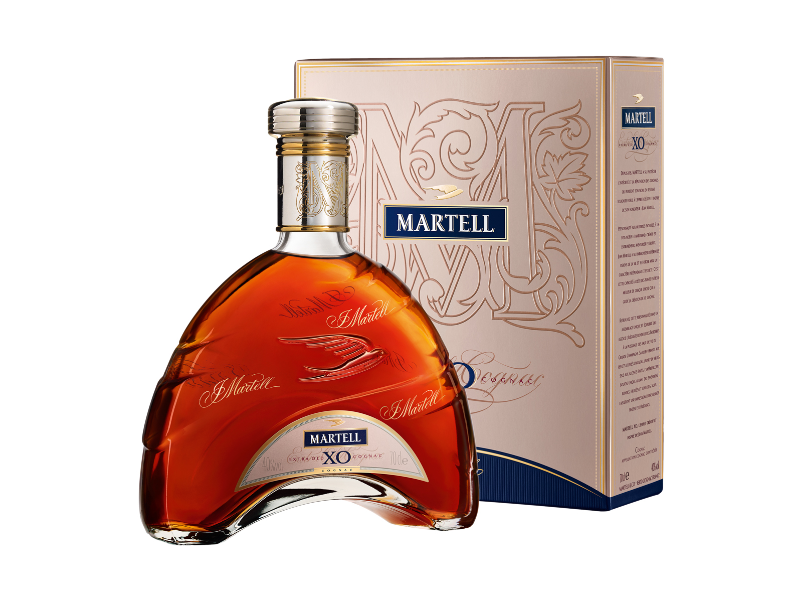 마르텔 XO 제품은 최소 10년이상 숙성시킨 원액을 블렌딩하여 만들어지는 최고급 제품으로 매우 짙은 빛깔에서 우러나오는 깊고 풍부한 아로마가 특징인 제품입니다. 오랜 숙성으로 과실향과 오크통의 향이 어우러져 매우 복합적인 맛과 향을 나타내며 특히 그랑드 샹파뉴 지역의 원액이 가져다 주는 고급스러운 맛과 향은 최고급 제품에서 느낄 수 있는 엘레강스함을 잘 전달해 주는 것을 잘 알려져 있습니다. 국내에서는 면세점, 백화점, 몰트바 등 다양한 곳에서 만나볼 수 있으며 주류 대기업 페리노리카의 유통망에 힘입어 인기가 높은 제품이기도 합니다.