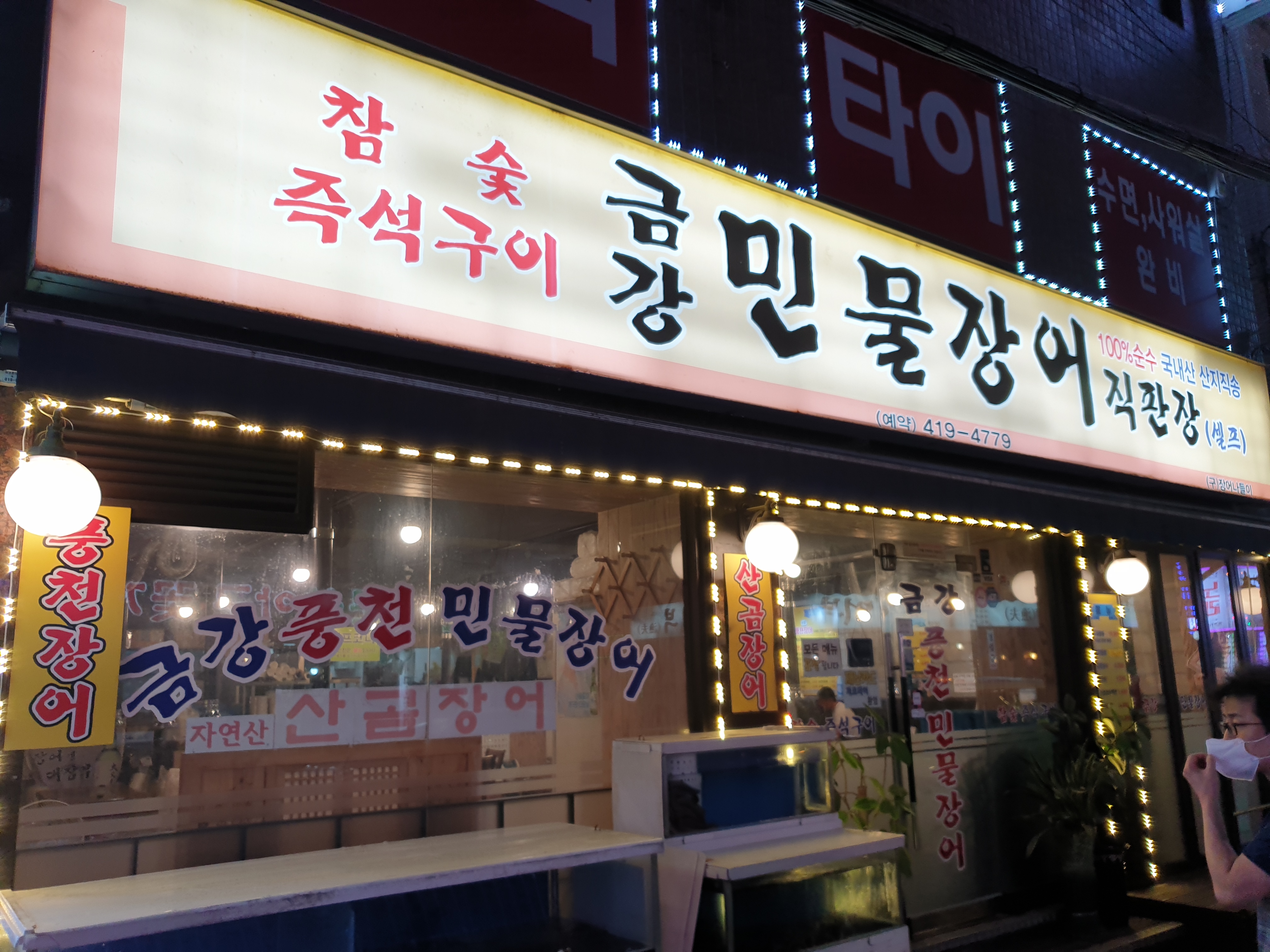 다니다보니 눈에 화악 들어오는 가게가 보입니다. 금강민물장어. 풍천장어를 숯불구이로 판다고 써있습니다. 국내산 풍천민물장어를 숯불구이로 즐길수 있다니 매우 구미가 당기는 가게입니다.