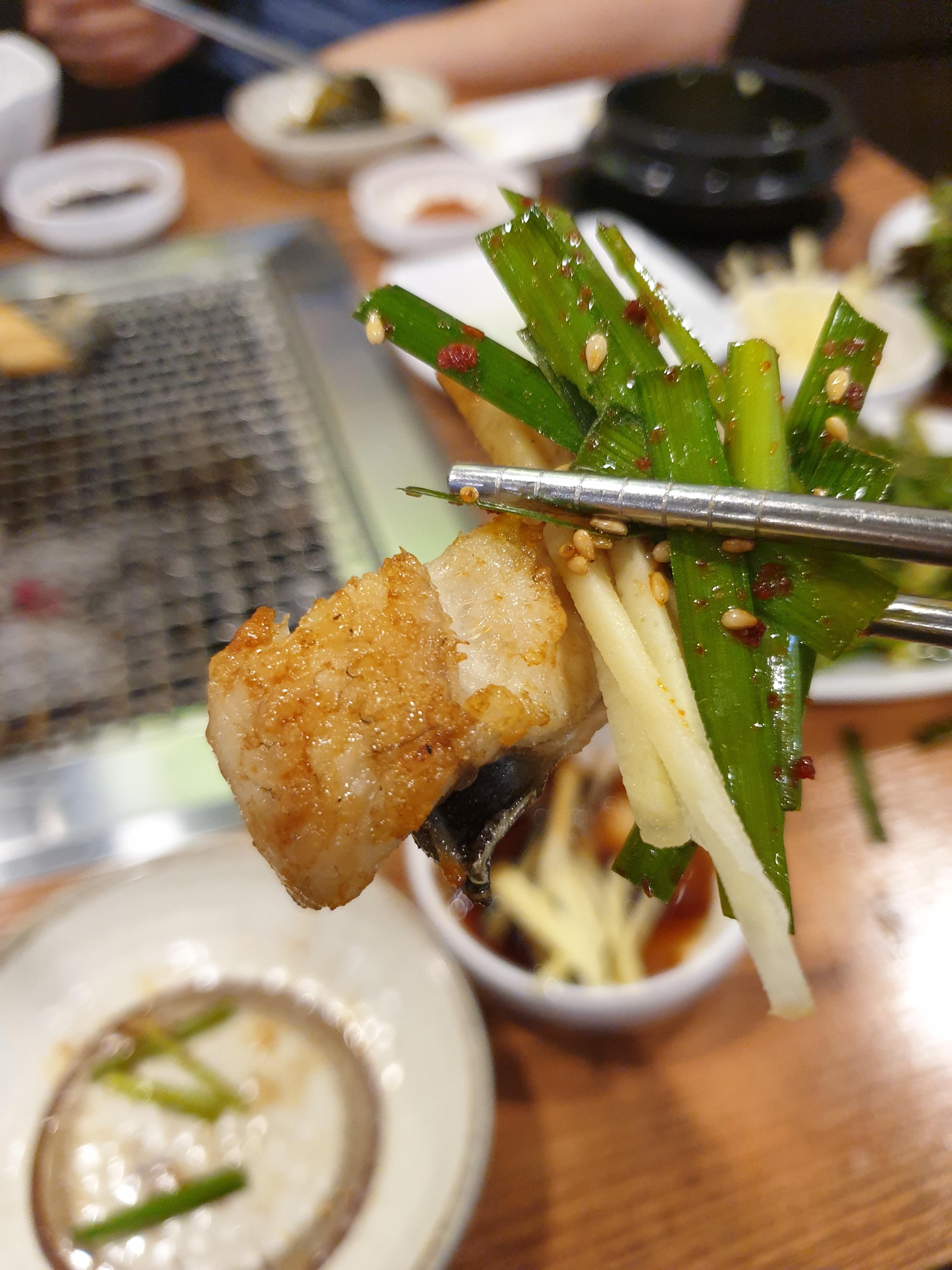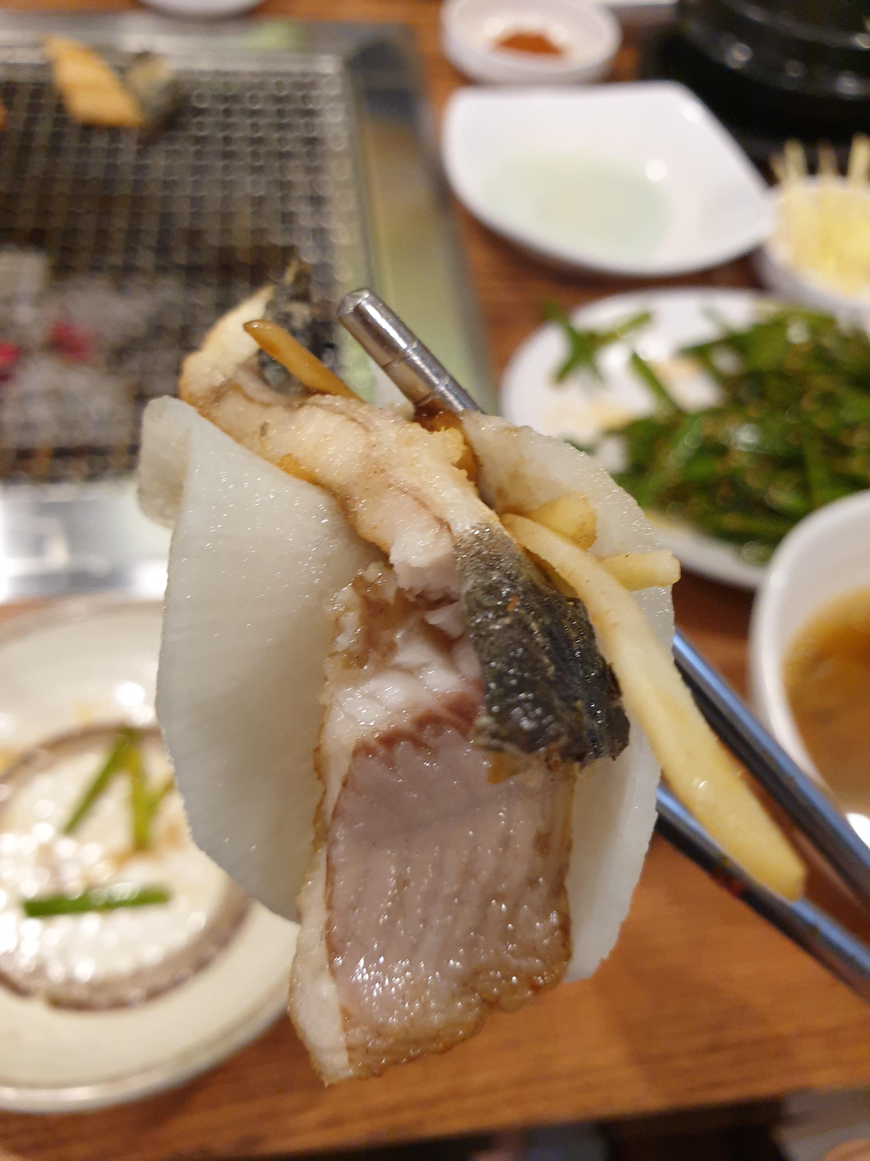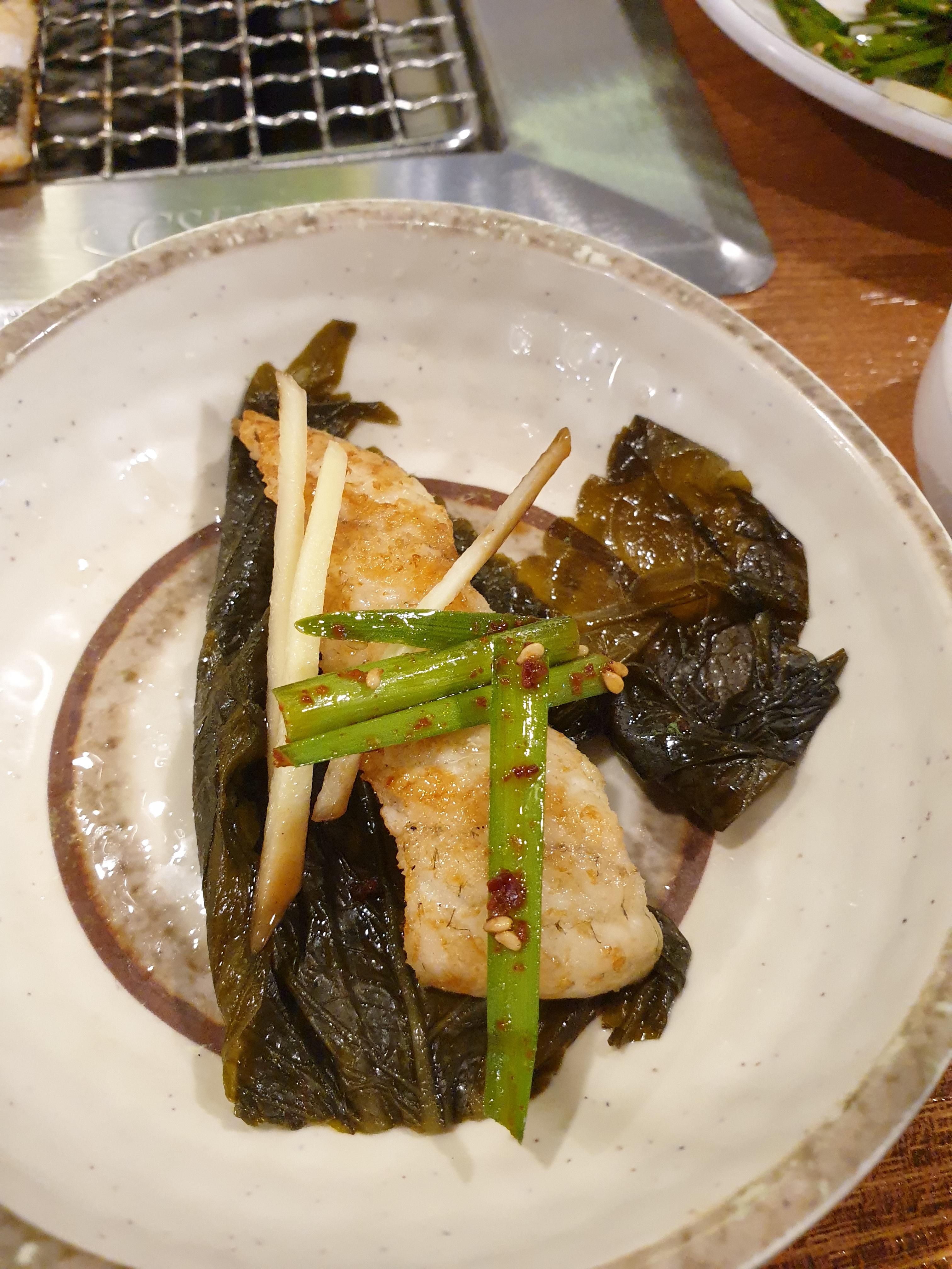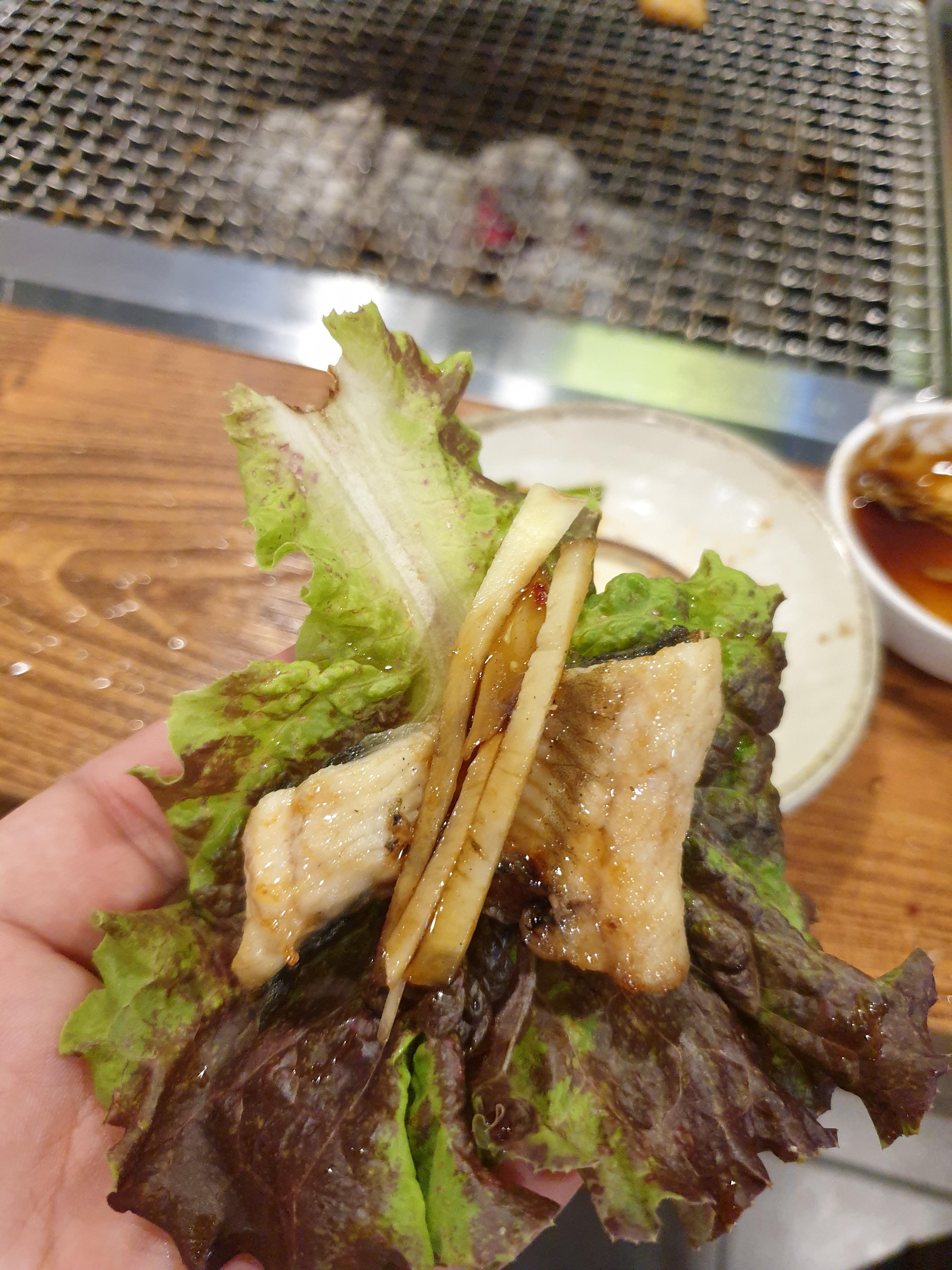 셀프바에서 가져온 무쌈으로 새롭게 장어를 싸서 맛을 봅니다. 새콤한 맛이 깻잎과 비슷하지만 아삭아삭 씹는 식감이 추가되어서 즐겁게 느껴집니다.