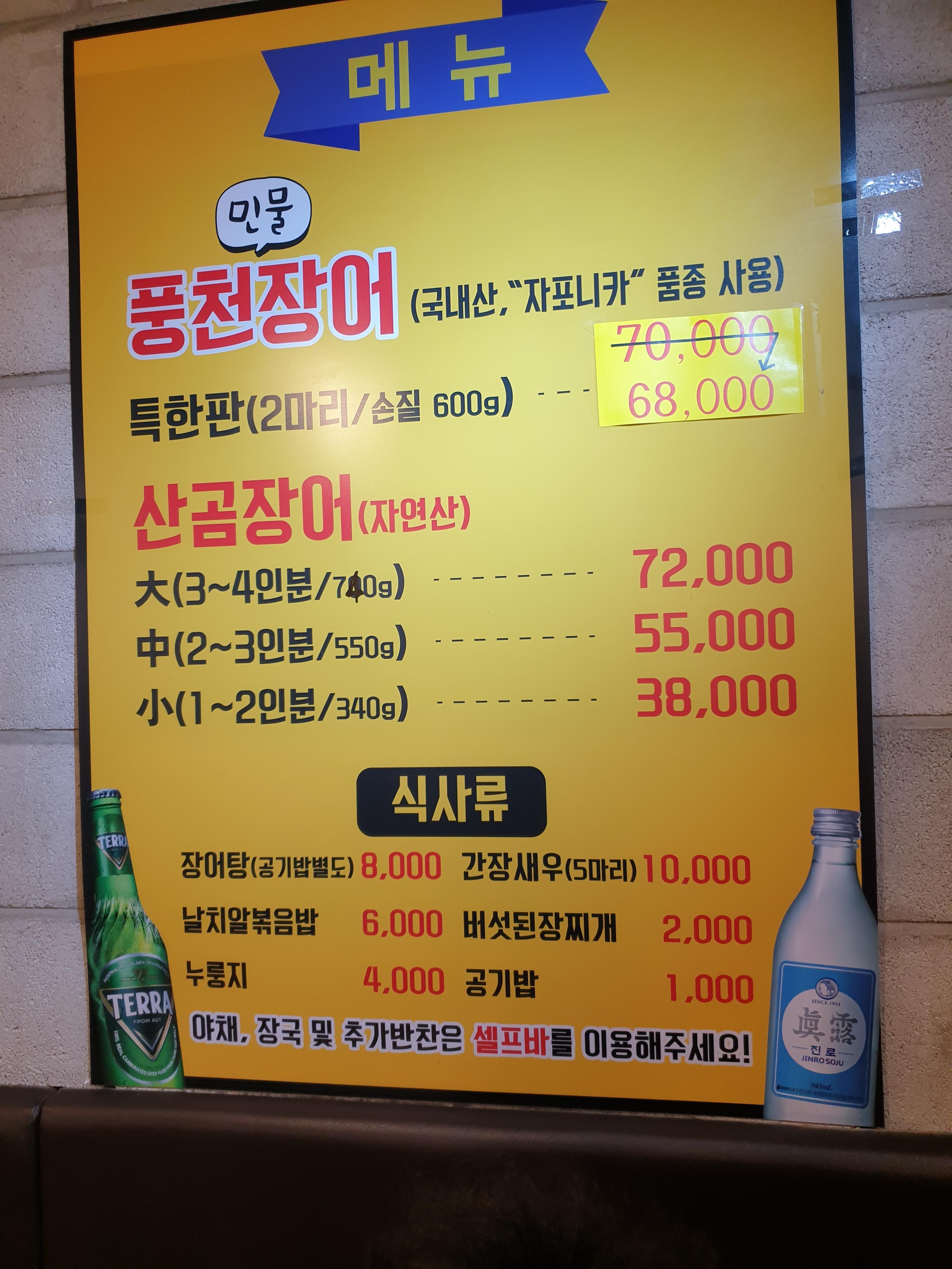 들어가서 메뉴를 봅니다. 풍천장어가 2인분에 68000원으로 행사를 하고 있습니다. 무려 2000원이나 할인 엄청나게 2.9%나 할인을 하고 있습니다..... 즐거운 마음으로 풍천장어를 주문합니다.