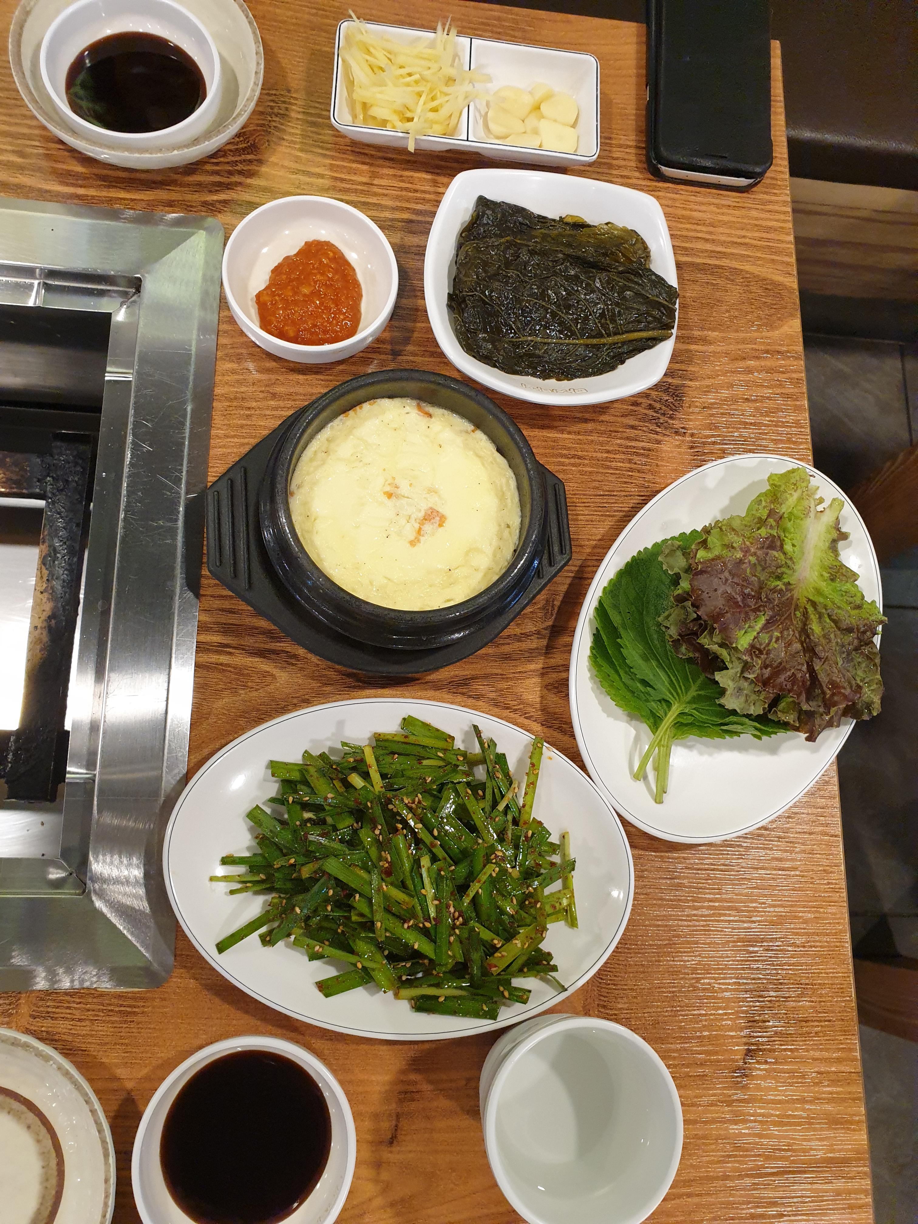 주문을 하자 기본찬으로 부추무침, 깻잎과 상추, 절인깻잎, 계란찜과 생강 그리고 소스가 나옵니다. 일단 계란찜으로 빈속을 달래주며 부추무침으로 입맛을 살려봅니다. 부추는 언제 먹어도 건강해지는 맛이 나는 것 같습니다.