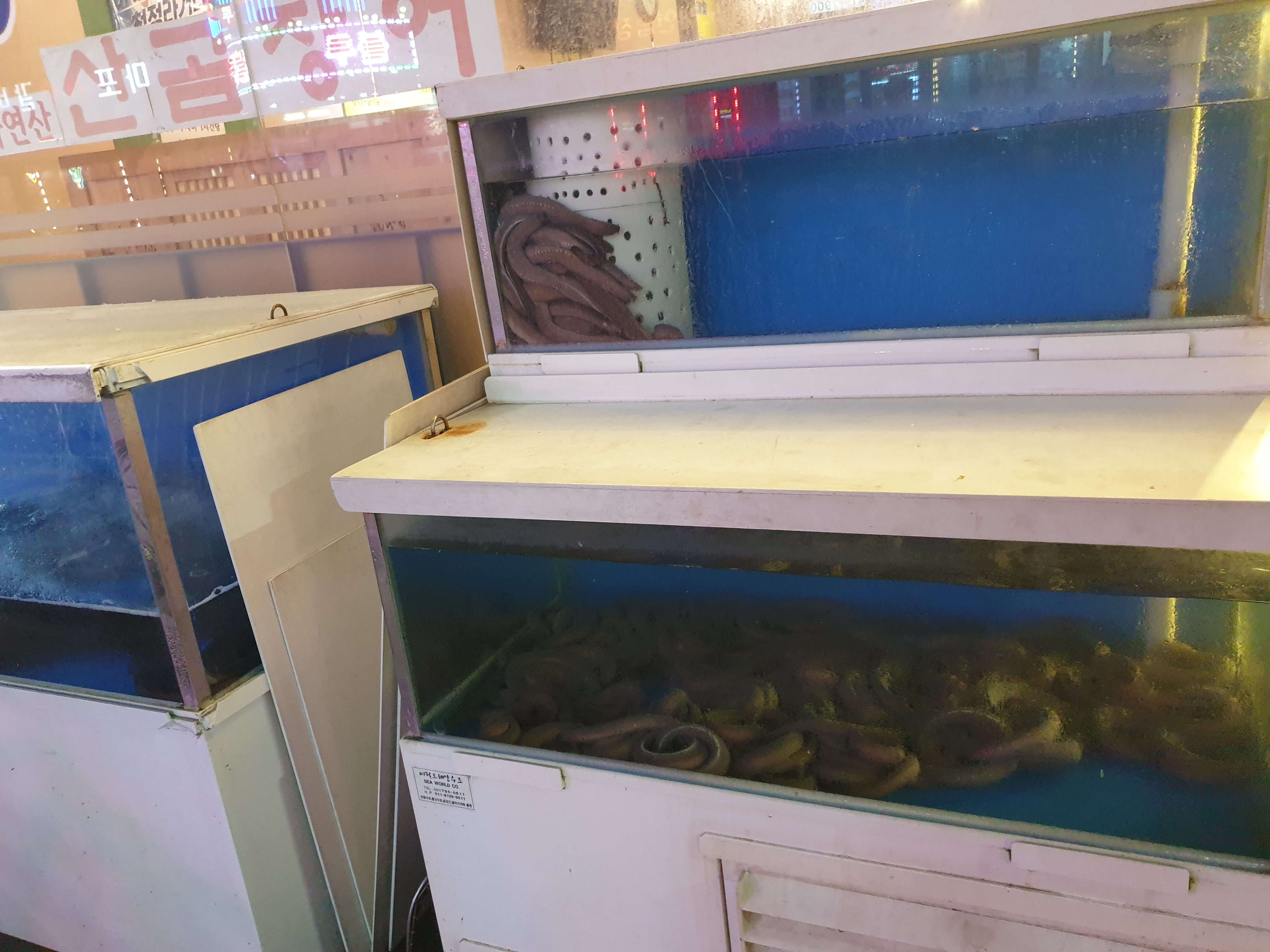 수족관에는 수많은 장어들과 꼼장어가 보입니다. 이정도 물량을 소화하려면 엄청난 매출이 있어야겠구나 하는 생각에 믿음을 가지고 가게로 들어갑니다.