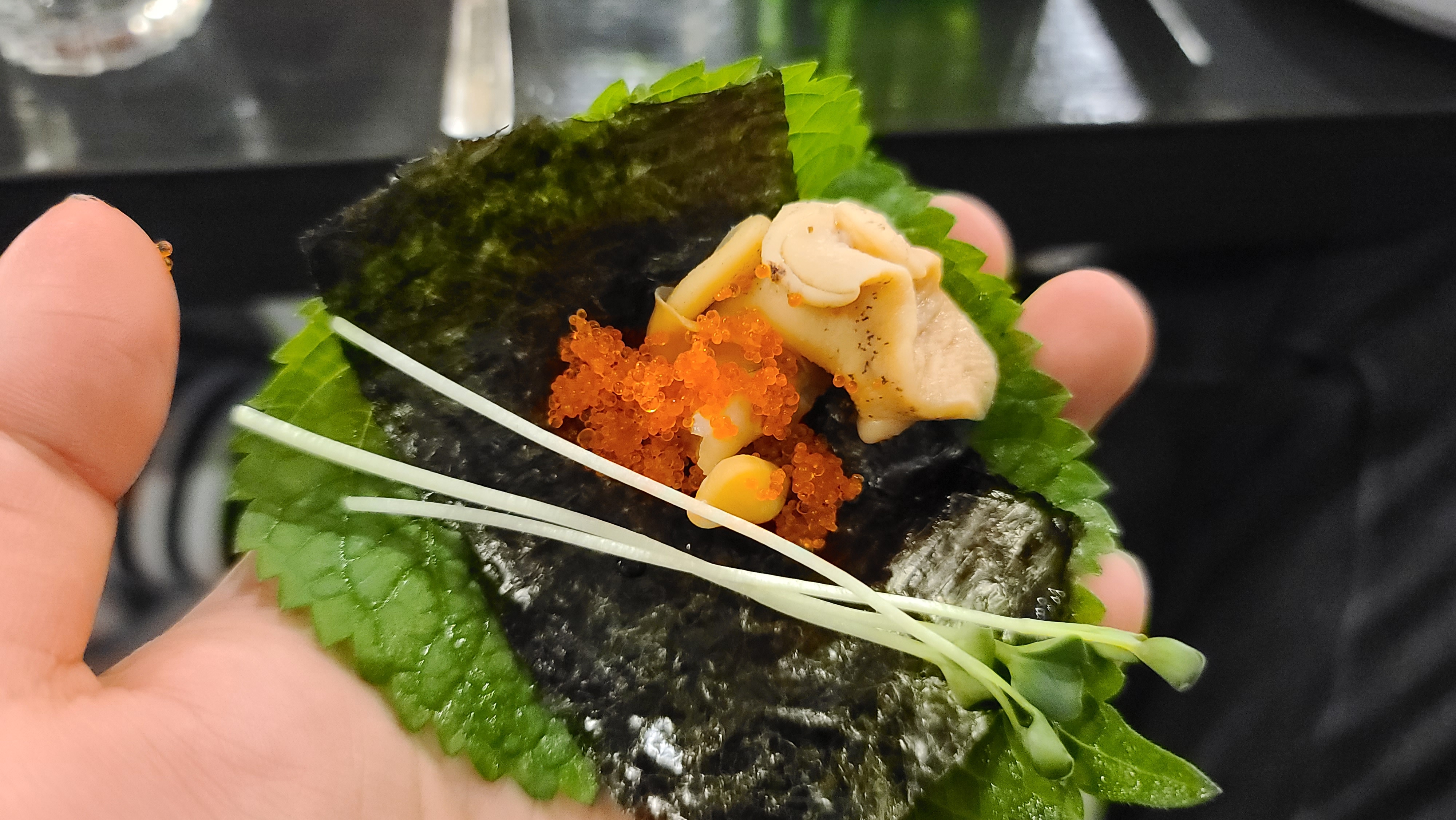 골뱅이살을 발라내어 김과 깻잎 그리고 날치알을 얹어서 싸먹어봅니다. 역시 필살기 김과 깻잎, 날치알의 고소함과 짭짤함이 어우러지면서 골뱅이맛을 극한까지 이끌어올려줍니다. 특히 김이 상당히 맛있기 때문에 김을 리필해가며 골뱅이를 먹으니 상당히 맛있게 느껴집니다.