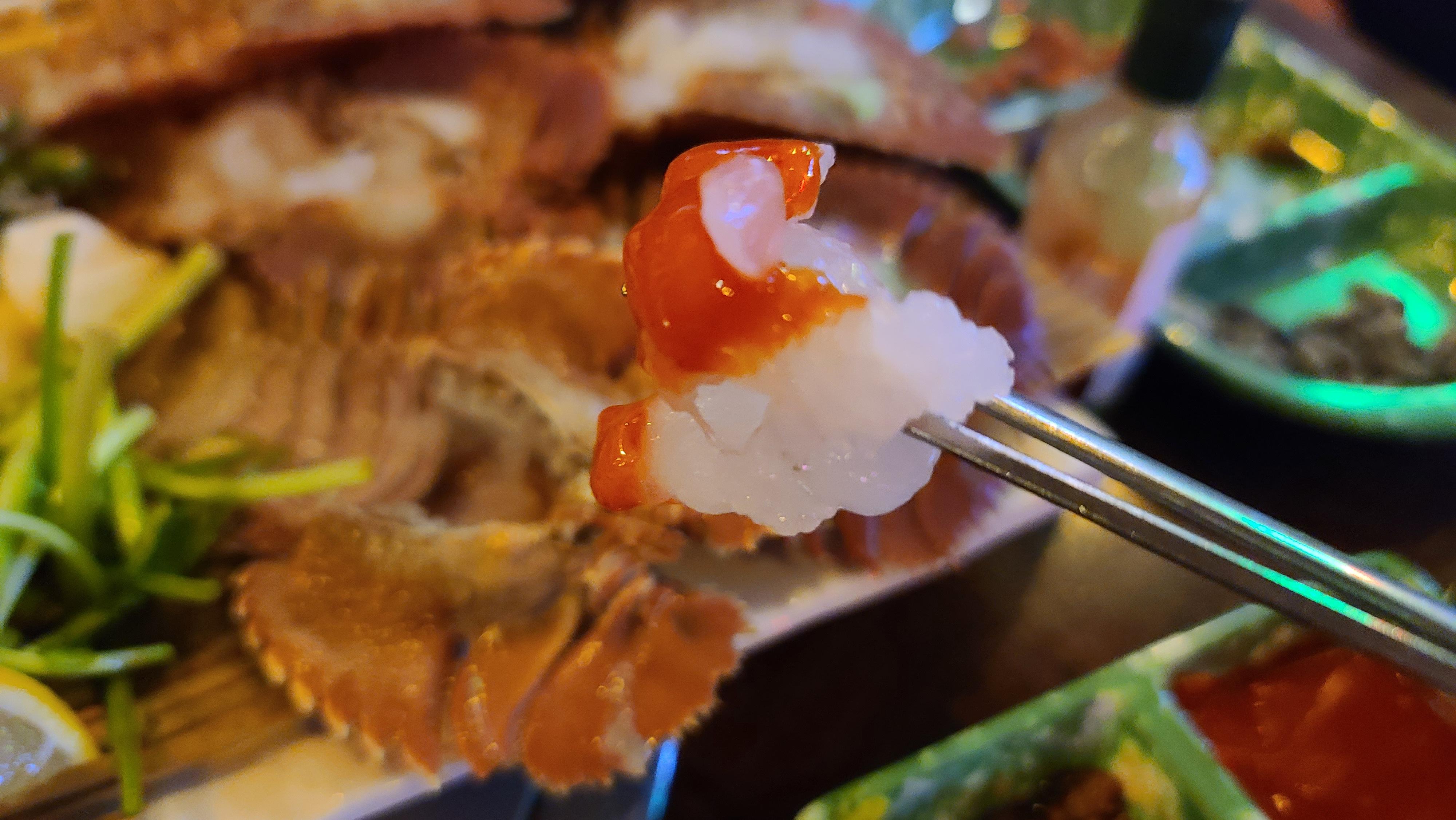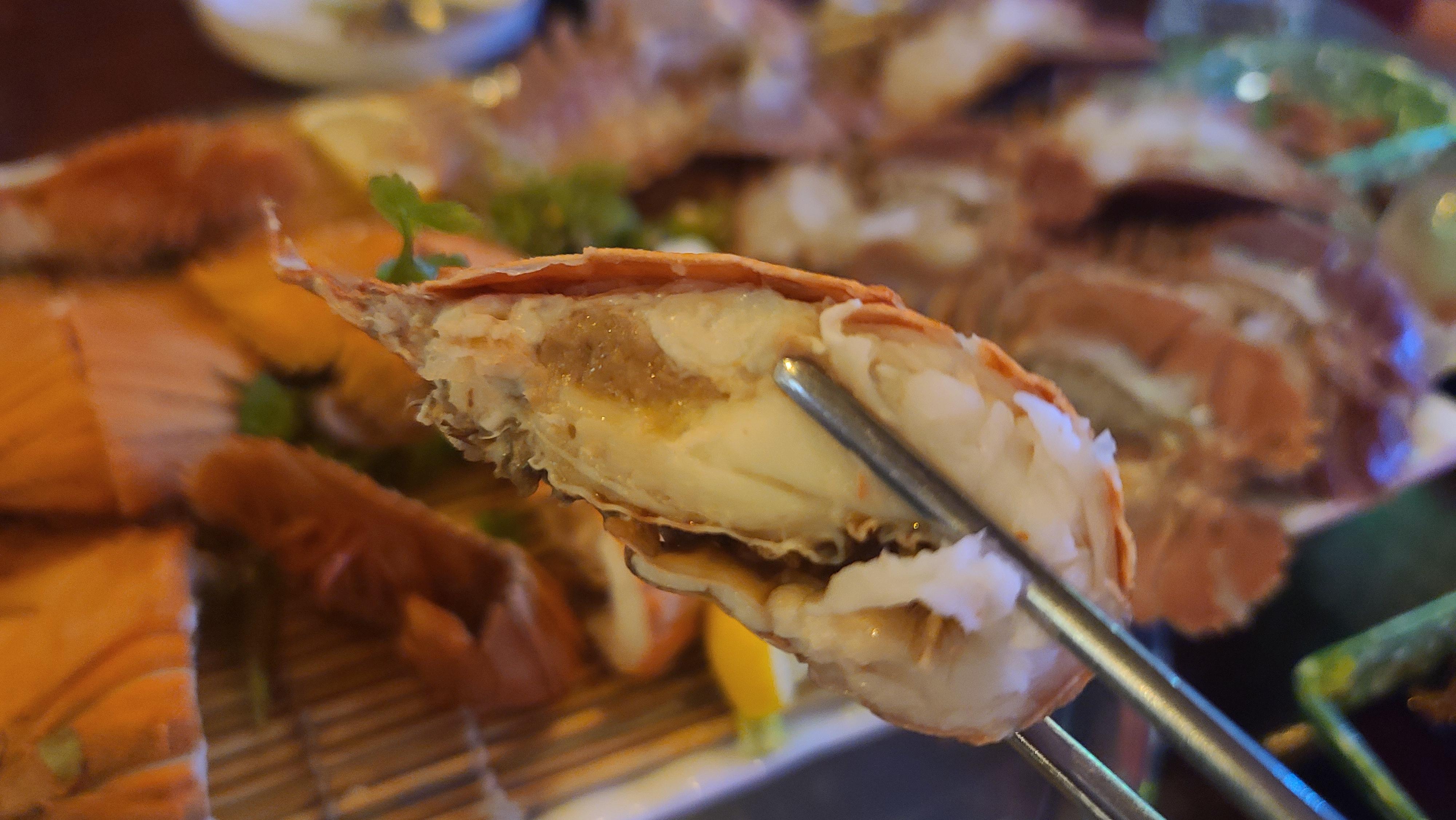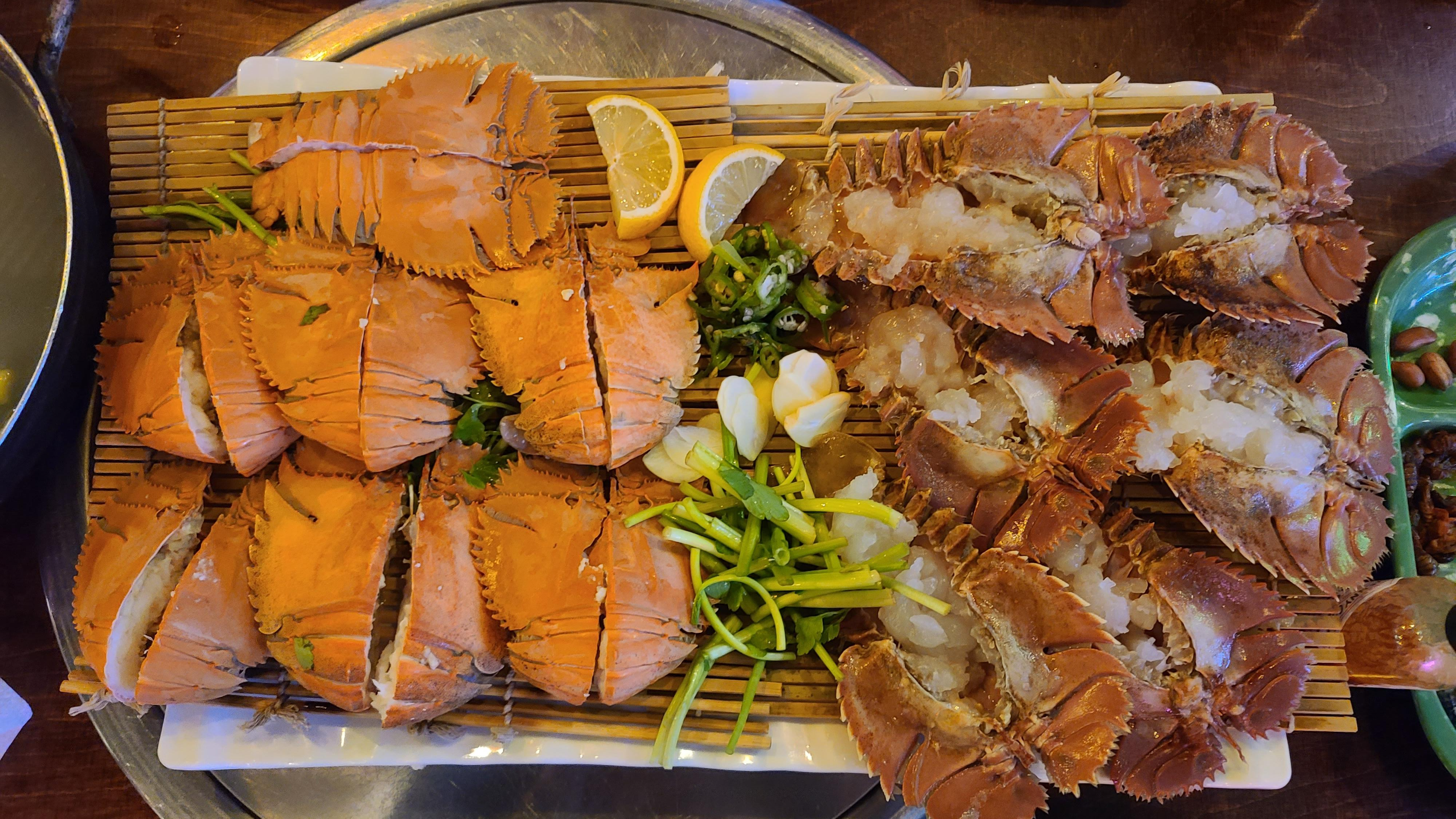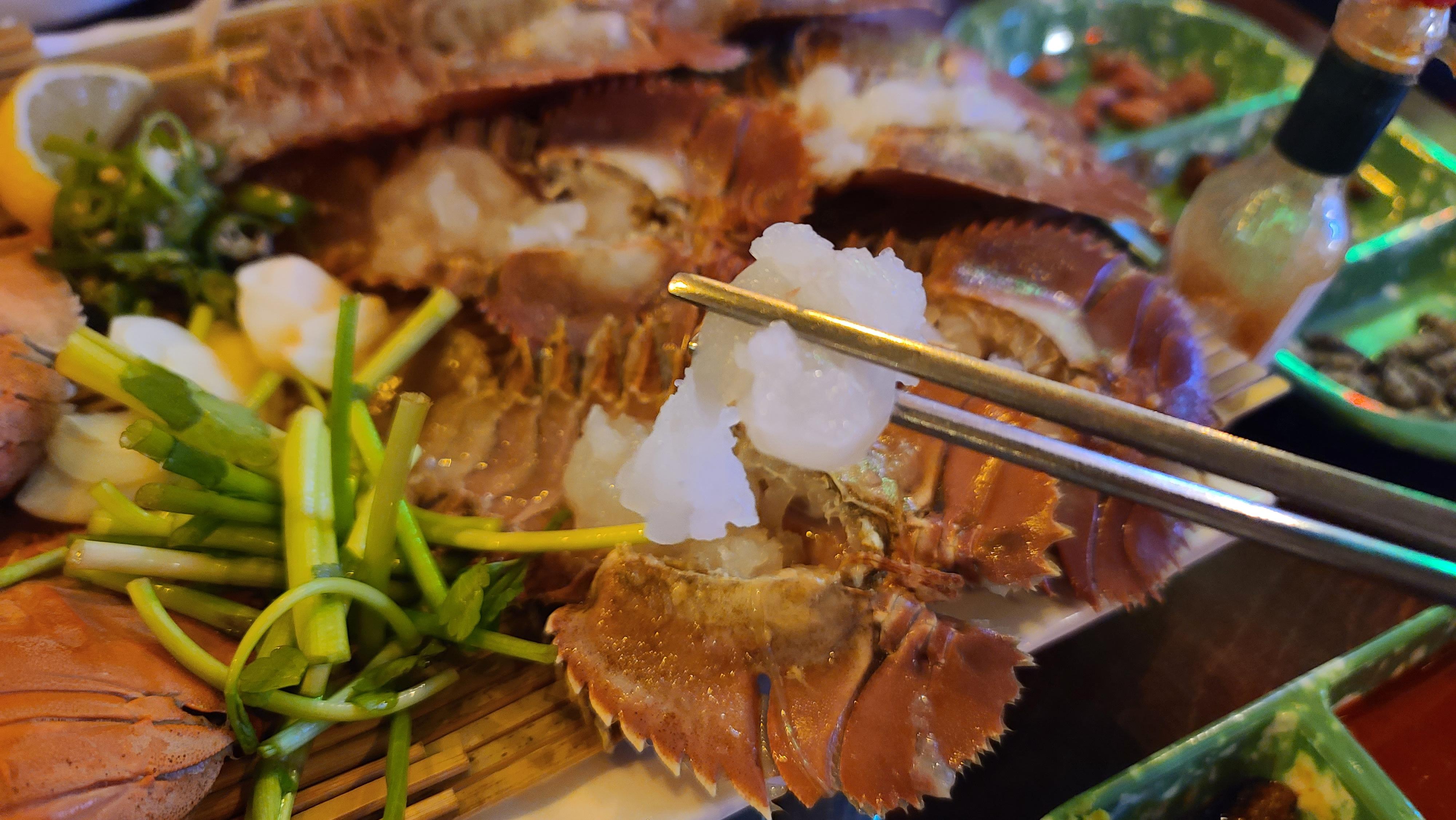 부채새우 오도리와 찜의 비주얼을 자세히 관찰해봅니다. 오도리 스타일은 부채새우의 배를 갈라서 속살을 생을로 먹기 좋도록 말끔히 모아 정리해 놓았으며 찜은 부채새우를 통으로 쪄서 먹기 좋도록 반으로 가른 모습입니다. 비주얼만 보아도 특이한 해산물을 먹는 다는 생각에 기뻐지고 인스타감성이 풀풀 펼쳐치고 있습니다.
