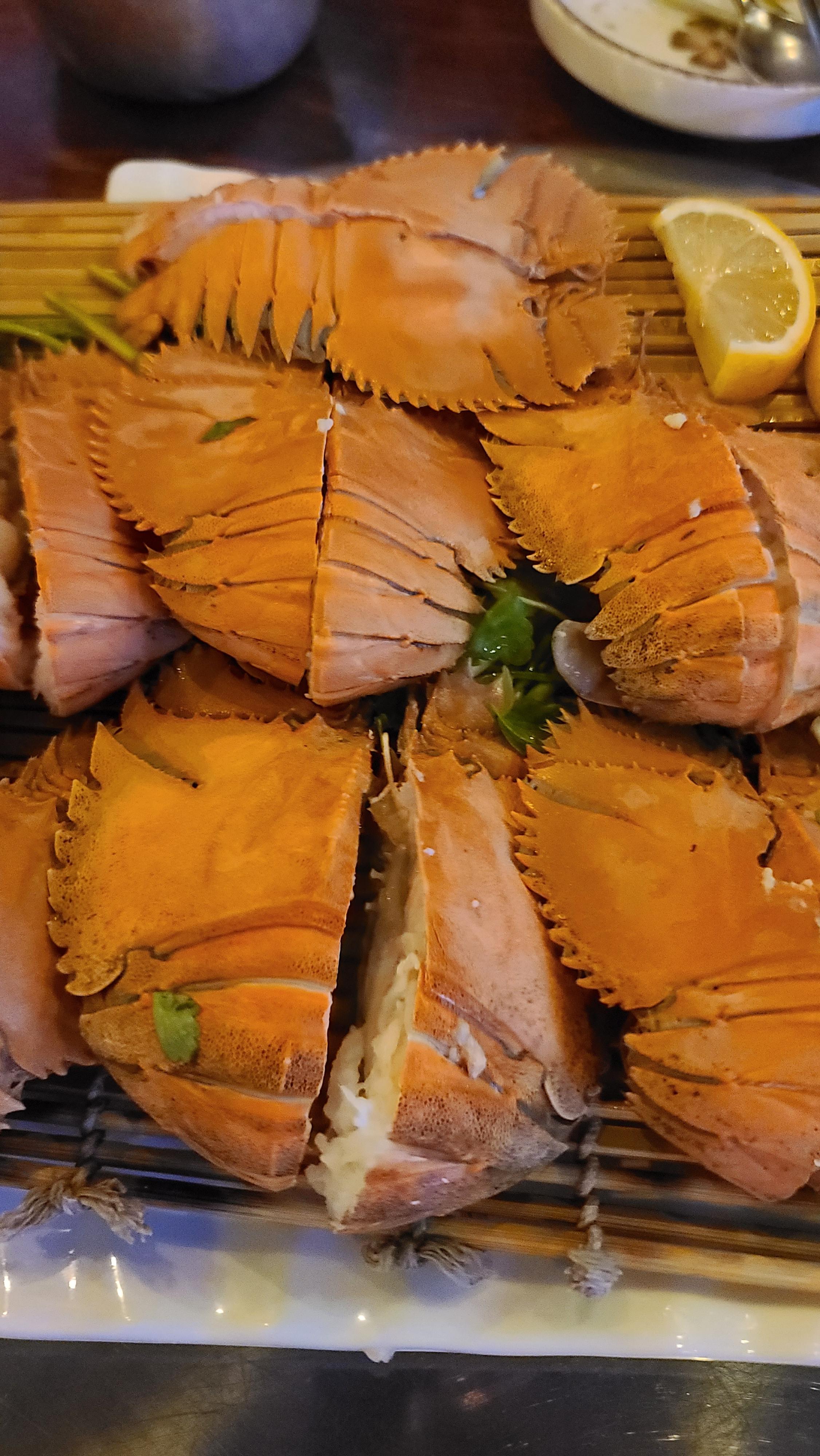 부채새우를 쪄서 내온 찜의 비주얼을 잘 살펴봅니다. 반으로 쪼개져 있어 젓가락으로 빼면 저항감없이 속살만 한번에 딸려나오는 것을 볼 수 있습니다. 부채새우의 잘 쪄낸 살을 먹으니 갑각류의 단맛이 입안에 퍼지는게 역시 최고의 행복감을 가져다 주고 있습니다. 오늘의 메뉴선택은 매우 탁월하고 신기하고 그리고 감성도 자아내고 있습니다.