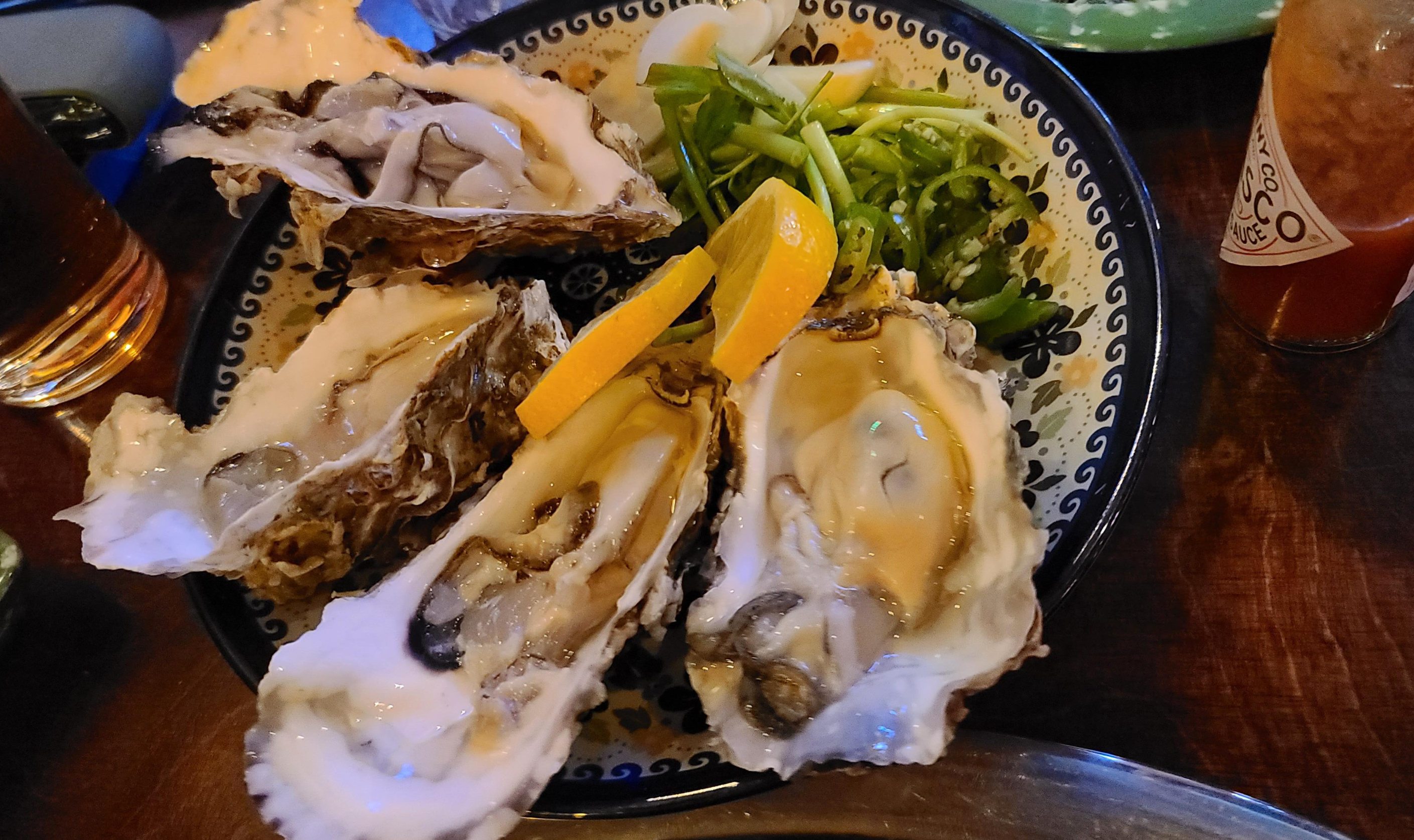 뒤를 이어 에피타이저인 삼배채굴, 스텔라마리스가 나왔습니다. 삼바리에서는 특이하게 레몬, 미나리, 마늘, 고추 그리고 핫소스까지 곁들여 먹도록 같이 주는 것이 보입니다. 역시 취향은 다양하니 여러 취향을 고려하는 모습이 매우 인상적으로 느껴지게 됩니다.
