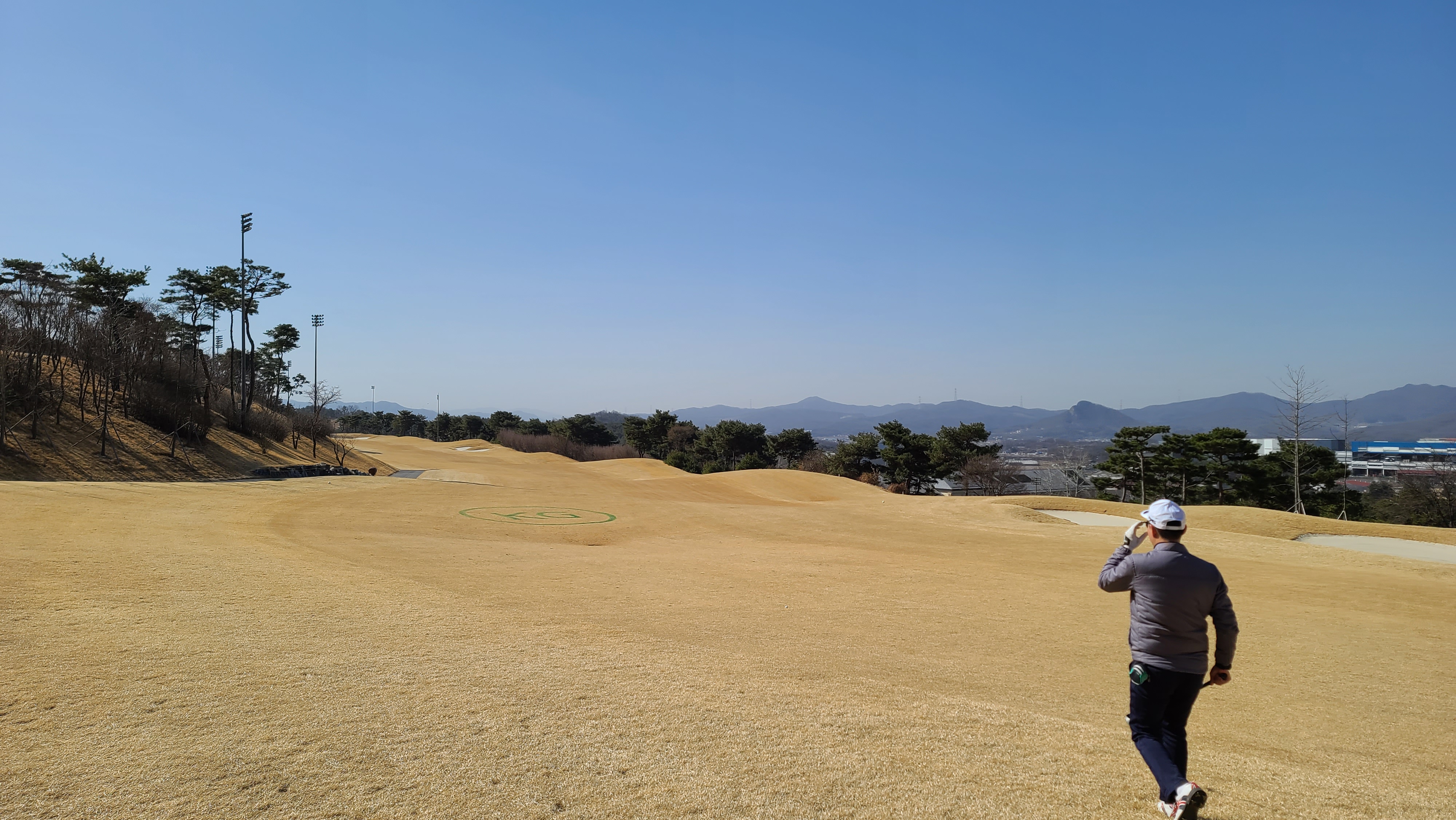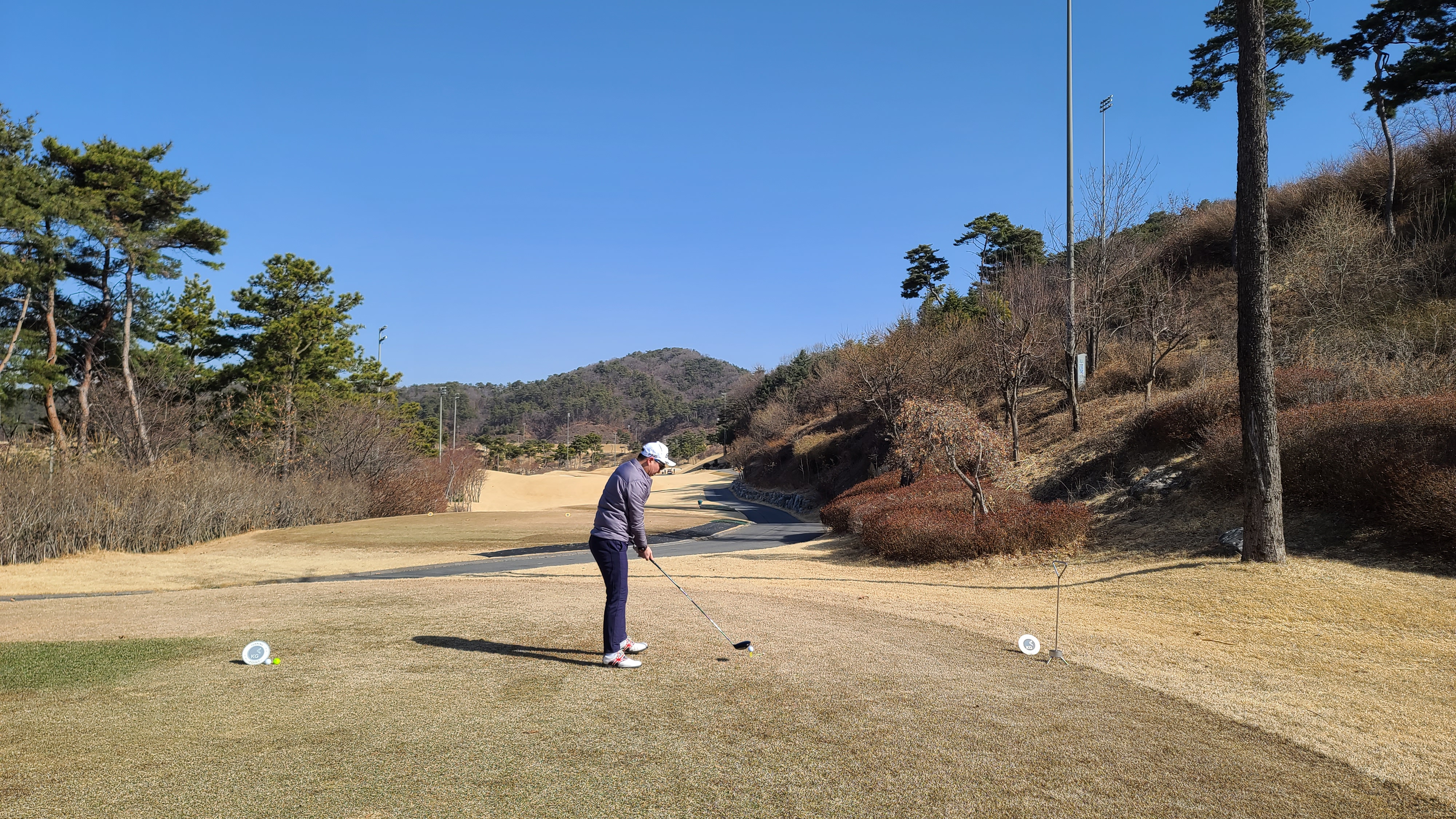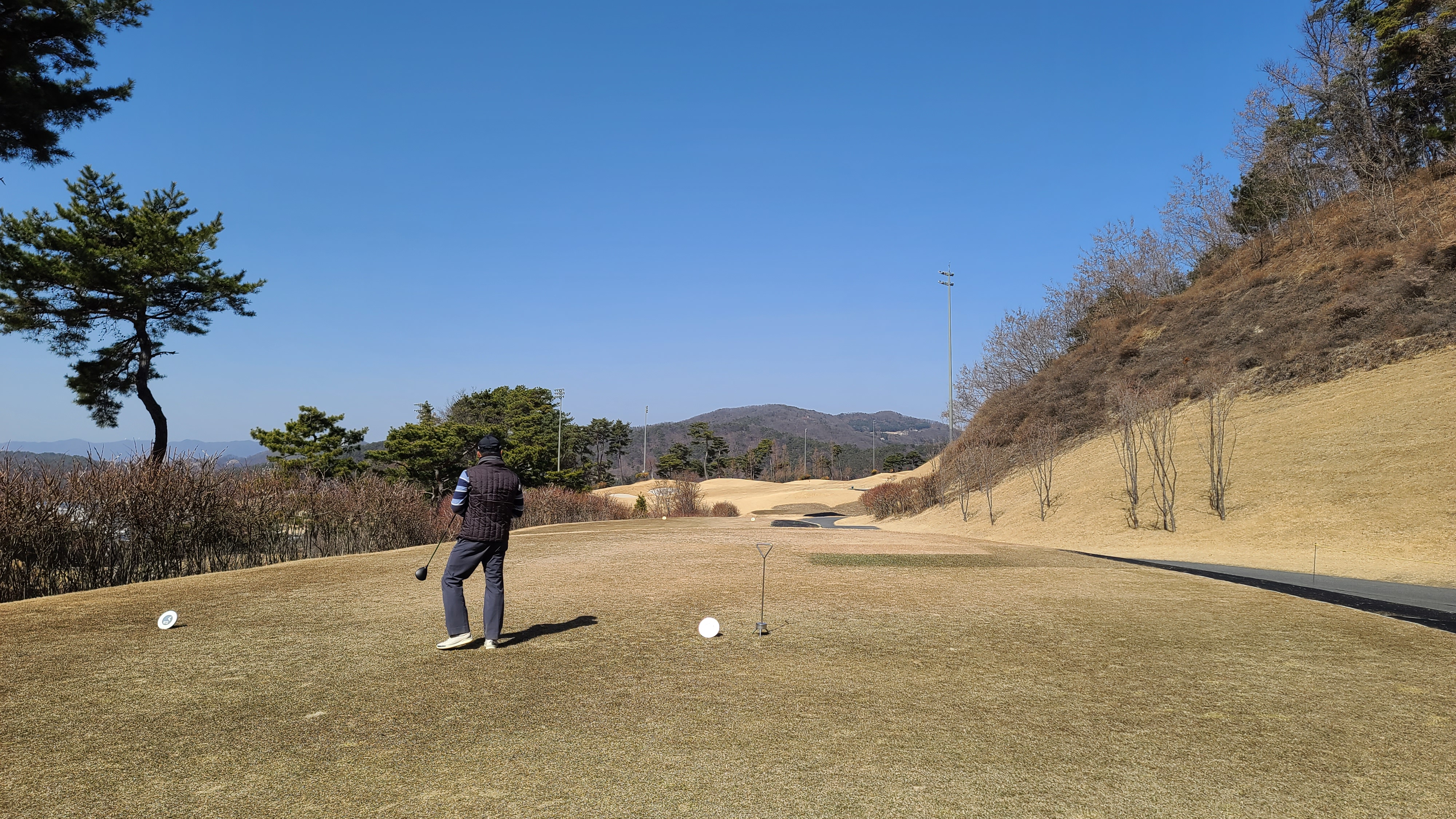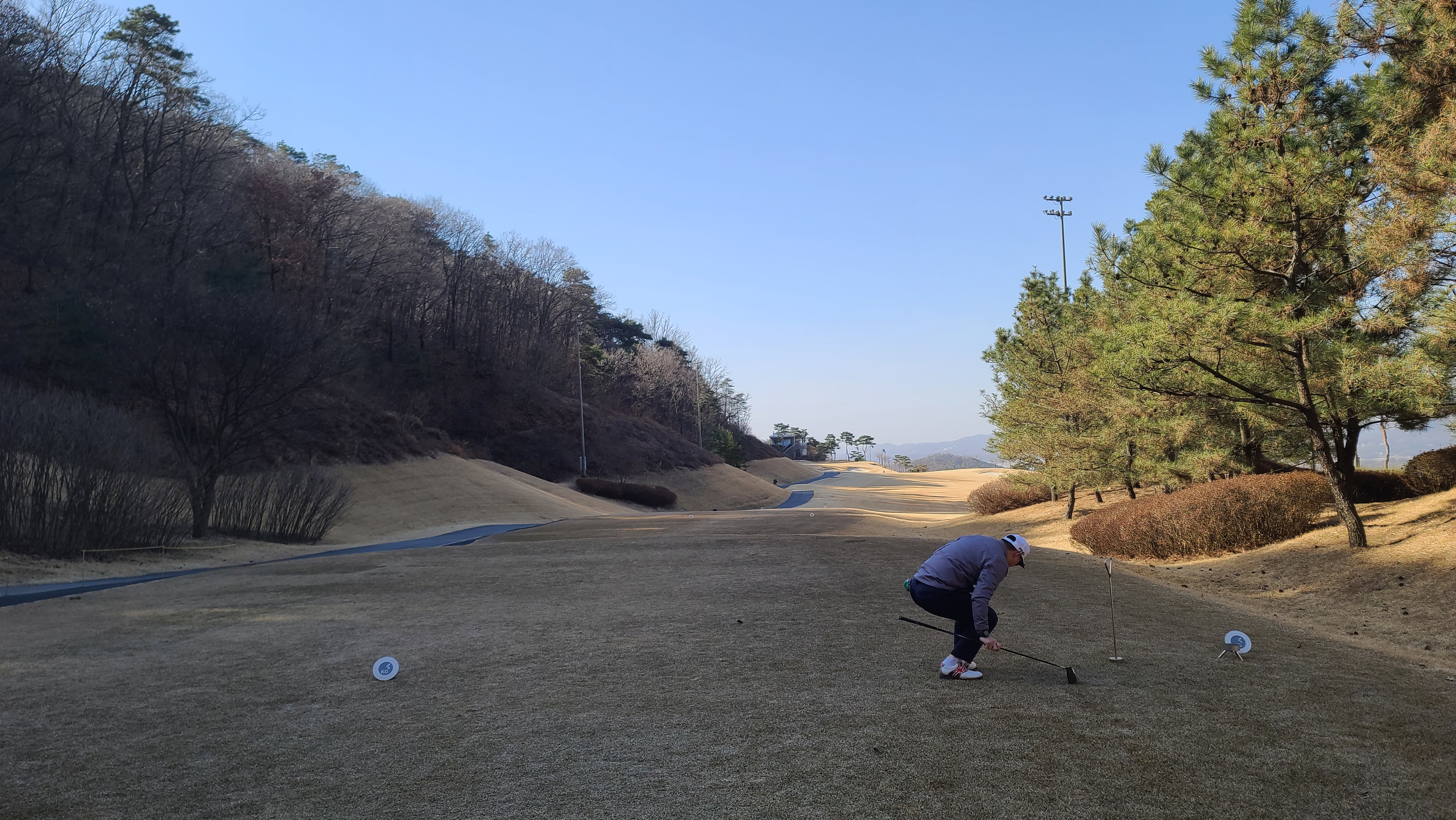 썬코스 1번 356m 거리의 파4홀입니다. 좌우 헤저드로 왼쪽의 경우 페어웨이 초입까지 내리막 언덕이 구성되어 있어 압박감을 느끼도록 설계되어 있습니다. 시야가 가려져 있어서 좁게 느껴질 수 있지만 오른쪽 나무 뒤쪽으로 공간이 있기 때문에 당겨치지만 않는다면 무난히 파세이브로 라운딩을 출발할 수가 있습니다.