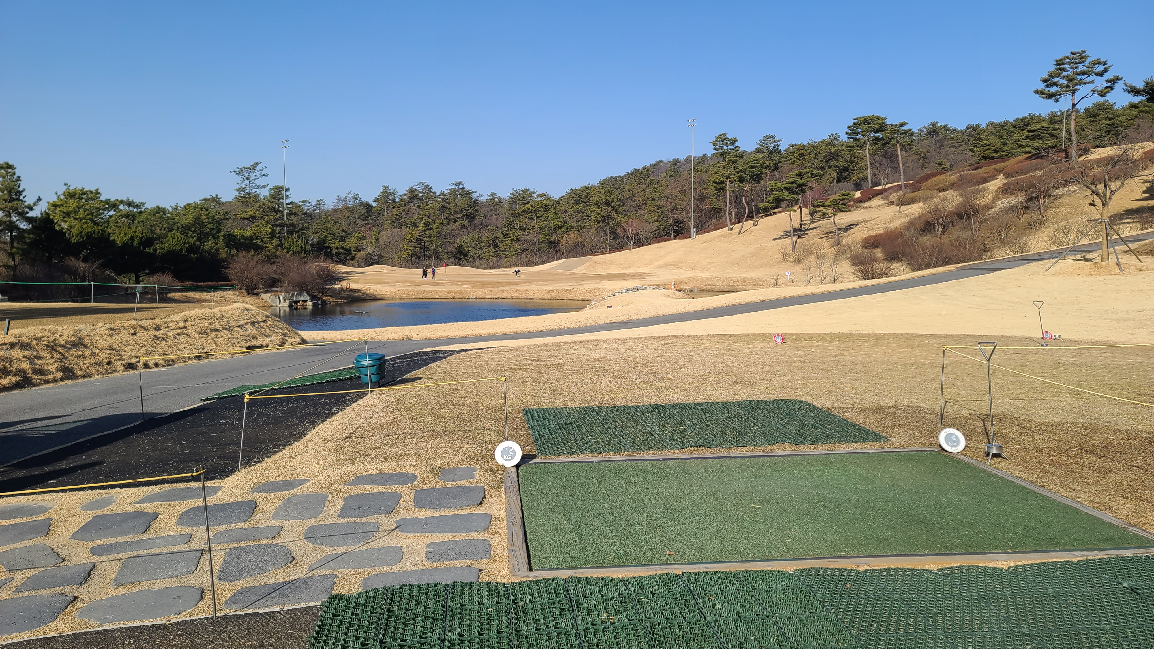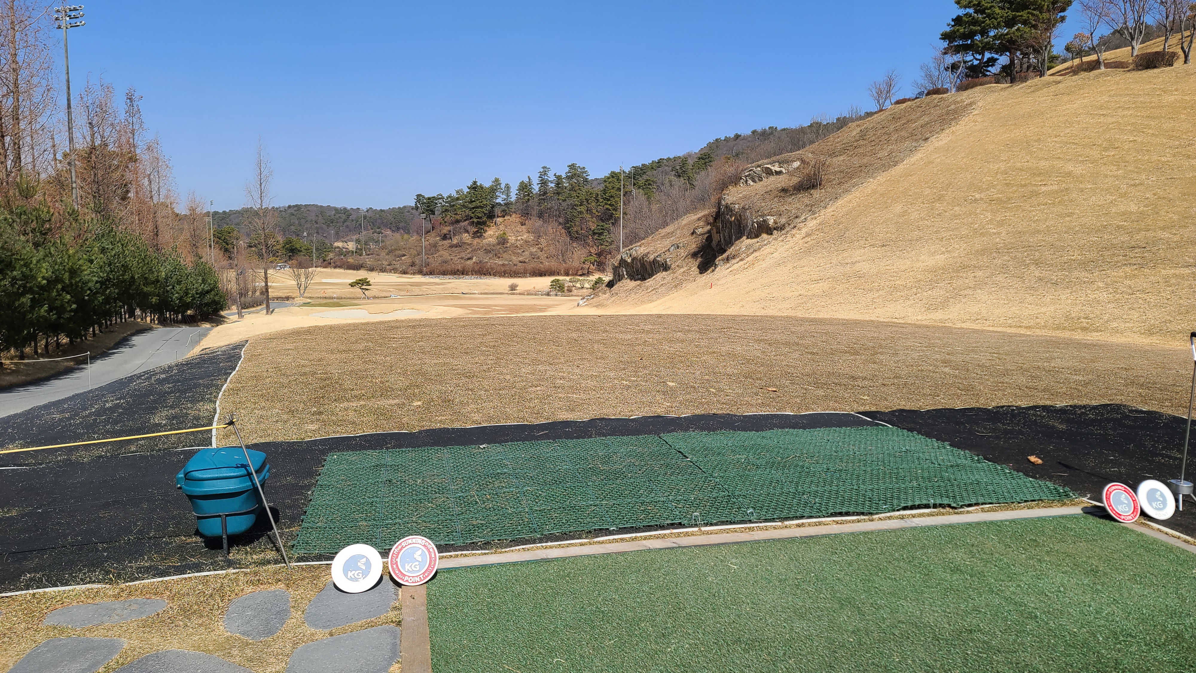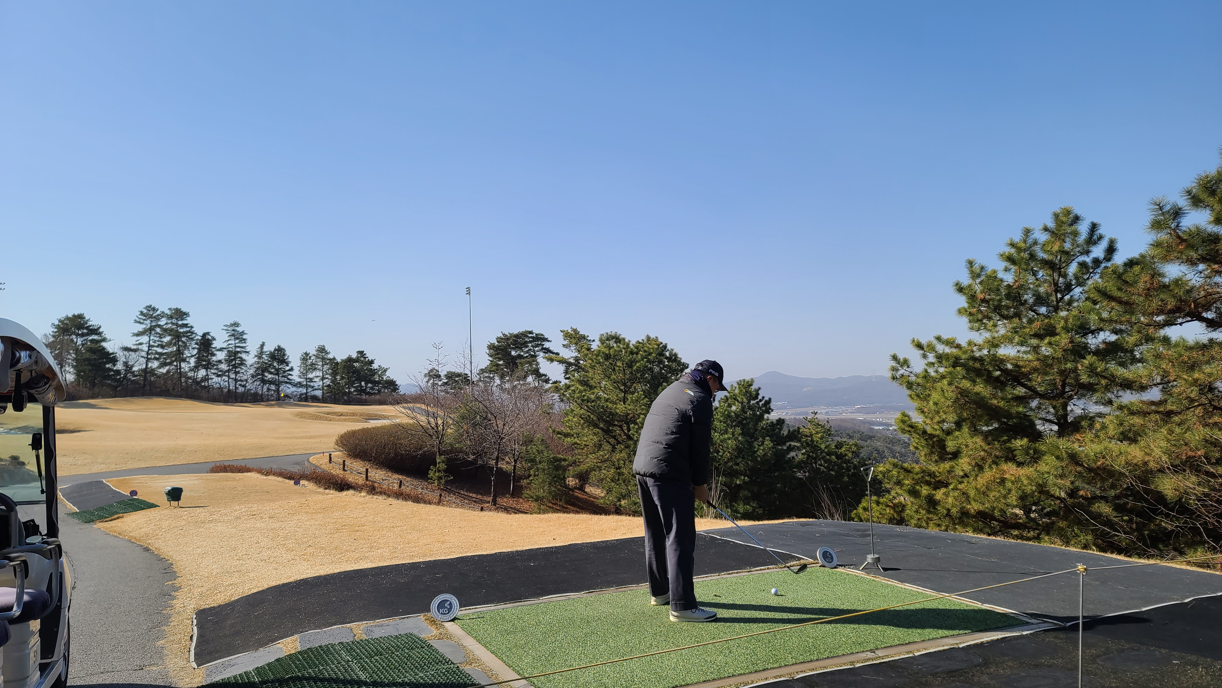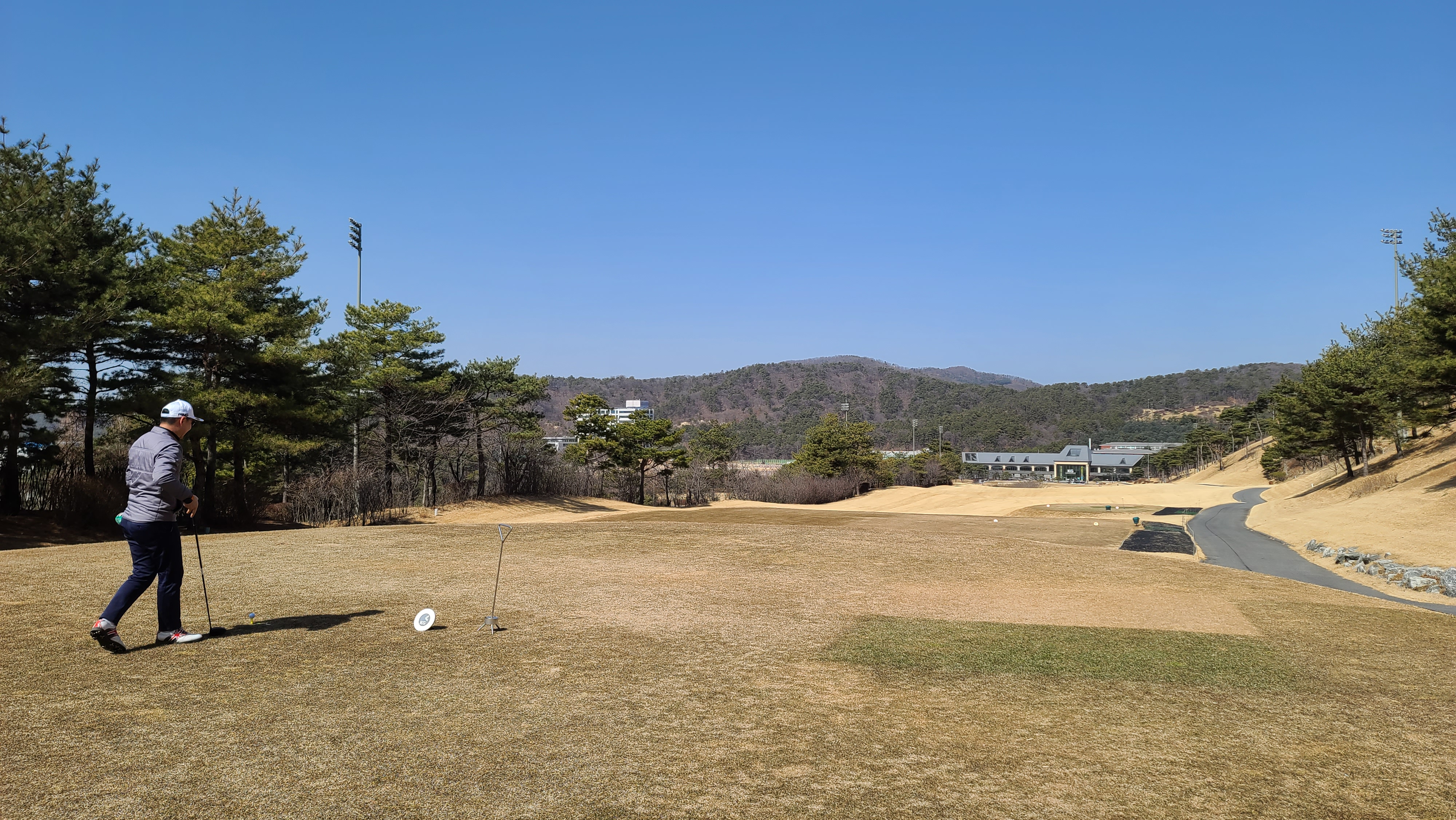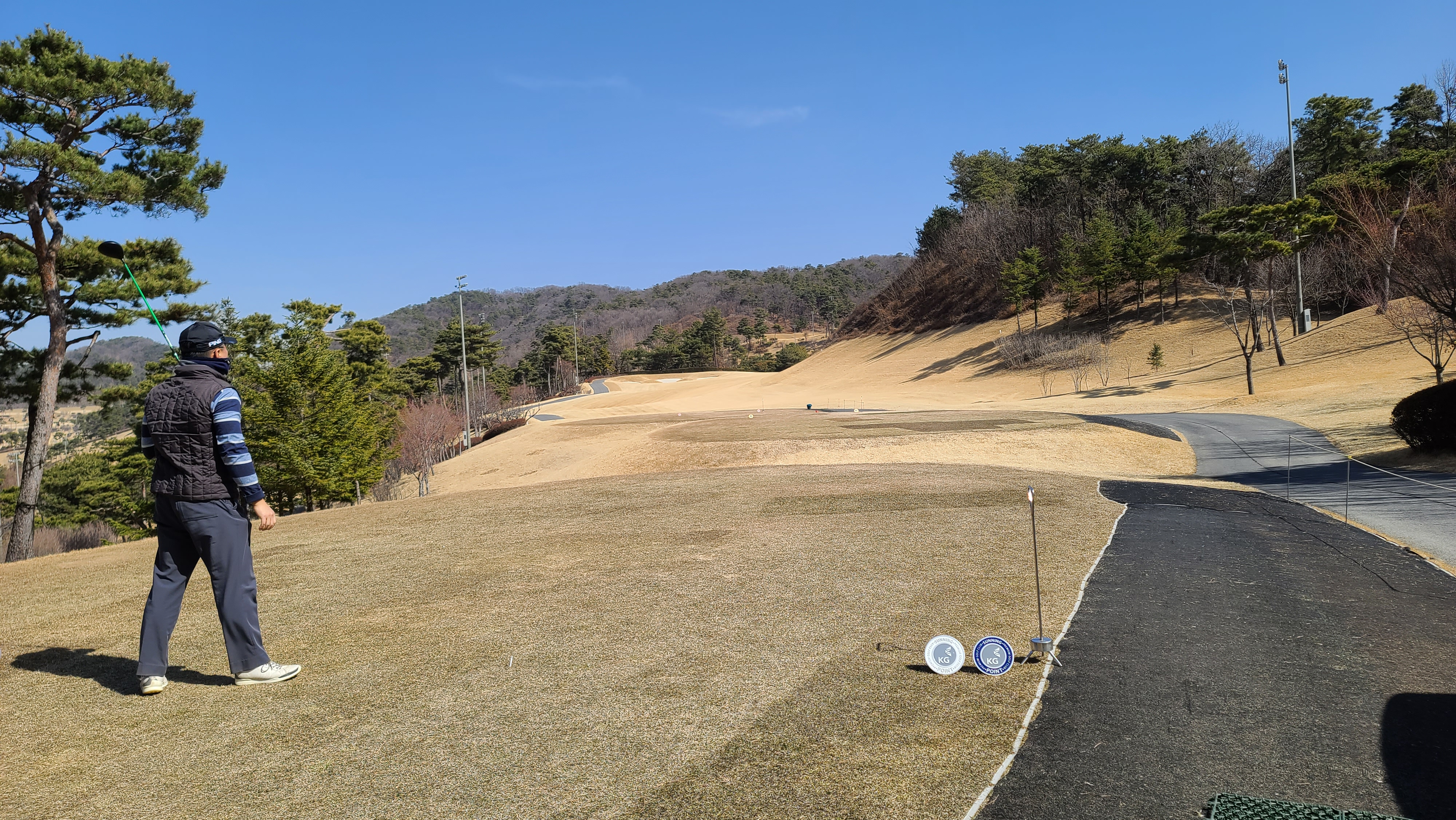 9번홀의 경우 KG ZONE 이벤트도 진행하고 있으며 티샷이 230m 거리에 있는 KG존에 들어가면 1인 그린피를 면제해주는 꽤 괜찮은 이벤트입니다. 회심의 티샷을 하고 주변으로 찾아가지만 아쉽게도 20m나 차이가 나는 것에 역시 비거리를 늘려야 하는구나 하고 느끼게 됩니다.