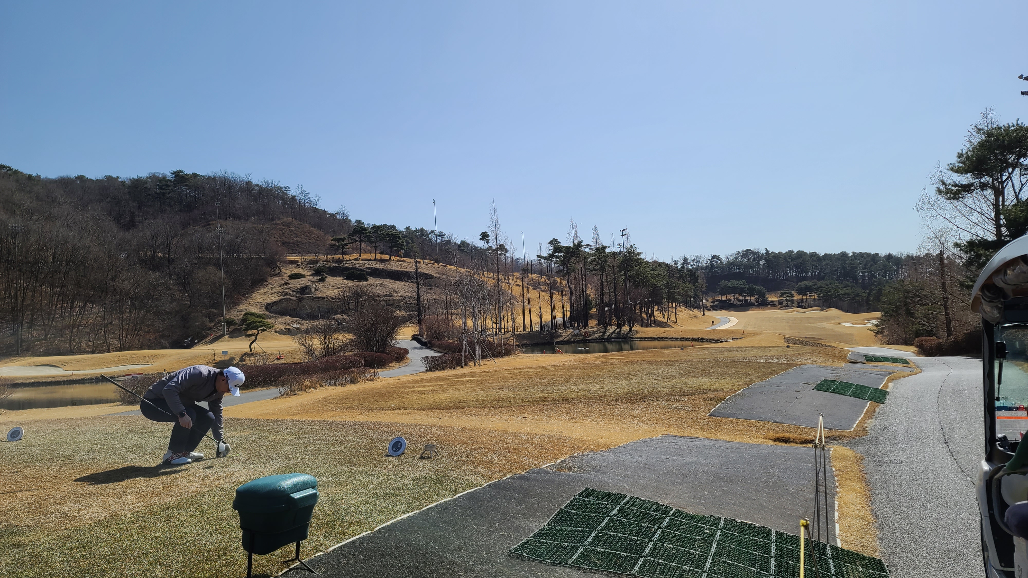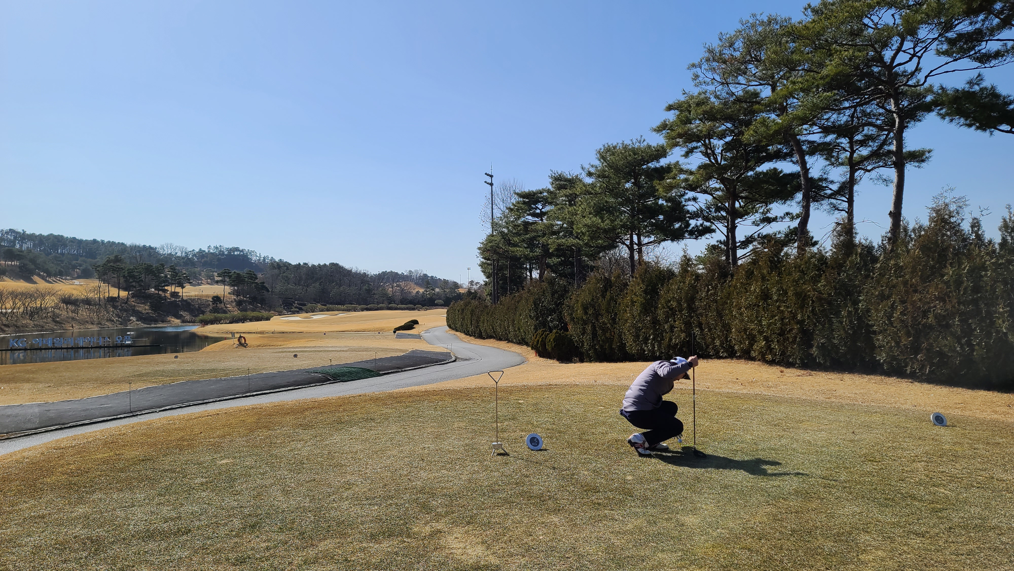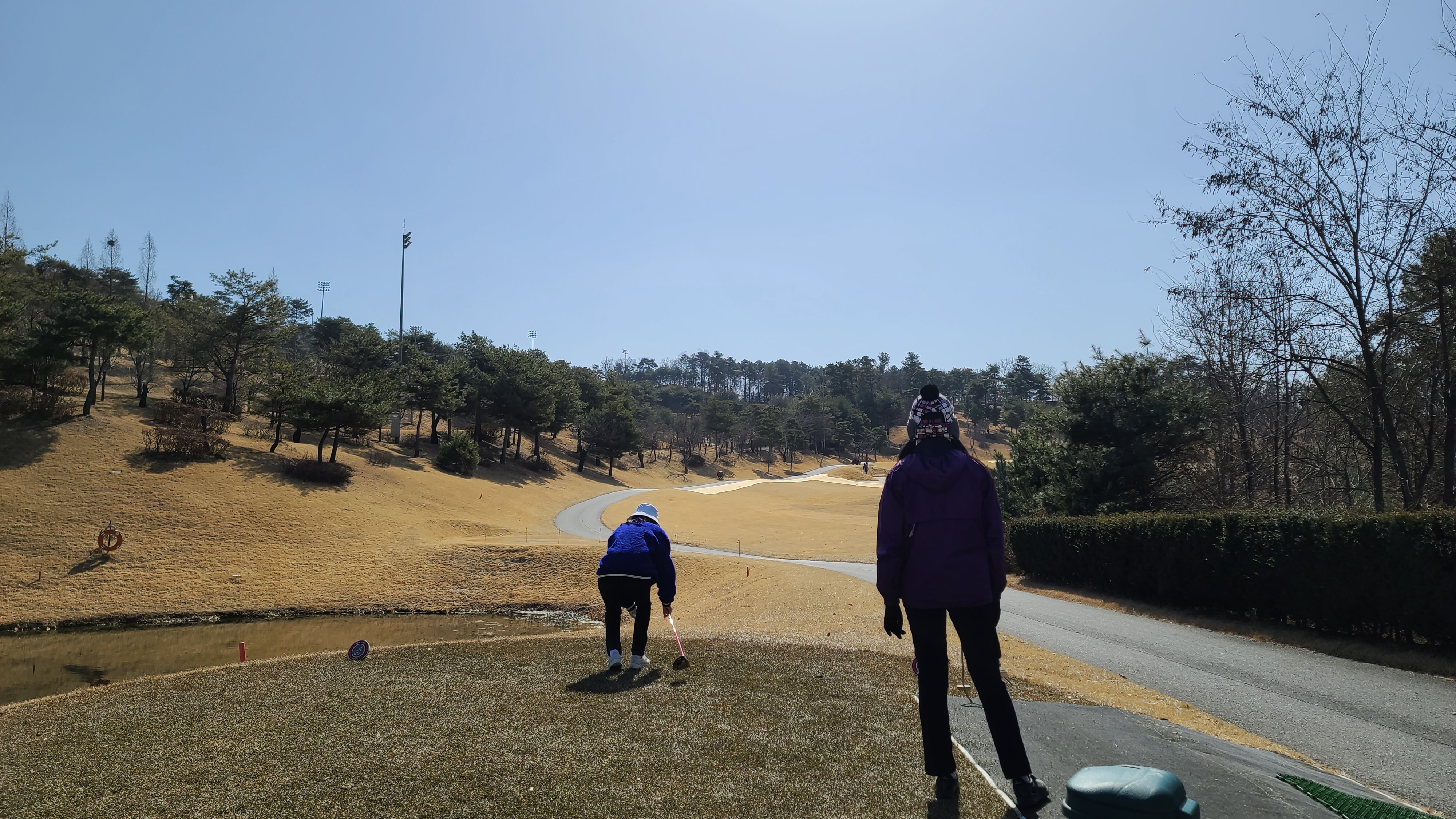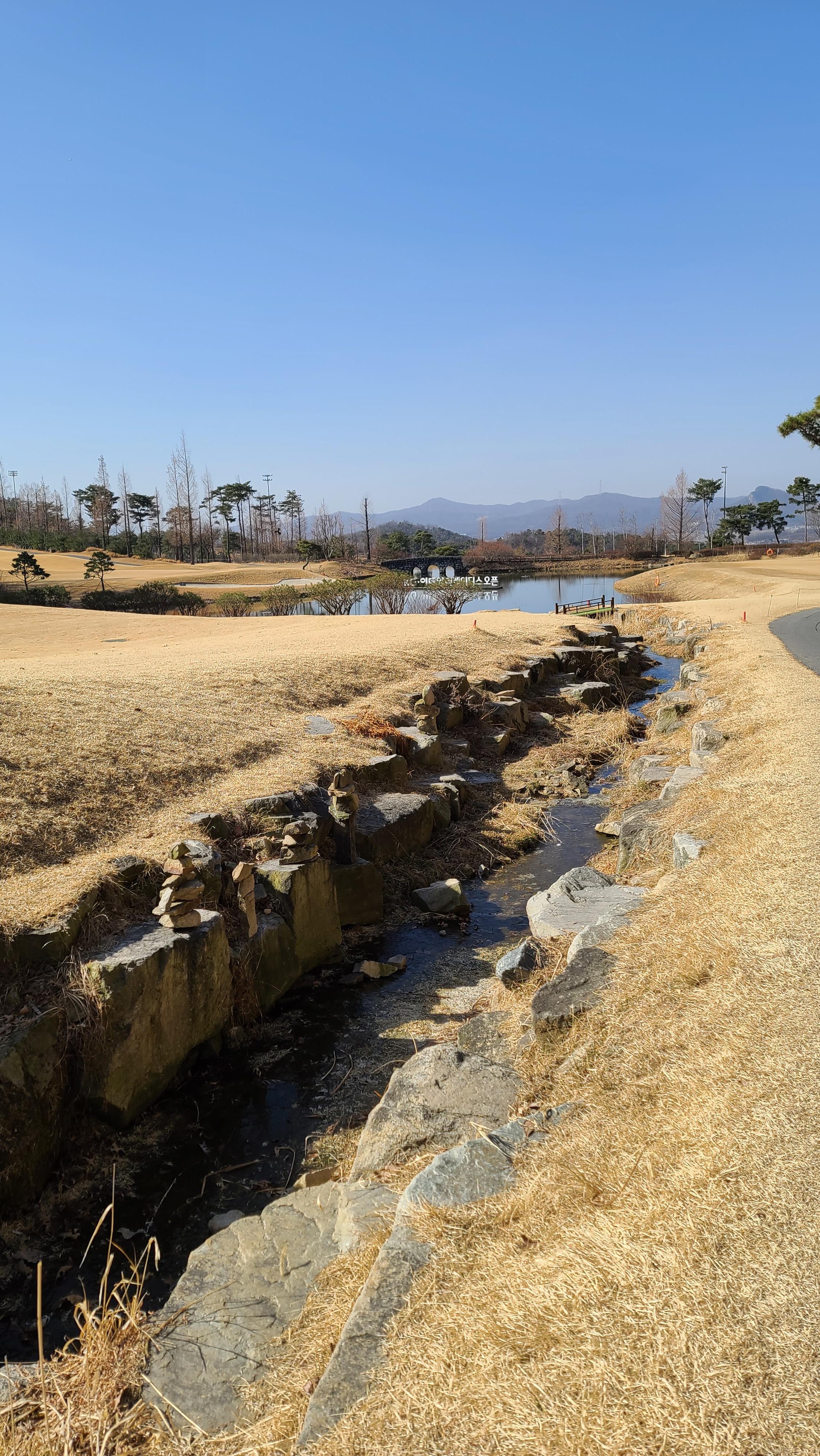 더욱이 카트도로 왼쪽으로는 사진과 같이 작은 개천형식의 워터 해저드가 자리잡고 있어서 티샷이 조금이라도 밀리는 경우 매우 고난스러운 코스가 될 수 있으므로 신중에 신중을 기해야 하는 홀입니다.