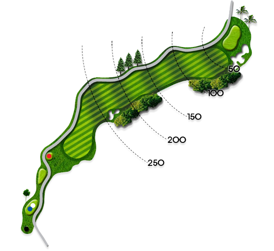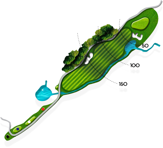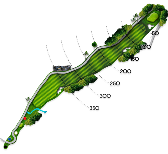 341m 거리의 파4홀로 일자형이지만 티샷지역에서 양쪽에 나무로 시야를 가리기 때문에 무척 좁아보이는 특성을 지닌 홀입니다. 뒤쪽으로 넓은 그린이 있으니 과감하게 티샷을 하고 세컨샷 지점은 비교적 짧게 느껴지도록 강조를 해놓은 구성으로 거리를 신중히 재고 플레이하는 것이 중요합니다.