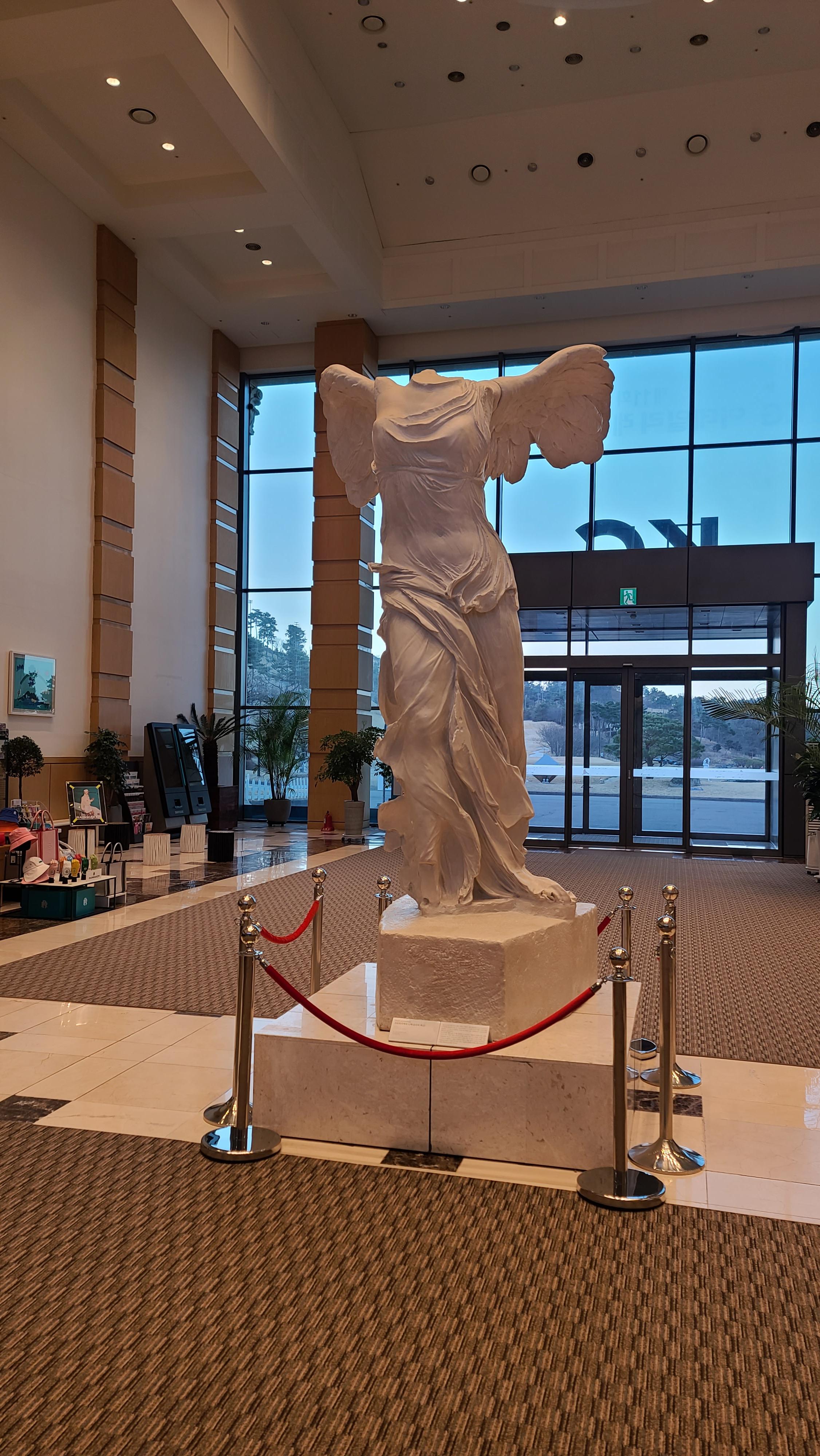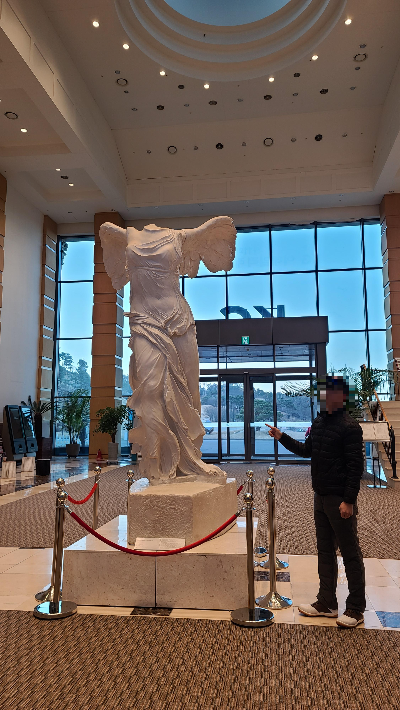 클럽하우스 안으로 들어가니 그리스,로마신화에서 승리의 여신의 상징인 니케의 동상이 세워져 있는 것이 매우 클래식한 분위기를 자아내고 있습니다. 첫눈에 시선을 사로잡는 조형물들과 인테리어의 조화를 보니 방문객들과 대회를 위해서 신경을 많이 쓴 모습을 볼 수가 있습니다.