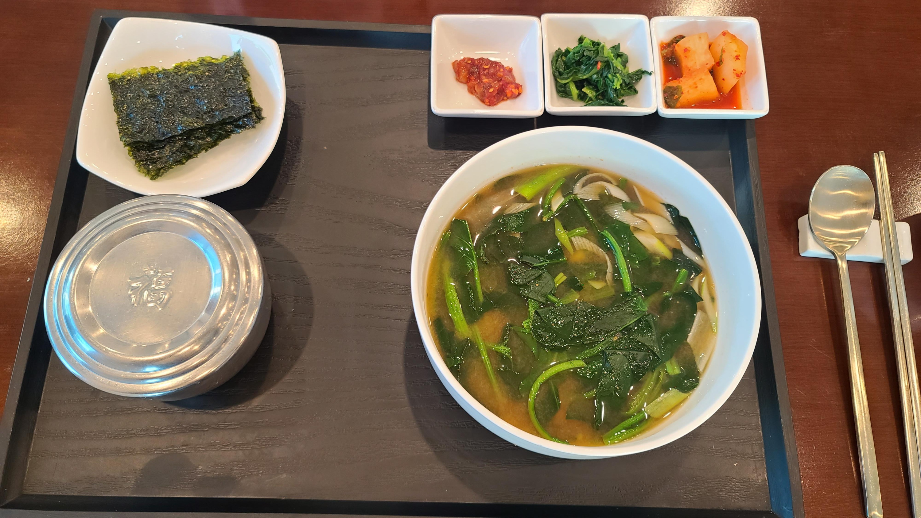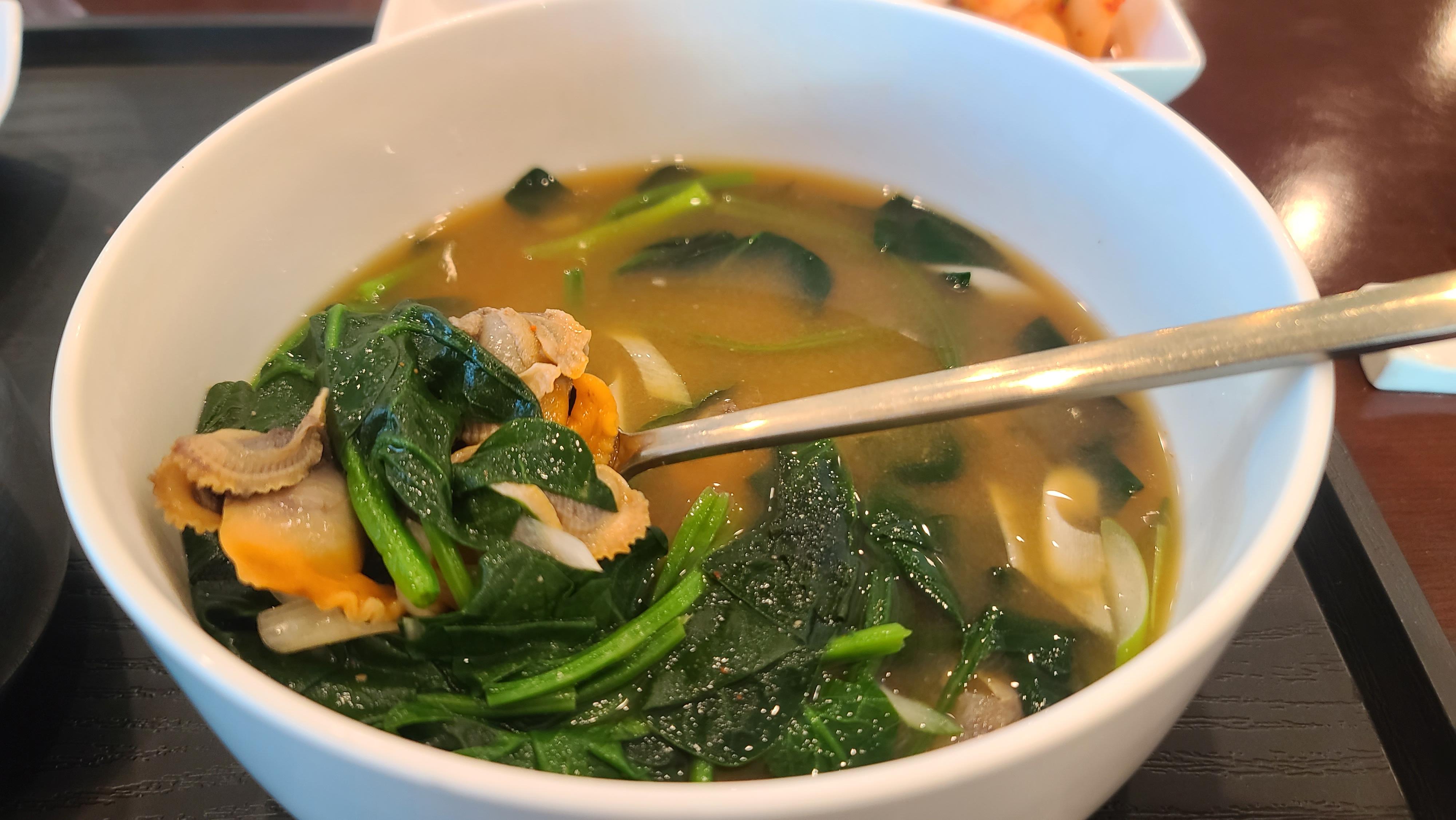 여러메뉴중 가장 토속적인 시금치 된장국을 선택해서 먹기로 합니다. 내용물을 확인하니 거대한 피꼬막도 들어가있는 된장국으로 밥과 김치 그리고 오징어젓과 함께 국물을 먹으니 정말로 맛있게 느껴지며 저절로 영양보충이 되는 기분입니다.