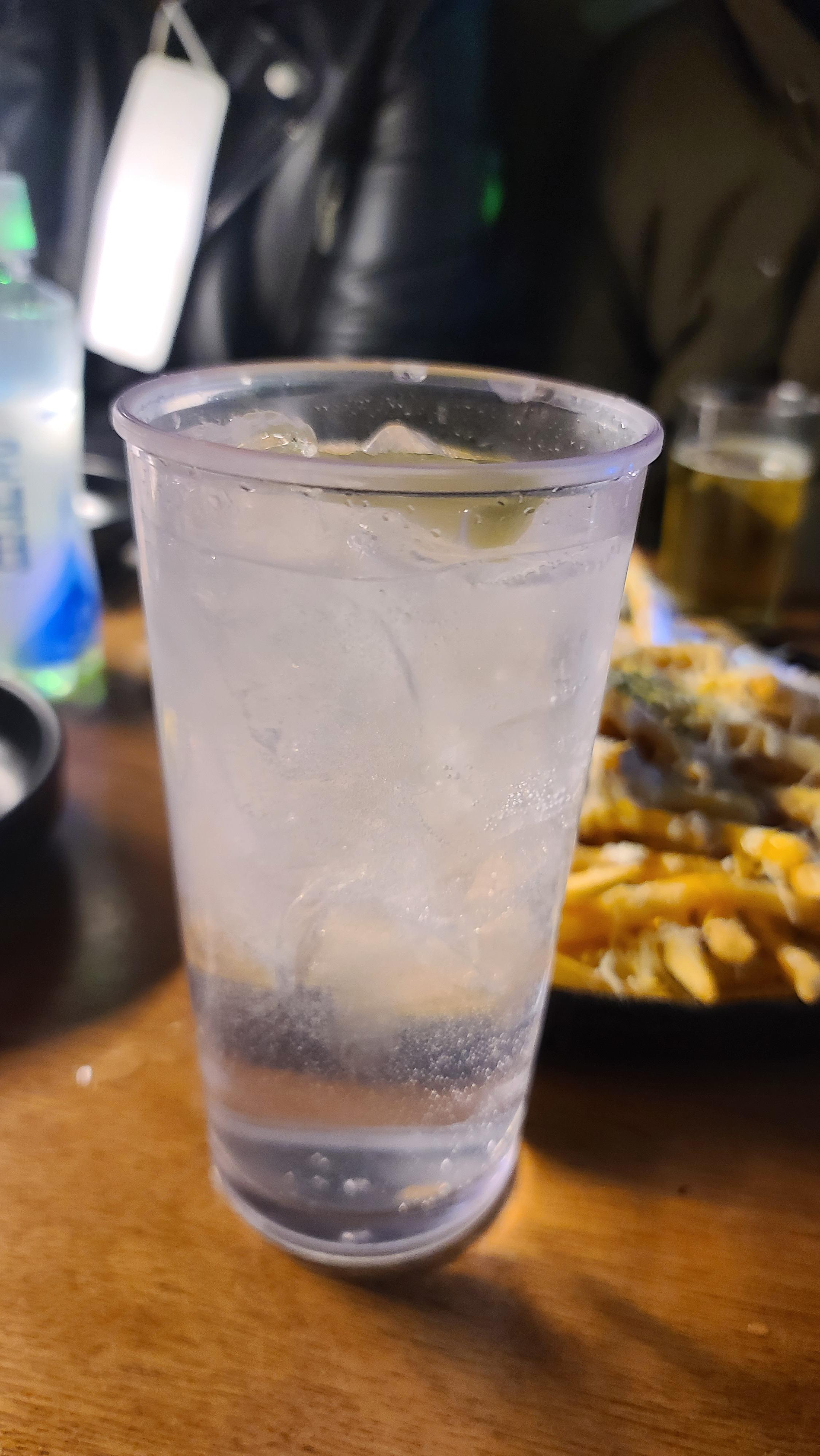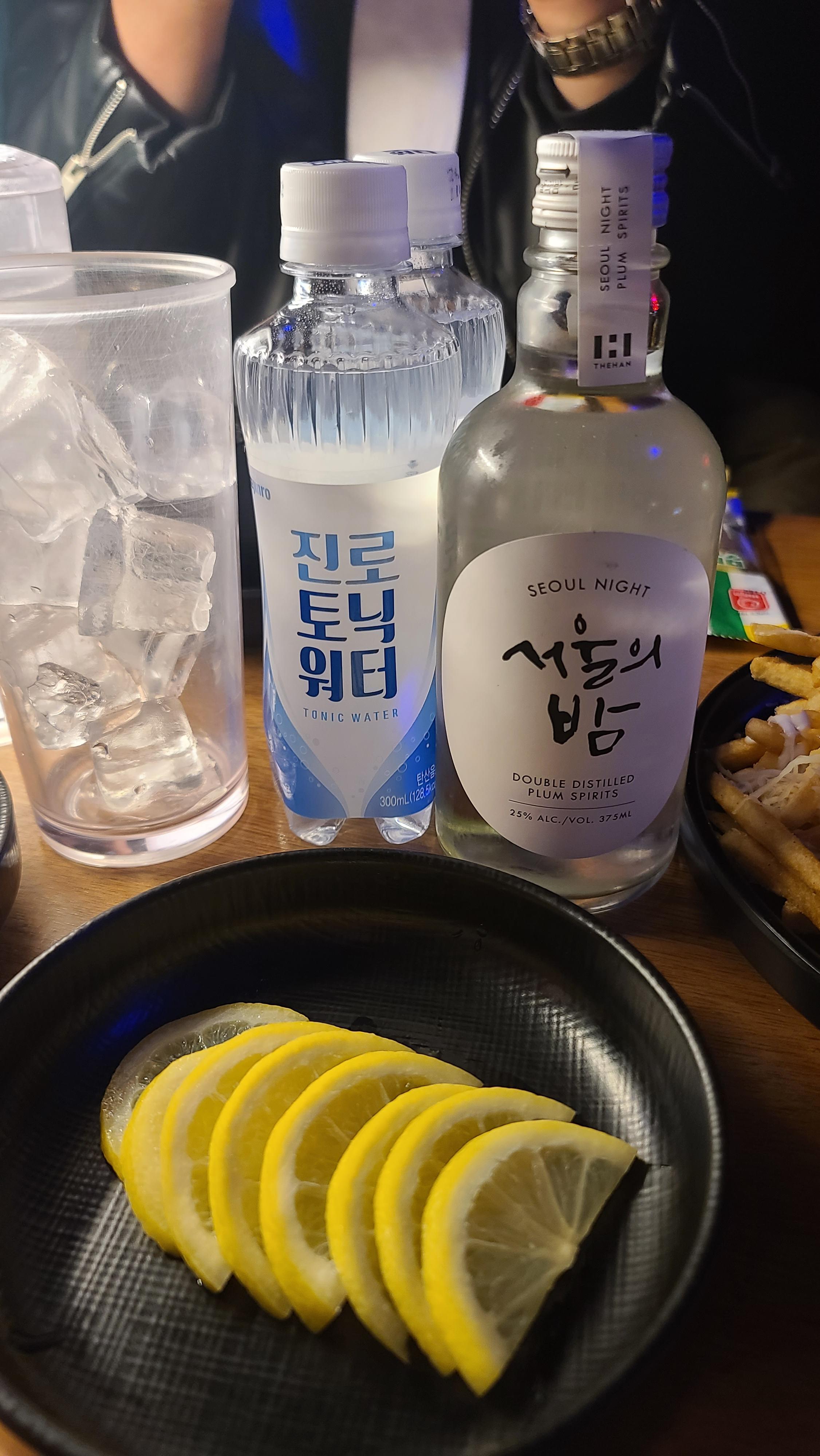 맥주와 함께 주문한 하이볼의 모습입니다. 소주와 토닉워터, 레몬을 따로 주시고 취향에 따라 알맞은 비율로 타서 먹도록 구성되어 있는 세트입니다. 하이볼을 내 취향에 맞게 직접 타서 먹을 수 있고 레몬도 듬뿍 주셔서 다양한 취향을 반영할 수 있어서 무척 좋은 것 같습니다.