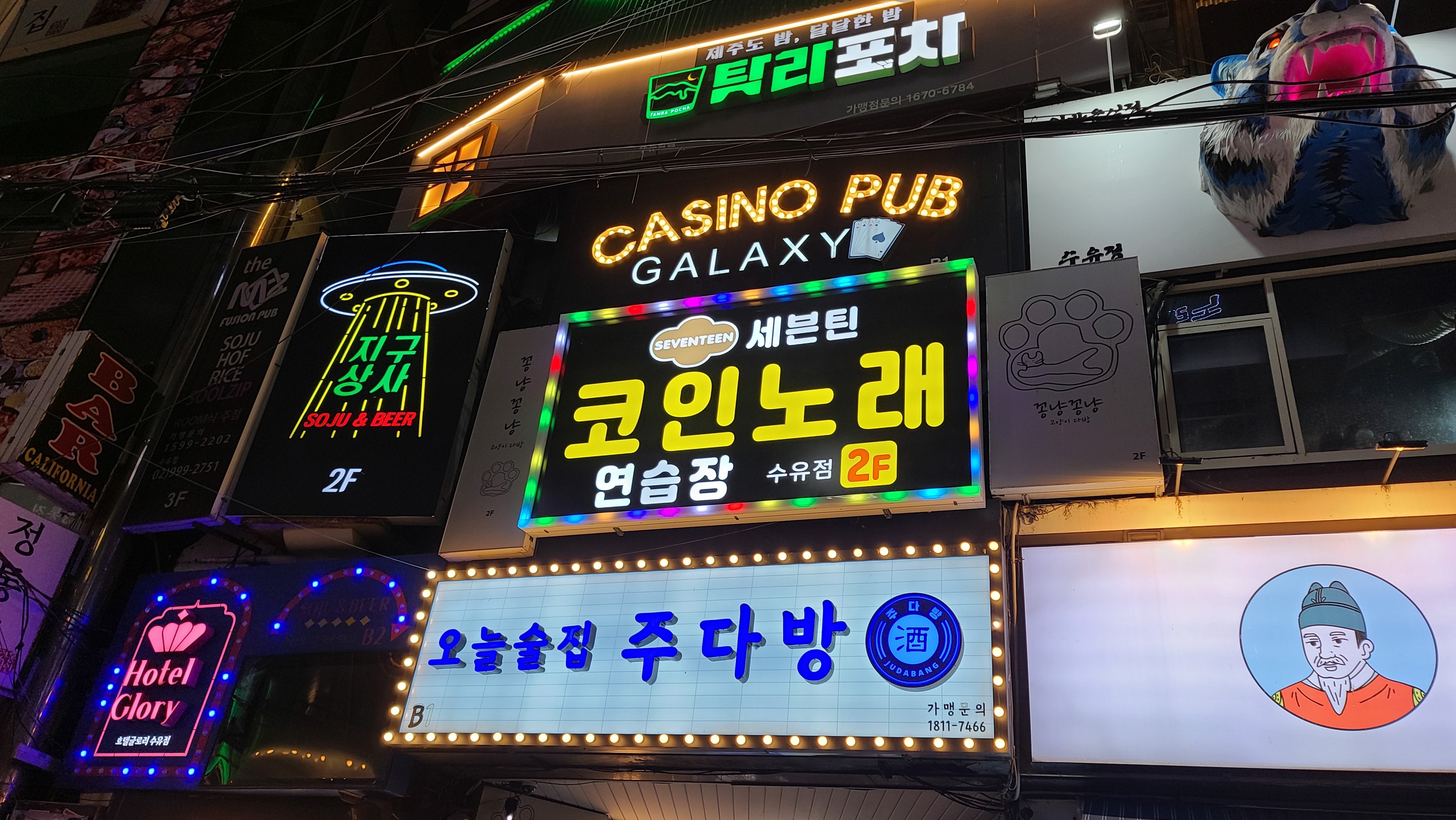 건물에 입점한 술집들을 살펴보니 오늘술집 주다방, 탐라포차, 범맥주, 지구상사 헌팅포차이자 청춘포차로 유명한 체인점 술집들이 나란히 입점해있고 그외에도 카지노펍, 호텔글로리 등 다양한 컨셉의 술집들이 밀집해 있는 것을 볼 수가 있습니다. 수유에서 가장 물이 좋은 곳으로 어디를 들어가도 평타이상은 하기 때문에 일단 건물에 들어가서 분위기를 보기로 합니다.