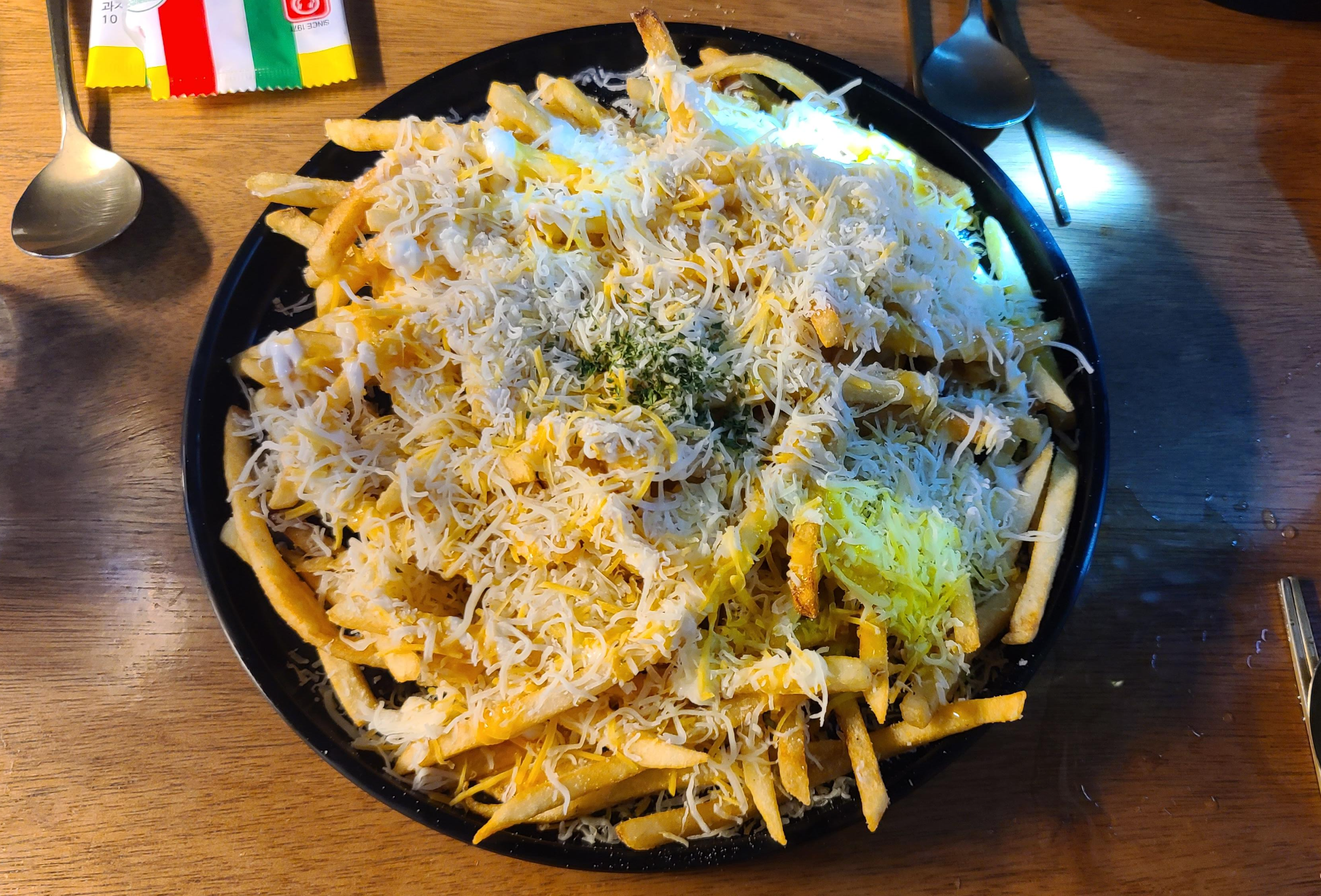 즐거운 분위기에 몸을 맏기며 잠시 기다리자 주문한 눈꽃치즈 감자튀김이 나왔습니다. 소맥안주로 최고인 감자튀김에 치즈까지 올려진 아름다운 자태를 보니 식욕이 당겨서 계속적으로 소맥을 마시게 됩니다. 조미료와 감미료 맛이 듬뿍 느껴지는 상당히 술안주로 좋은 구성입니다.