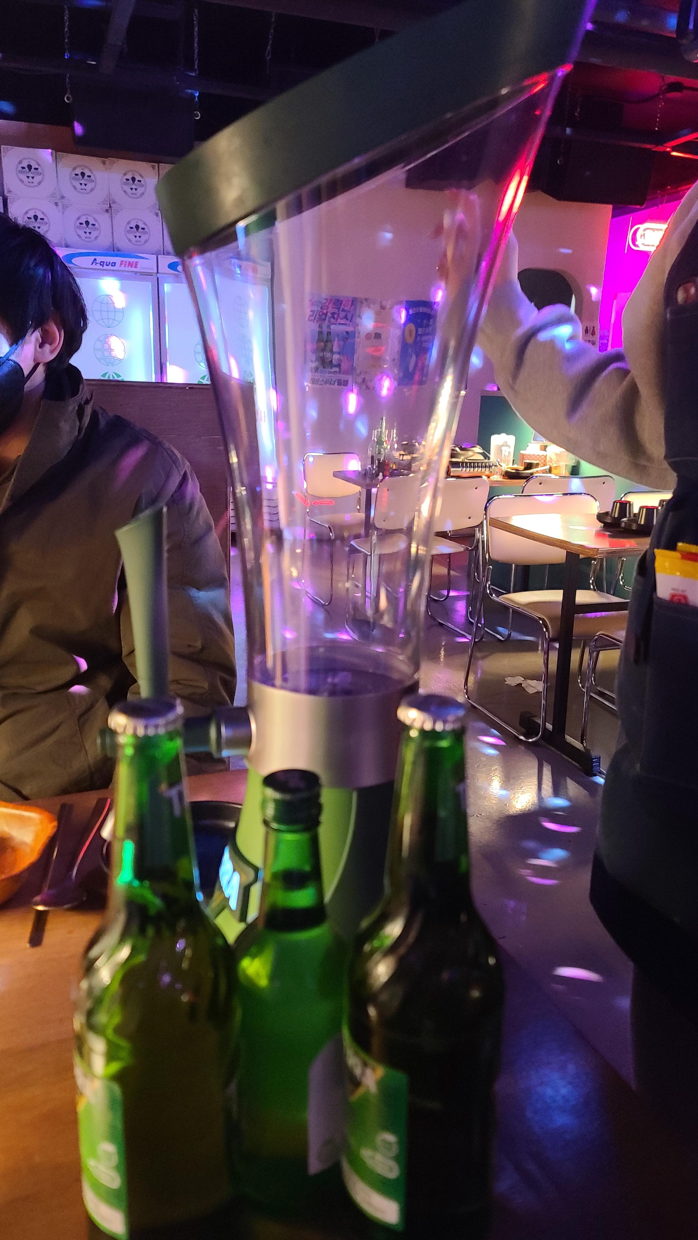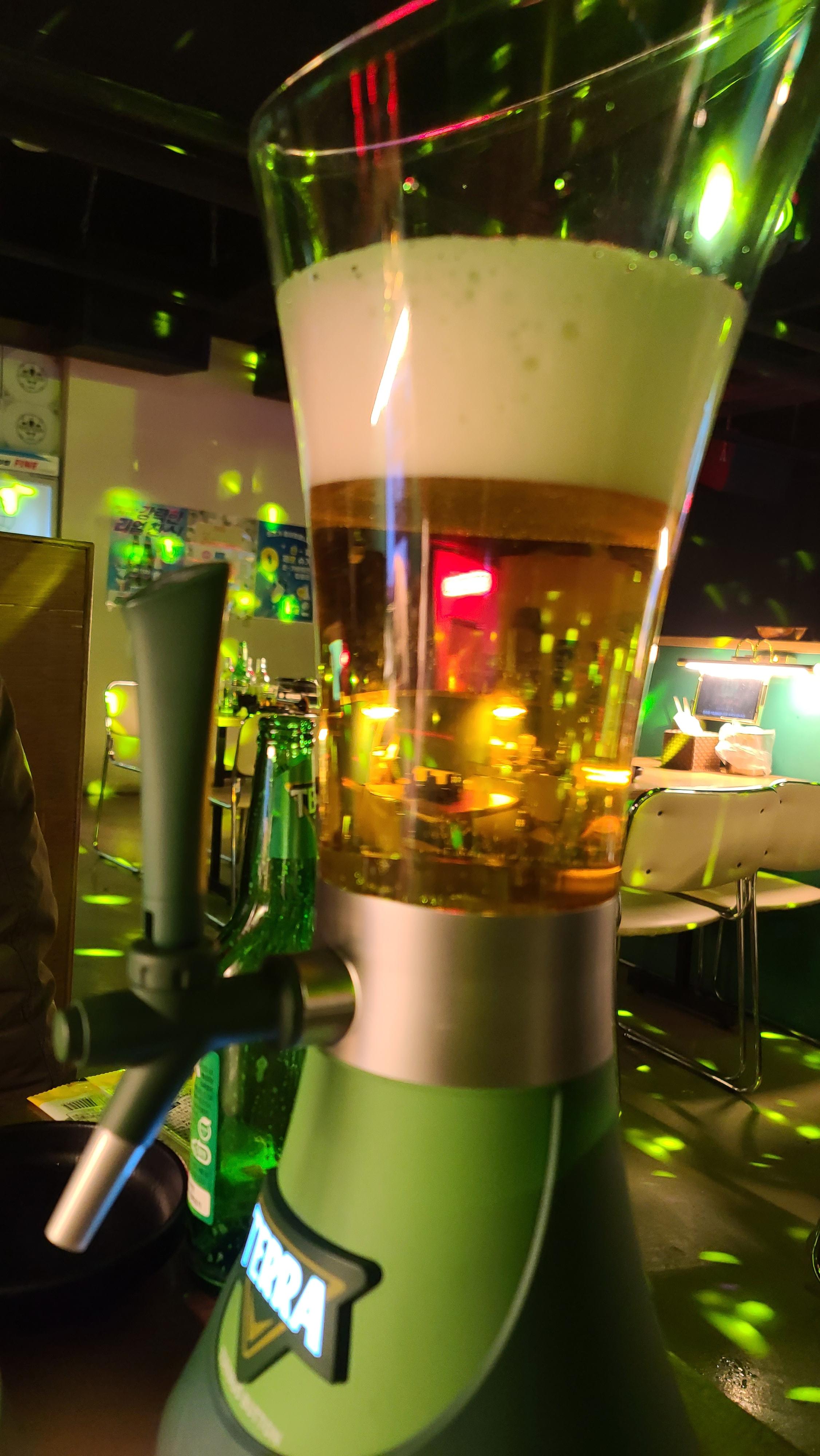 직원분께서 소맥타워를 정성스럽게 설명해주시고 제조를 하는 모습을 담아봅니다. 소맥을 타워에 붓고는 정면에 있는 테라버튼을 누르면 회오리가 생성되어 소맥을 자연스럽게 말아주는 디스펜서의 모습을 보니 진로하이트 마케팅 잘 하는 구나 하는 생각이 들게 됩니다.