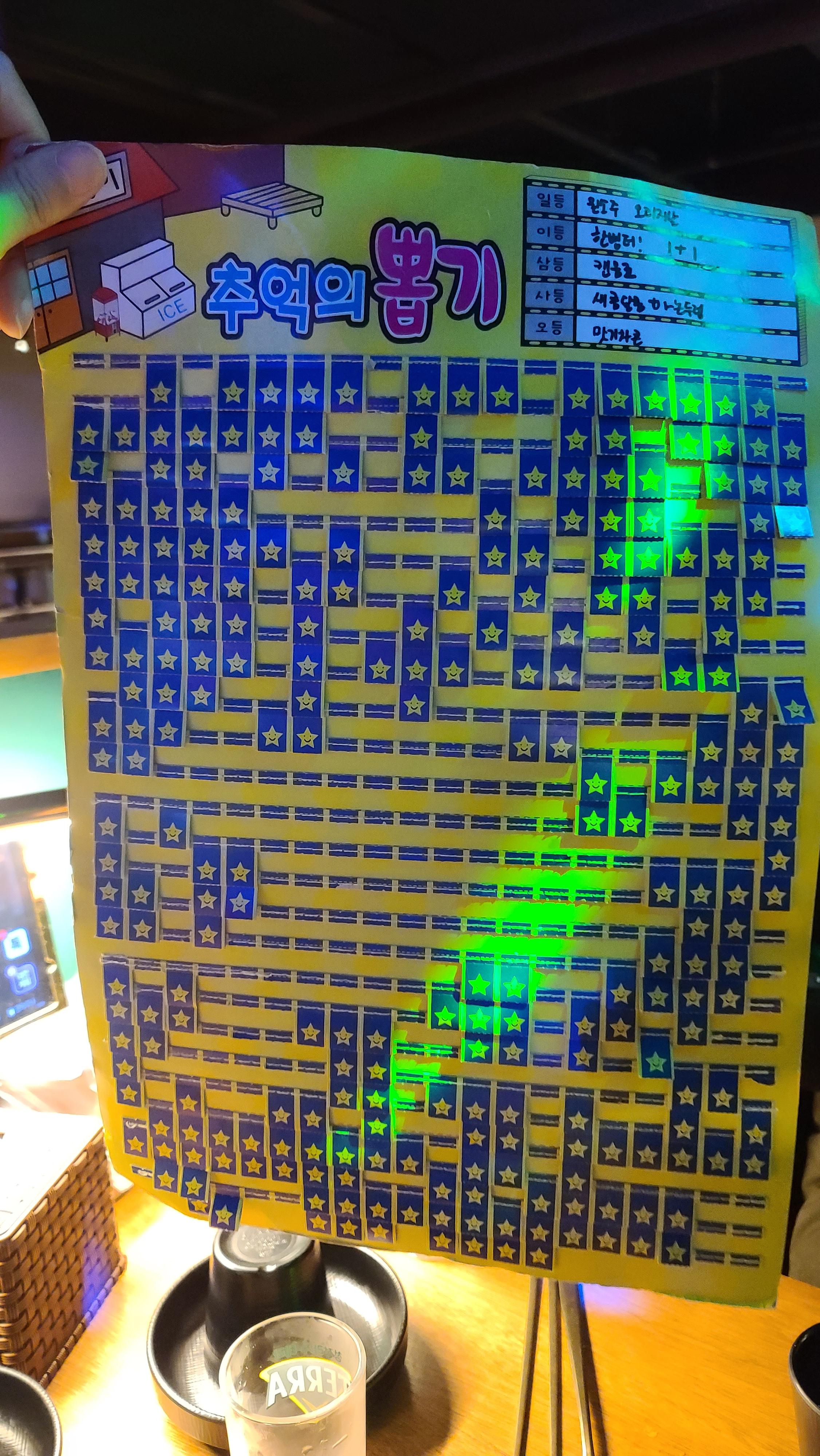 메뉴중 테라 소맥타워를 주문하자 거대한 소맥 디스펜서와 병으로된 소주, 맥주 그리고 직원분께서 추억의 뽑기를 뽑을 수 있는 기회를 주십니다. 원소주 오리지널 부터 쫀드기 까지 다양한 상품이 구성되어 있으며 재미있게 추억을 되살릴 수 있는 놀이가 아닐 수 없습니다.