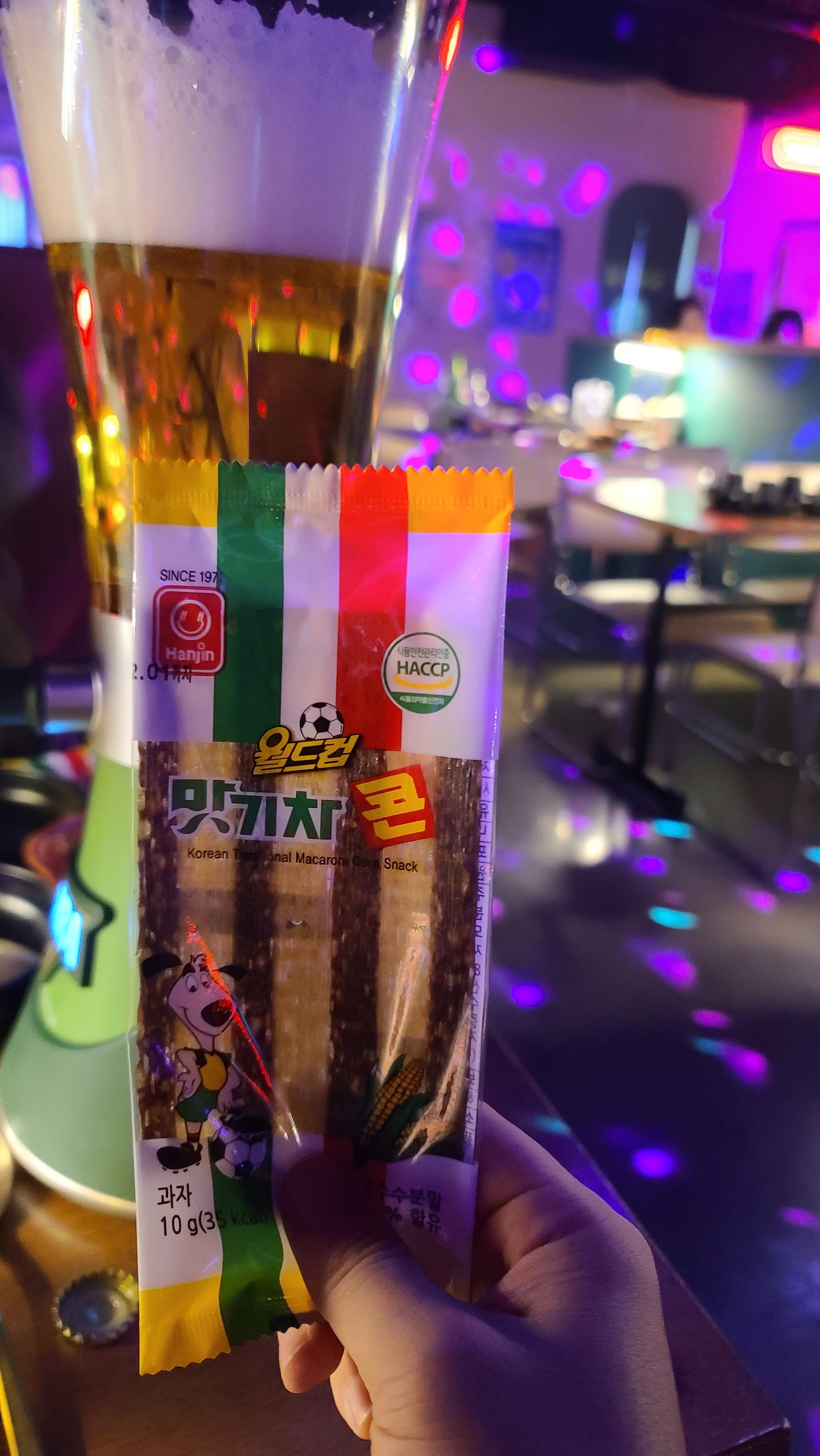 잘 말아진 소맥과 상품으로 받은 쫀드기 맛기차콘 인증샷을 남기고 맛을 보면서 흥겨운 분위기를 계속적으로 즐겨봅니다. 음악소리도 선곡도 최신곡으로 적당하고 사람들이 북적이는 분위기도 좋고 상당히 재미있게 느껴지고 있습니다.