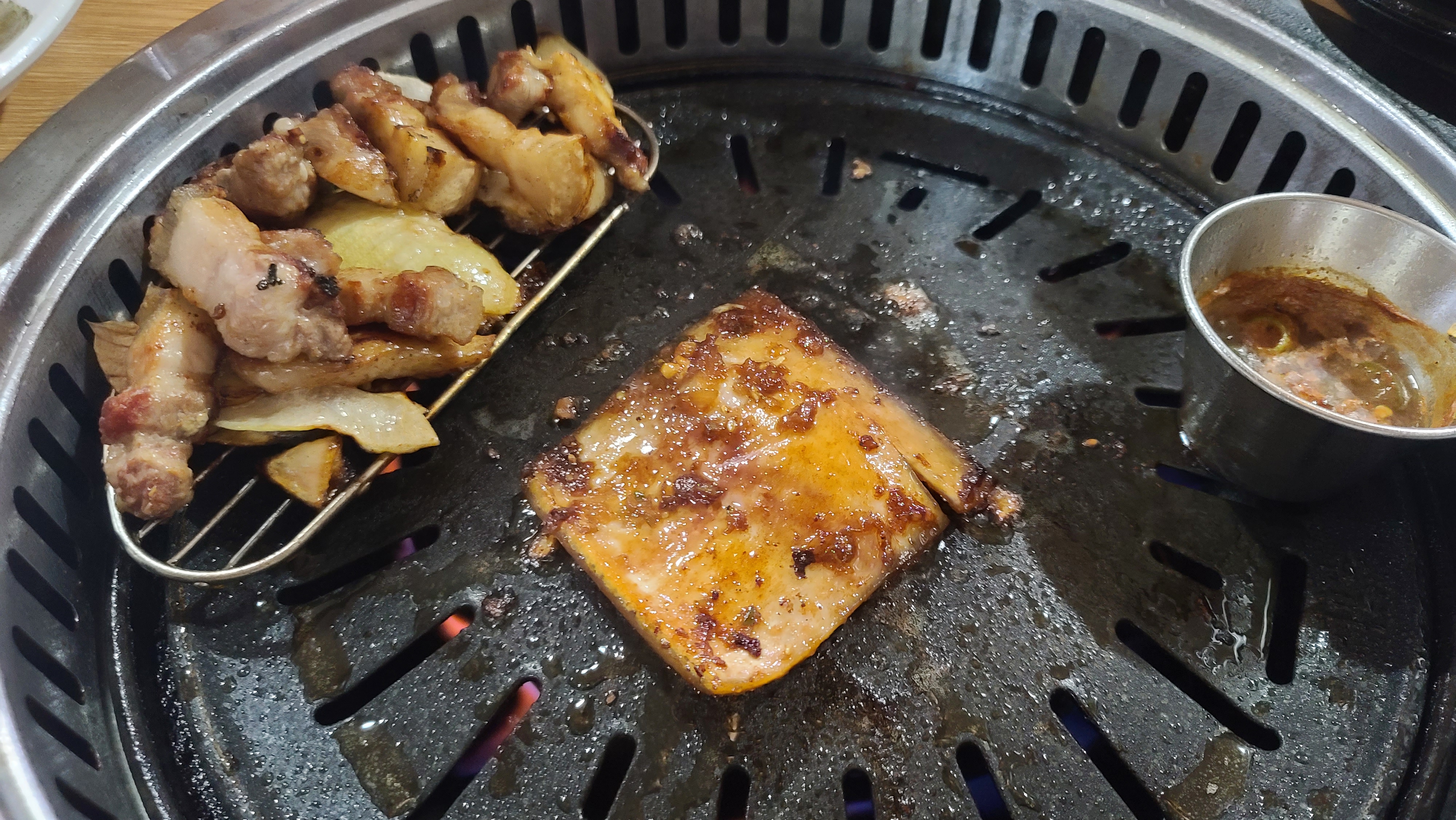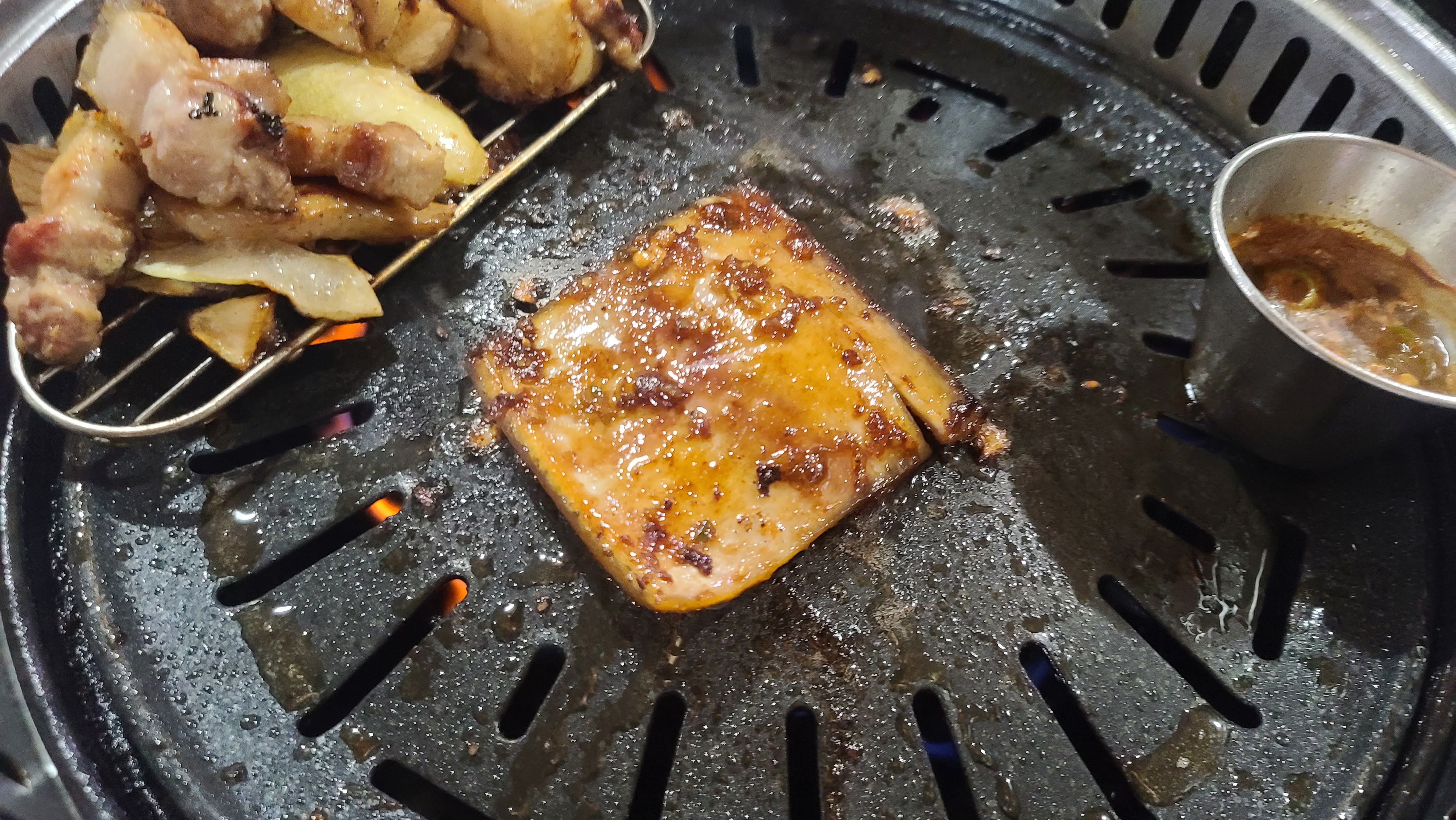 고기를 알맞게 먹고 아까 눈여겨 봐두었던 껍데기를 덜어와 구워봅니다. 껍데기위에 온갖 양념들이 불과 함께 타면서 맛있는 냄새를 전해주고 있습니다. 양념이 저렇게 건더기가 클정도로 듬뿍있는것을 보면 상당히 맛있을것 같다는 생각을 하게 됩니다.