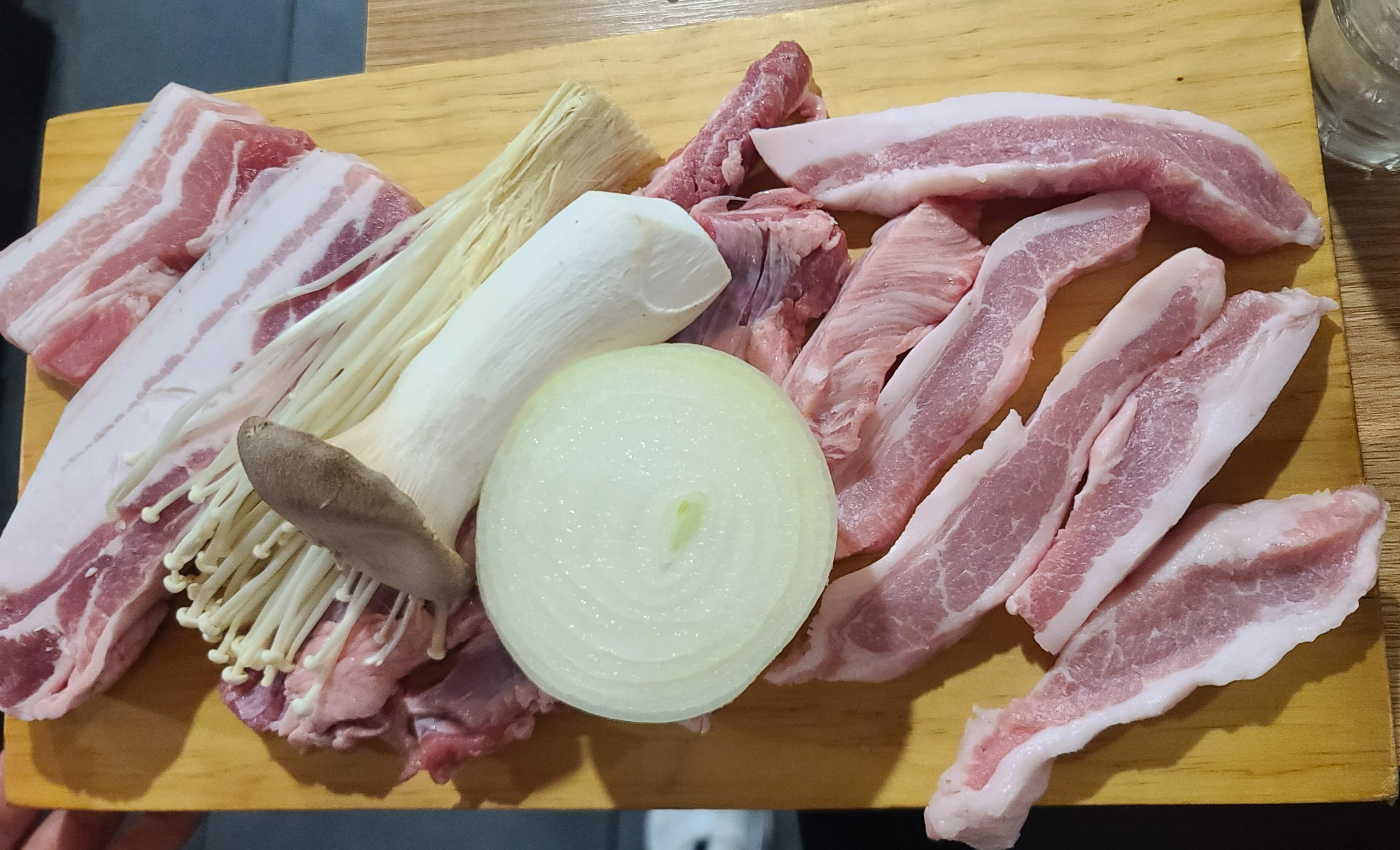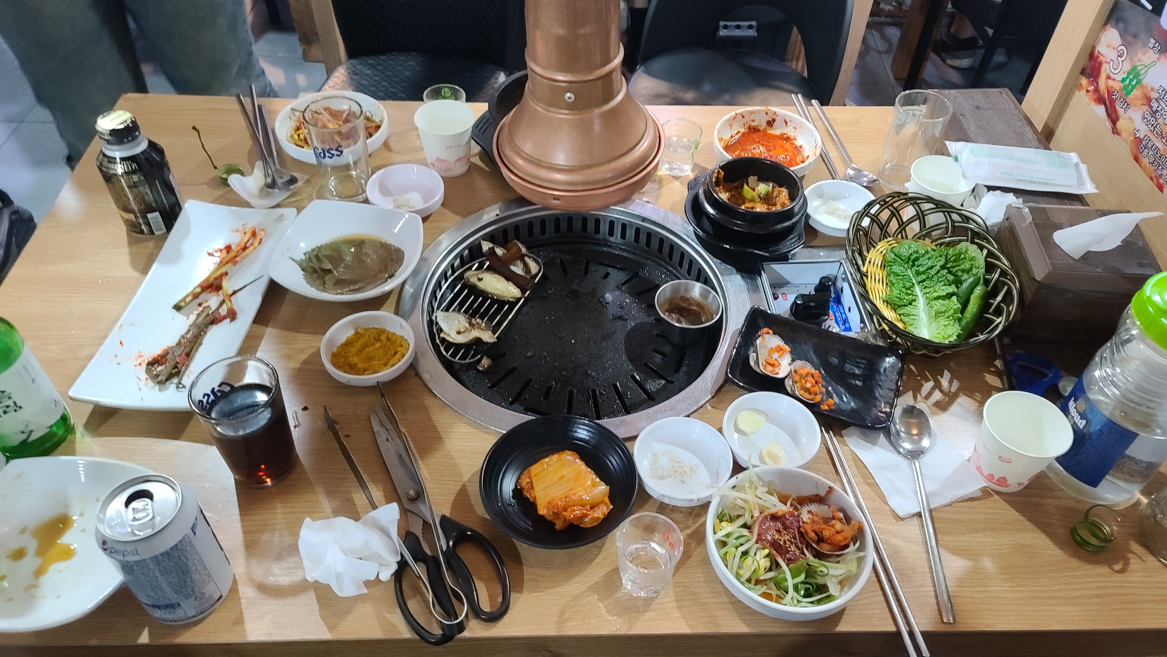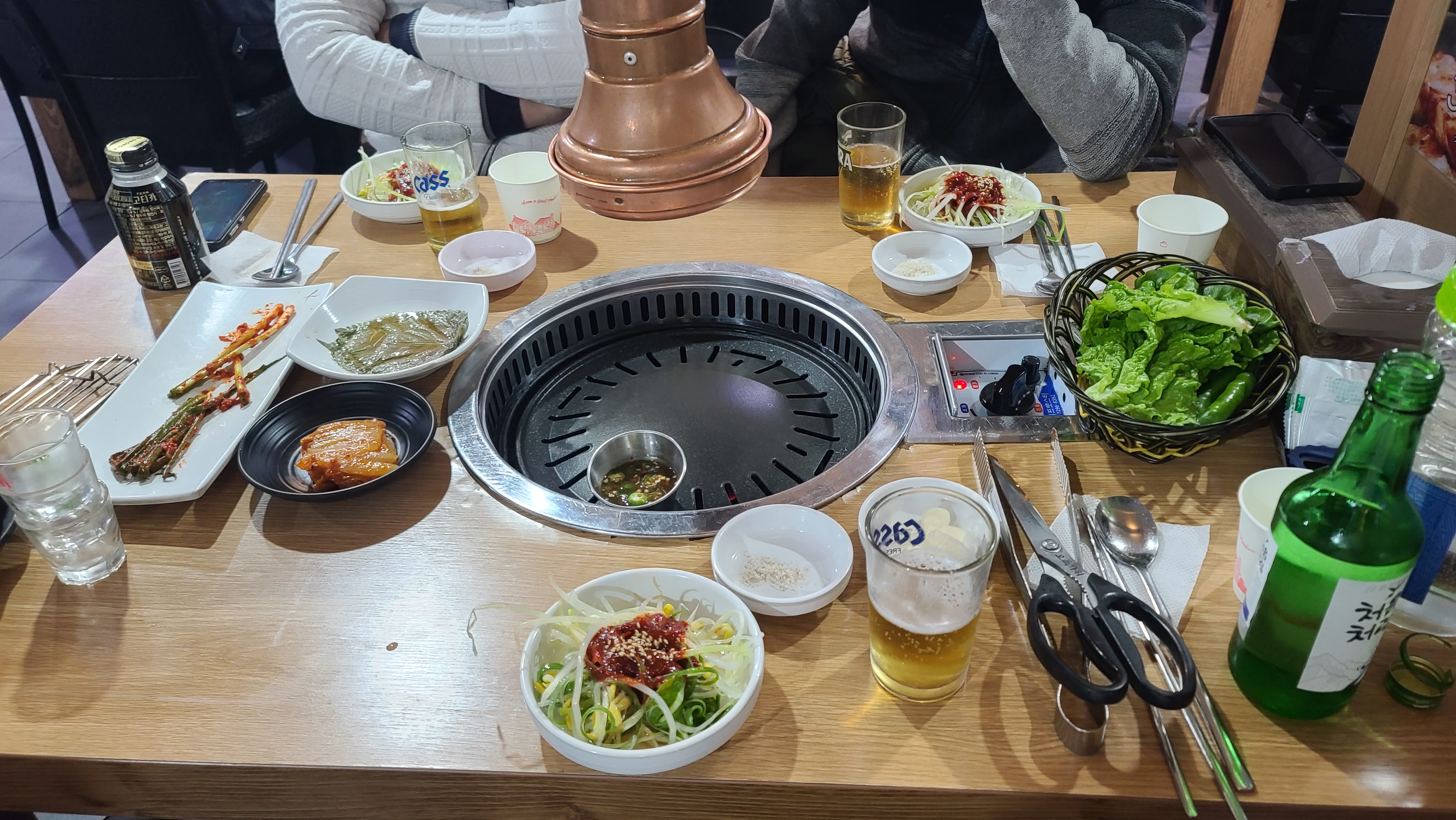 셀프바를 살펴보고 자리로 돌아오자 불판과 함께 푸짐하게 한상을 차려주셨습니다. 파채, 콩나물, 야채, 소금, 파김치 등 밑반찬의 맛을 보고 괜찮다고 생각하고 소맥으로 목을 축이면서 기다려봅니다.