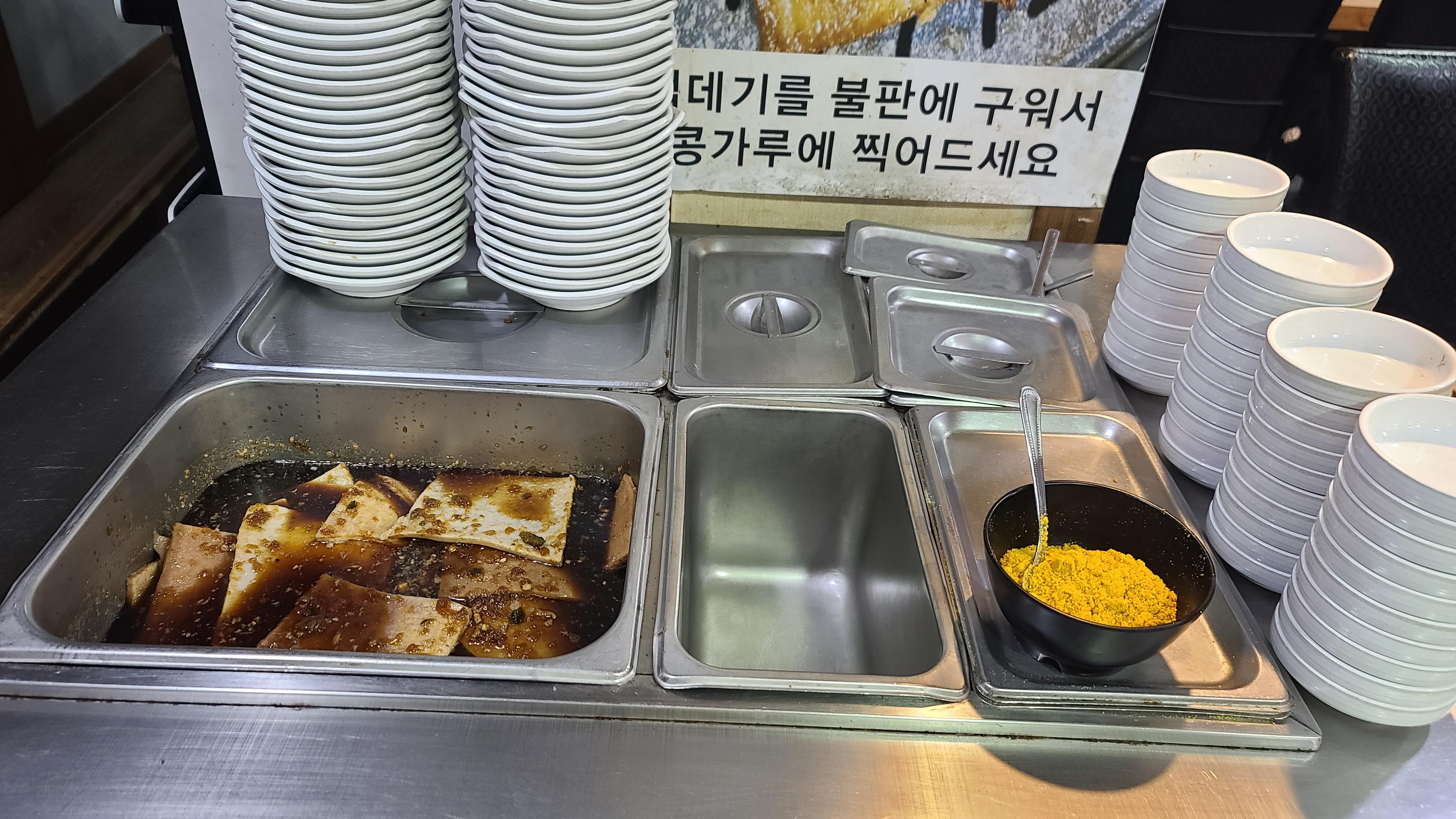 주변을 둘러보다 셀프코너를 발견 가까이 가서 살펴보니 껍데기가 가득 양념장에 담겨져 있고 특이하게 옆에는 카레가루가 담겨져 있는 모습입니다. 카레가루에 찍어먹는 껍데기는 어떤 맛일까 기대가 되며 고기를 먹고 가져다 먹기로 합니다.