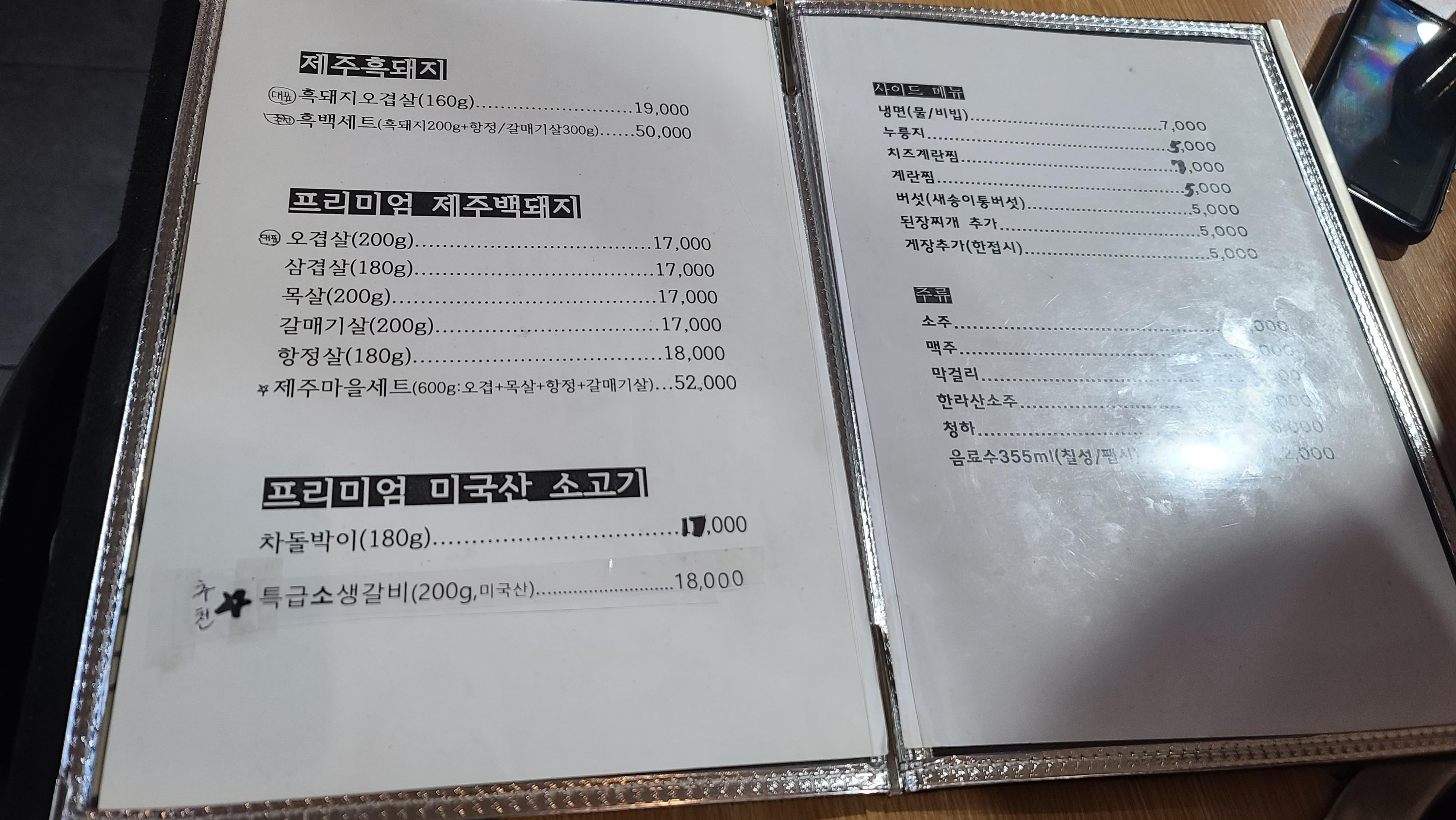 메뉴판을 살펴봅니다. 가게이름답게 제주흑돼지와 프리미엄 제주백돼지 메뉴가 가장먼저 들어옵니다. 무엇을 먹을까 잠시 살펴보다가 역시 모두 먹어보는것이 좋겠다는 생각에 흑백돼지세트를 주문하고 껍데기 메뉴를 살펴보니 보이지가 않습니다. 직원분께 껍데기는 어디있냐고 물어보니 껍데기는 공짜로 가져다가 드시면 된다는 말씀을 해주시고 있습니다. 고기를 주문하면 껍데기가 공짜라니 이런 혜자스러운 곳이 있나 감탄을 하고 주변을 살펴보게 됩니다.