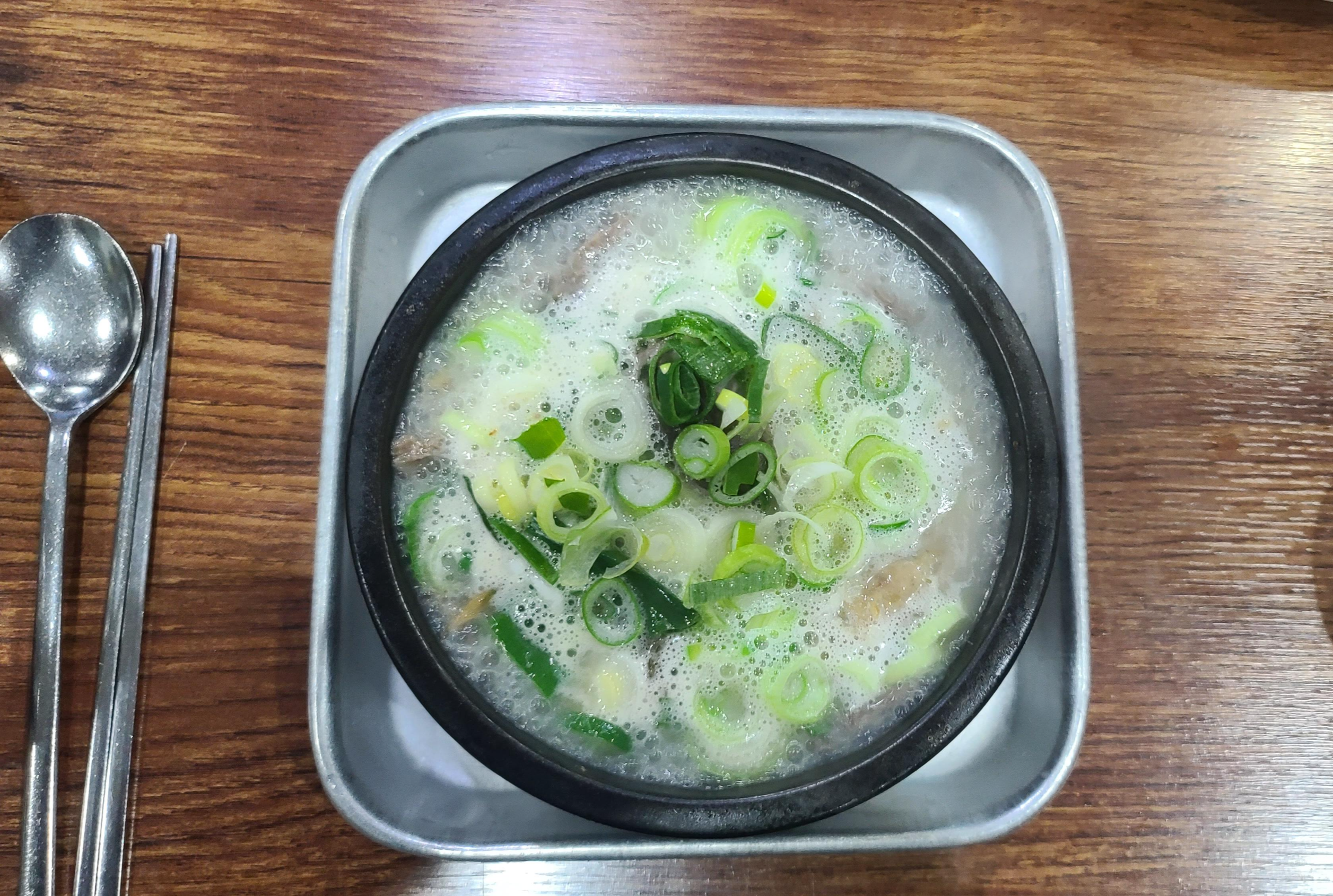 잠시 기다리자 펄펄 끓는 순대국이 뚝배기 그릇에 담겨져서 나왔습니다. 내용물을 뒤적이며 살펴보니 일반적으로 비계가 많은 머릿고기가 아닌 살코기 들이 듬뿍 들어있는 매우 혜자스러운 비주얼을 보여주고 있습니다.
