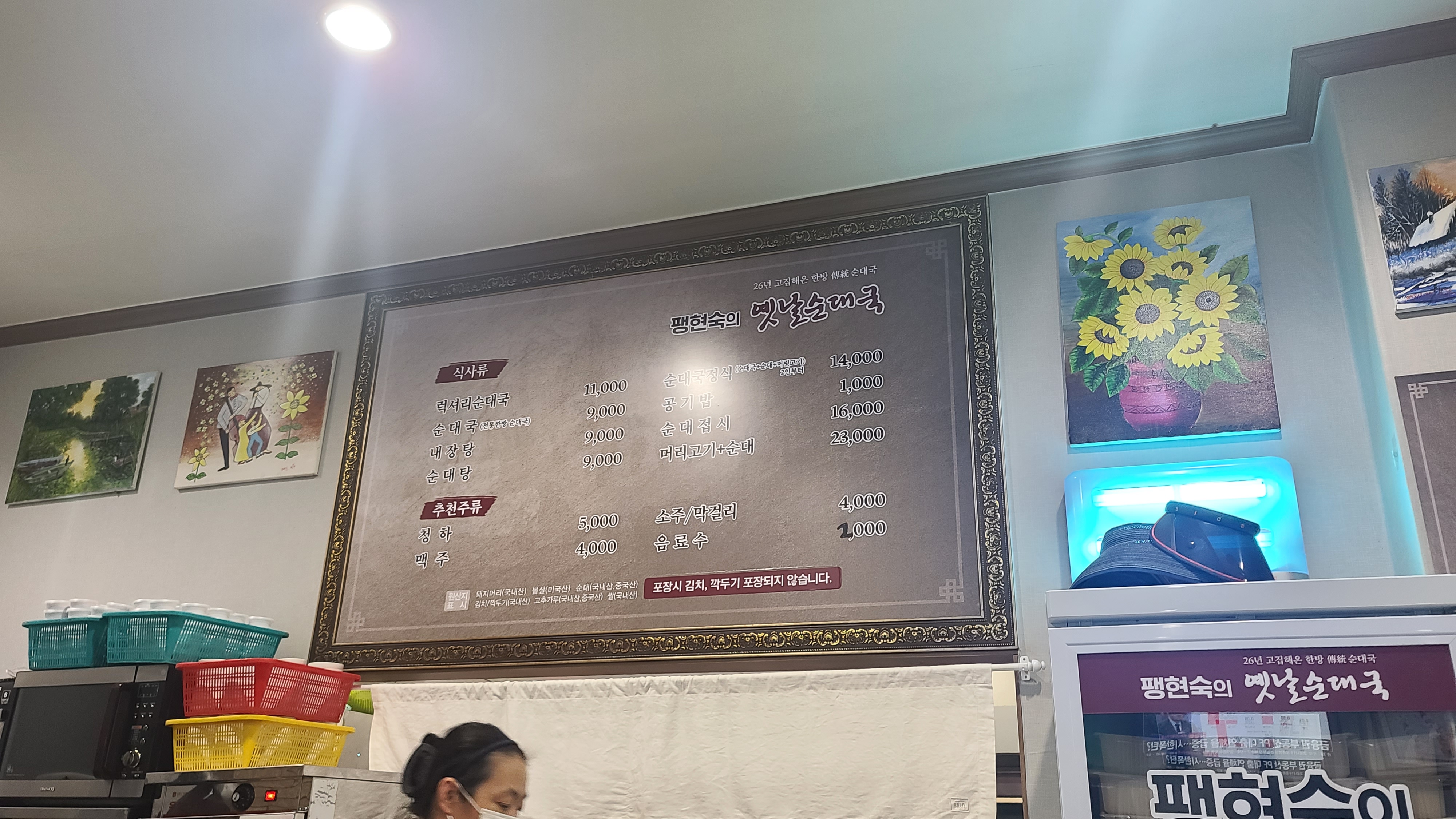 자리를 잡고 메뉴판을 살펴봅니다. 순대국이 9000원, 럭셔리 순대국이 11000원의 착한 가격을 보여주고 있습니다. 보통 순대국만 시켜도 다른 가게의 특순대국 이상 고기가 나오므로 왠간히 고기가 땡기지 않는 이상 보통으로 해도 충분하다는 것을 알기에 보통으로 주문을 합니다.