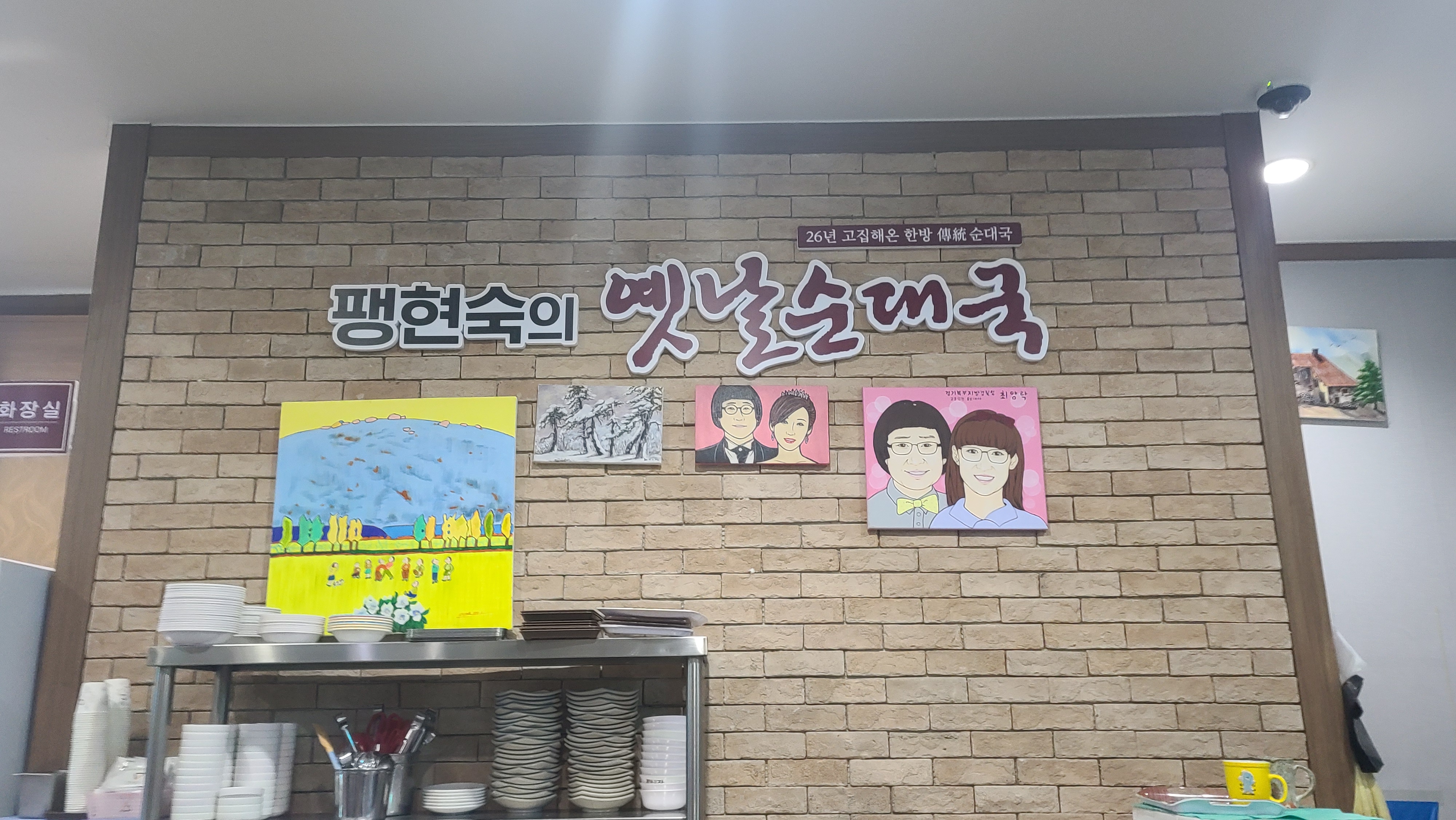 들어가서 자리를 잡고 주방 벽면쪽을 바라보니 가게이름에 맞게 팽현숙님과 최양락님의 캐리커쳐가 걸려져 있는게 눈에 들어옵니다. 최양락님의 트레이드마크 단발머리가 참으로 웃음을 자아내는 소재가 아닐 수 없습니다.