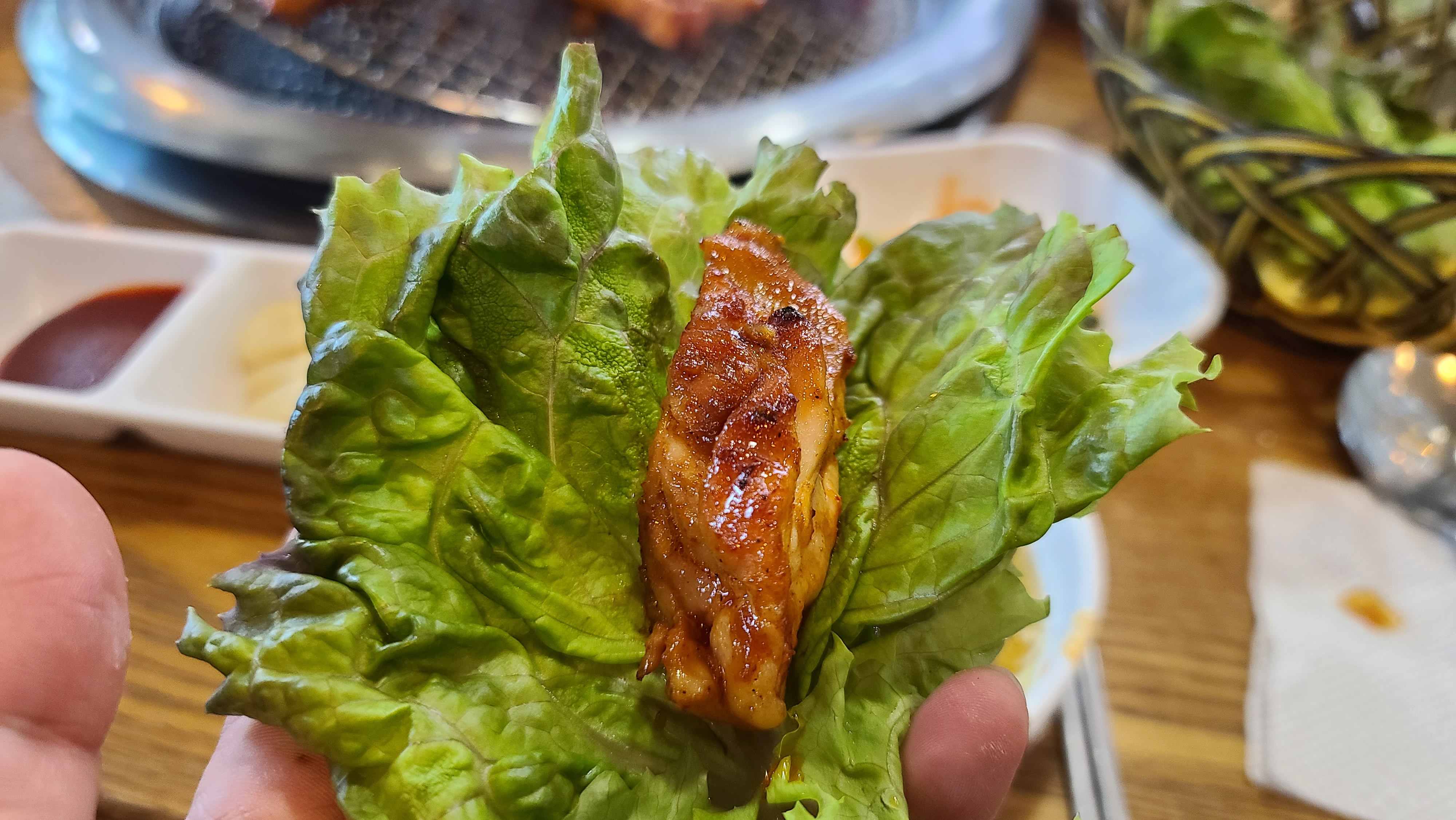 잘익혀진 숯불닭갈비를 소스에 찍어서도 먹고보고 그냥도 먹어보고 쌈에 싸서도 먹어봅니다. 숯불에 닭껍질이 양념과 함께 바삭하게 익어서 고소한 식감을 전해주고 막상 씹으면 촉촉한 속살이 잘 배어진 양념과 함께 어우러지며 천상의 맛을 자아내고 있습니다. 역시 캐디분이 맛집이라고 추천해주실 만한 곳이라고 공감을 하게 됩니다.