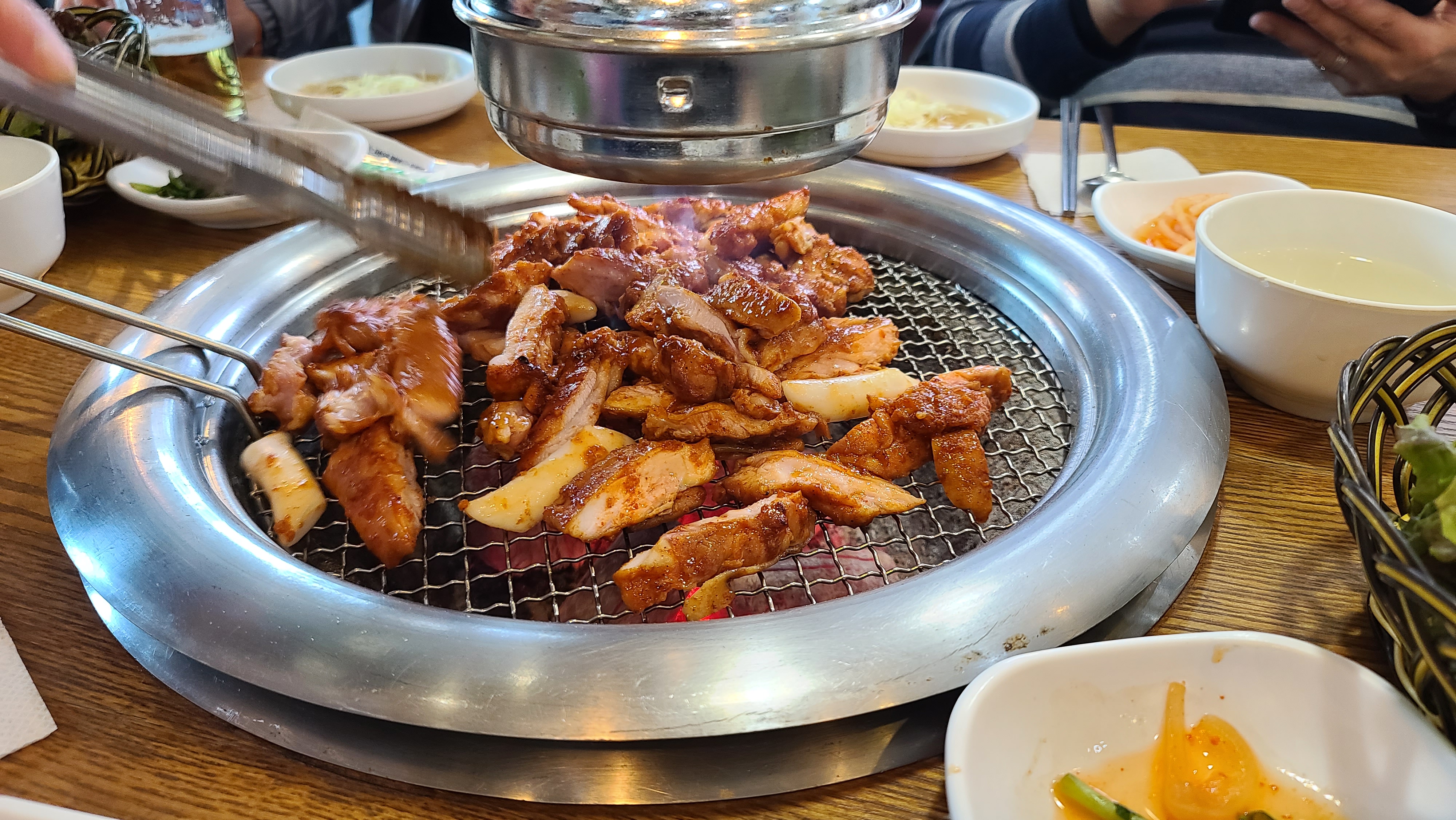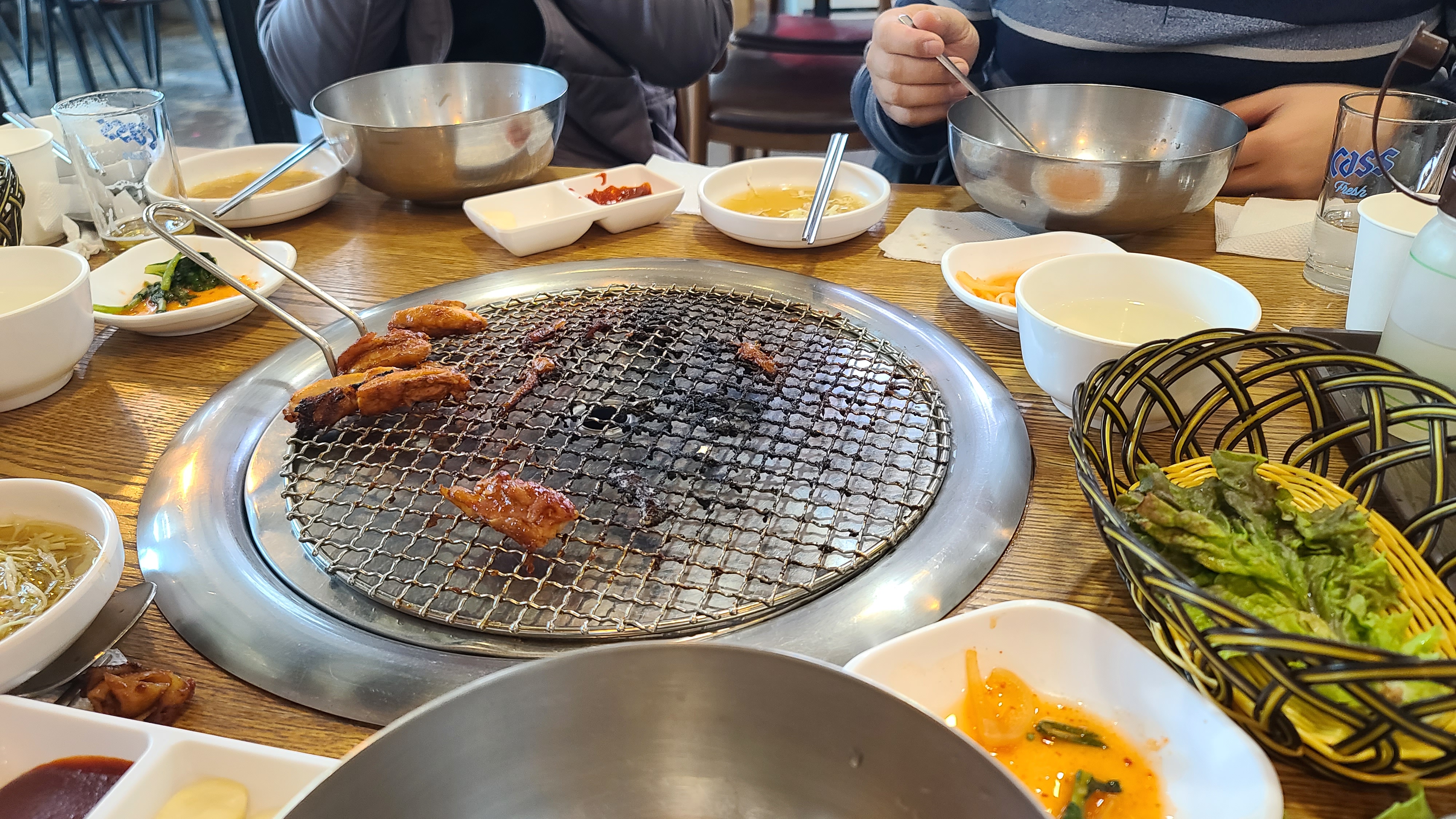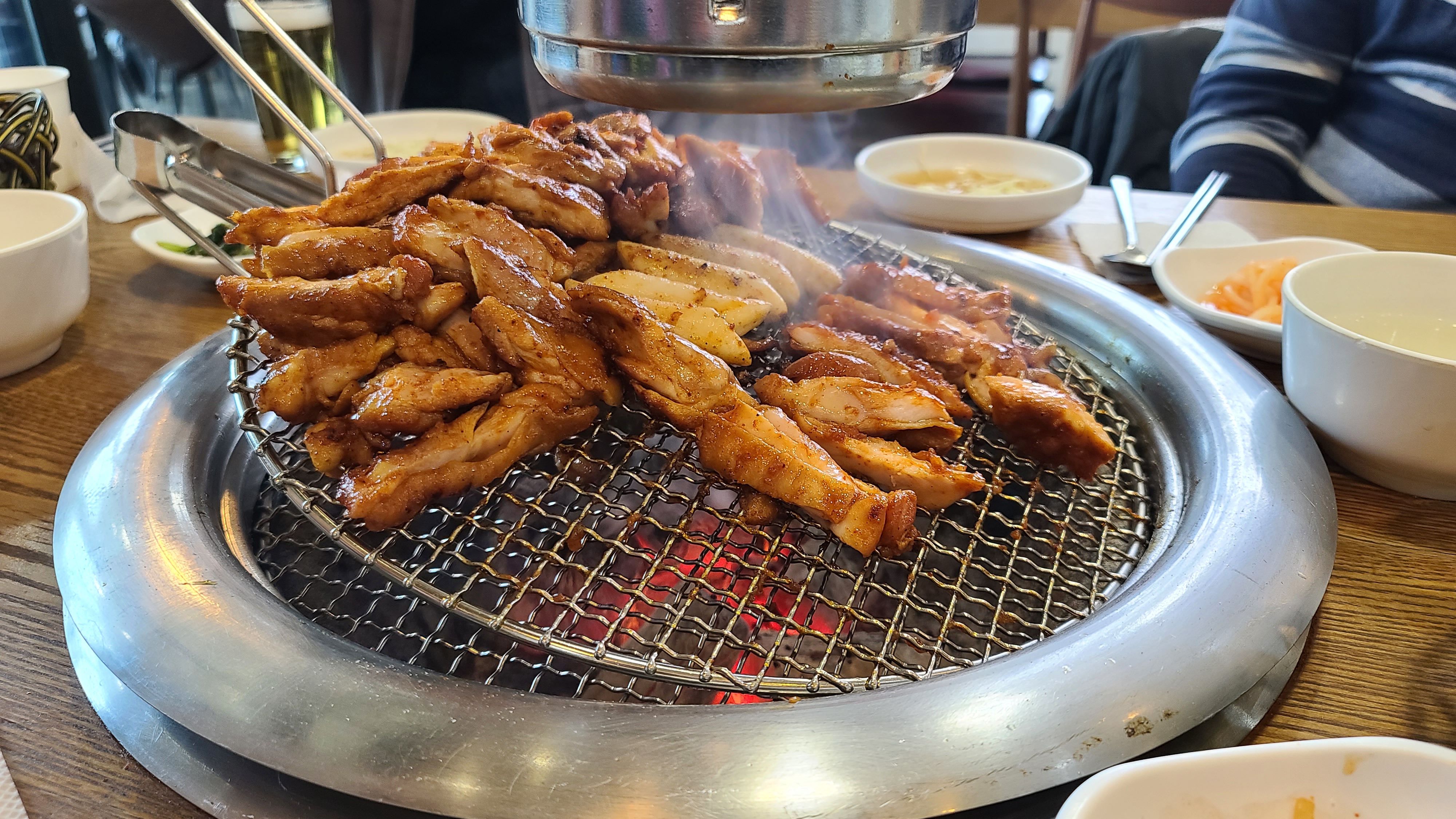 굽는게 완료되자 불판을 타지않게 들어올리고 따뜻하게 먹을수 있도록 세팅해주신 모습입니다. 발라낸뼈는 버리지 않고 닭갈비살을 먹는동안 익히도록 아랫쪽에 세팅해주신 모습이 하나하나 세심하게 배려하는게 전해져서 참으로 좋게 느껴집니다.