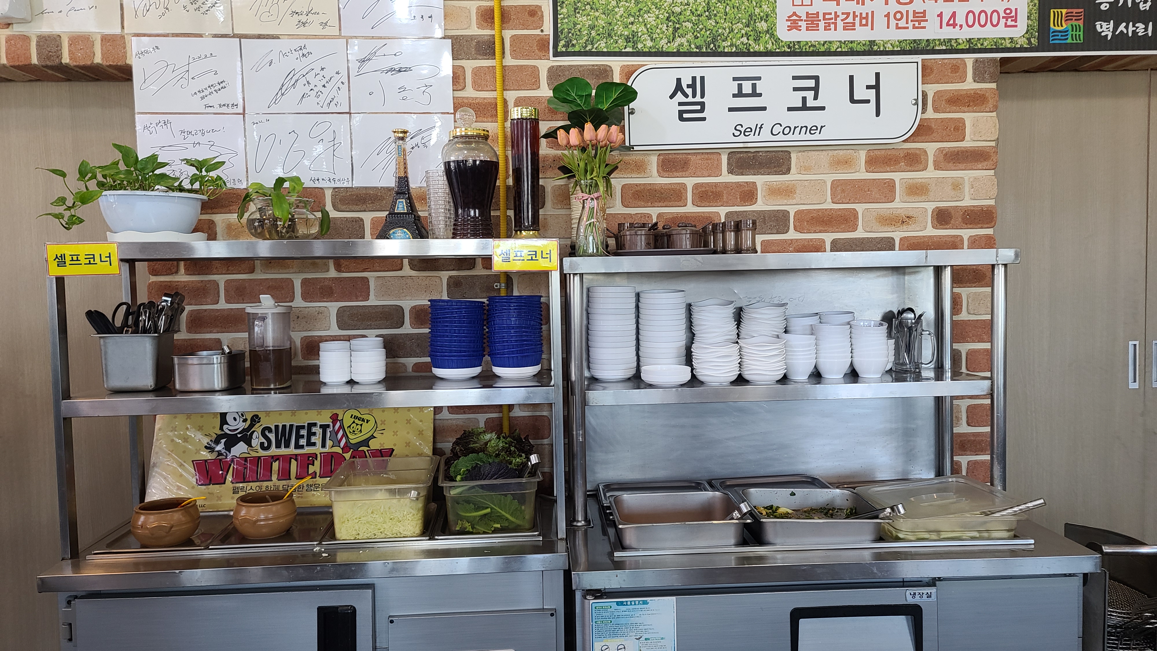 그래도 맛있는 닭갈비에 감탄하며 주변을 둘러보니 셀프코너가 있어서 쌈, 채소, 반찬 등 마음에 드는것을 추가로 얼마든지 가져다 먹을수가 있습니다. 눈치보지않고 쌈을 가져다가 닭갈비를 마음껏 즐겨봅니다.