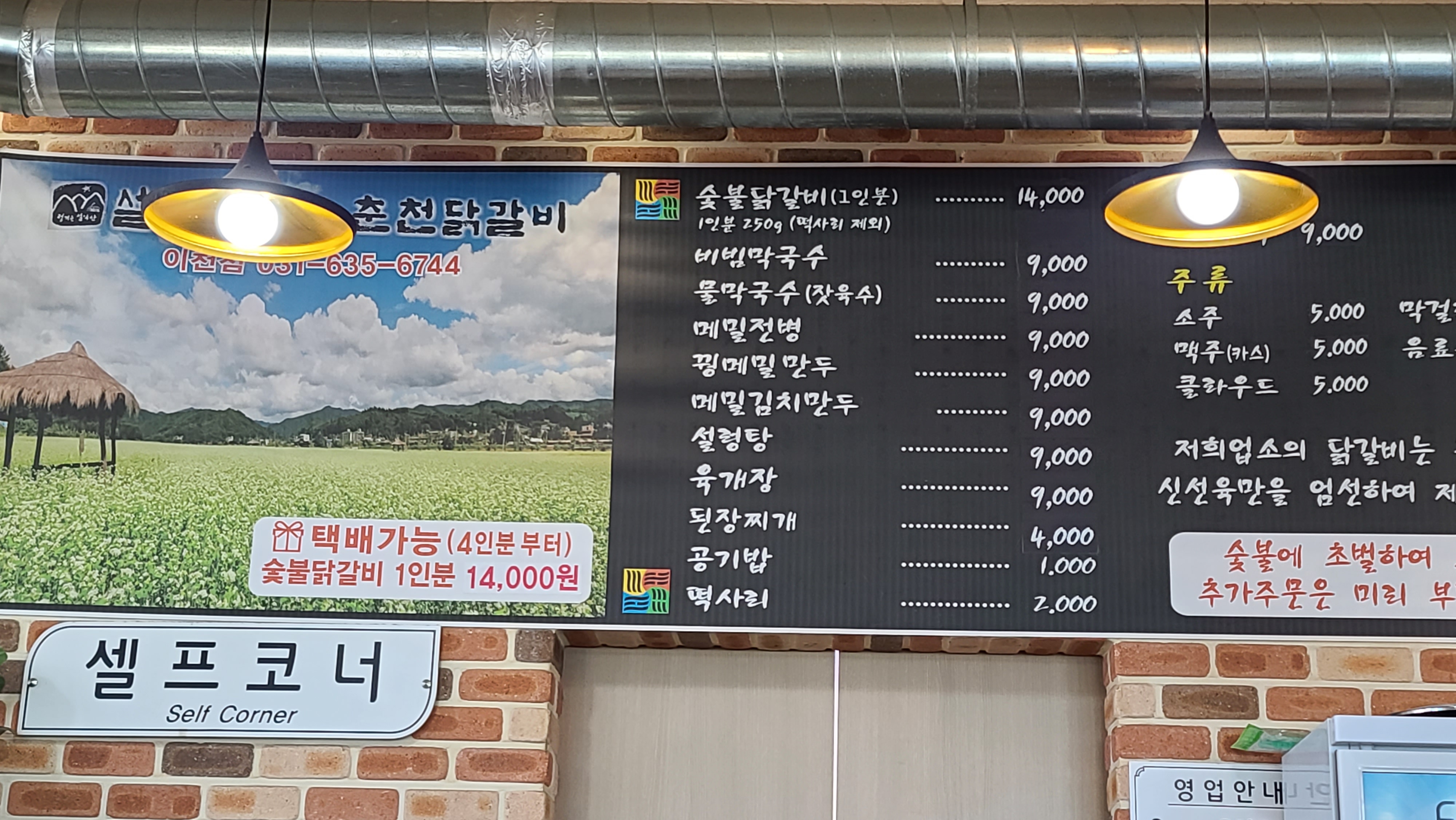 자리를 잡고 메뉴판을 살펴보니 닭갈비, 막국수, 메밀전병, 꿩만두, 설렁탕, 육개장 등 다양한 메뉴가 보입니다만 역시 닭갈비가 가장 땡기니 가게이름에 써있는대로 닭갈비와 막국수를 주문해봅니다.