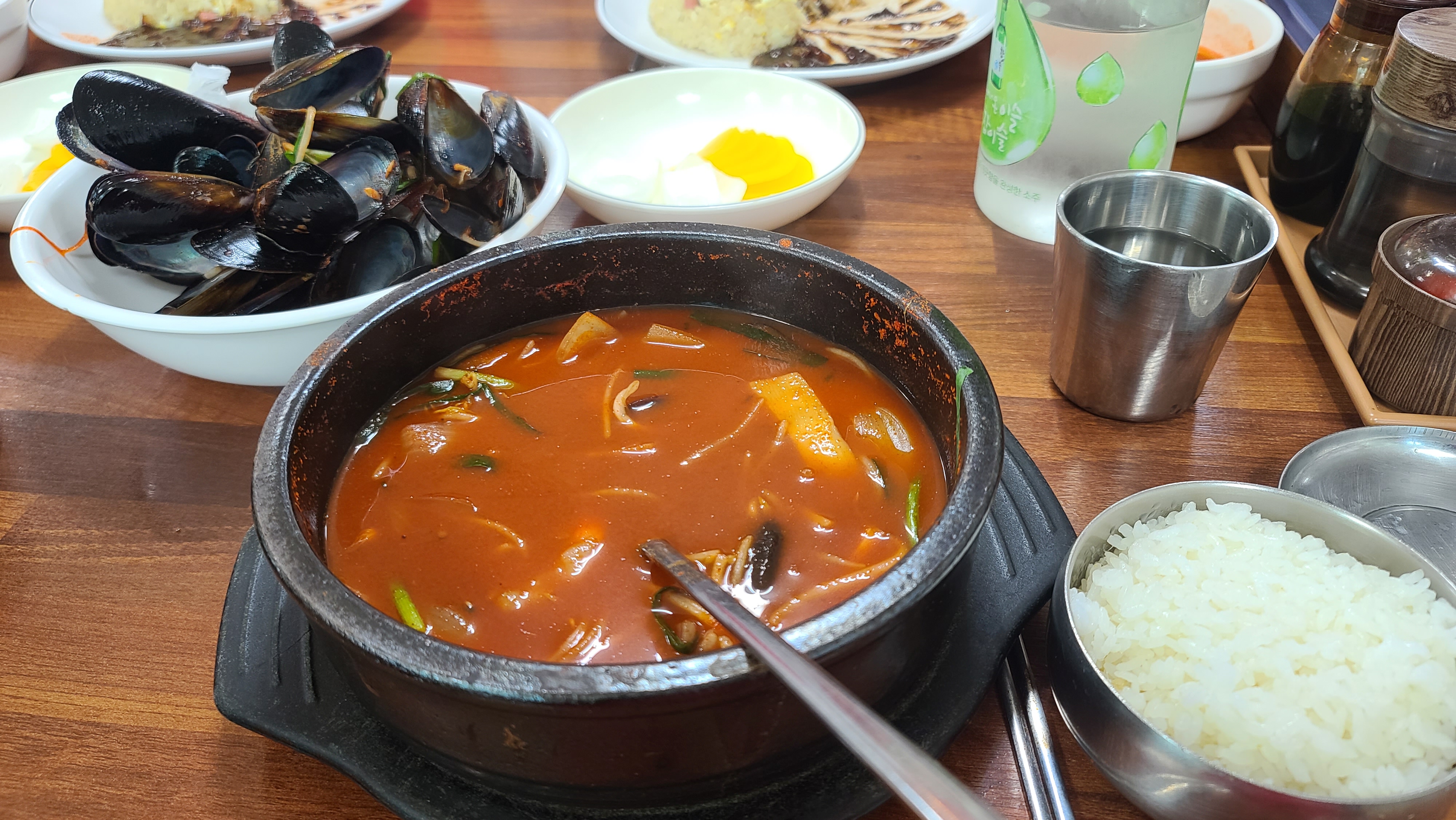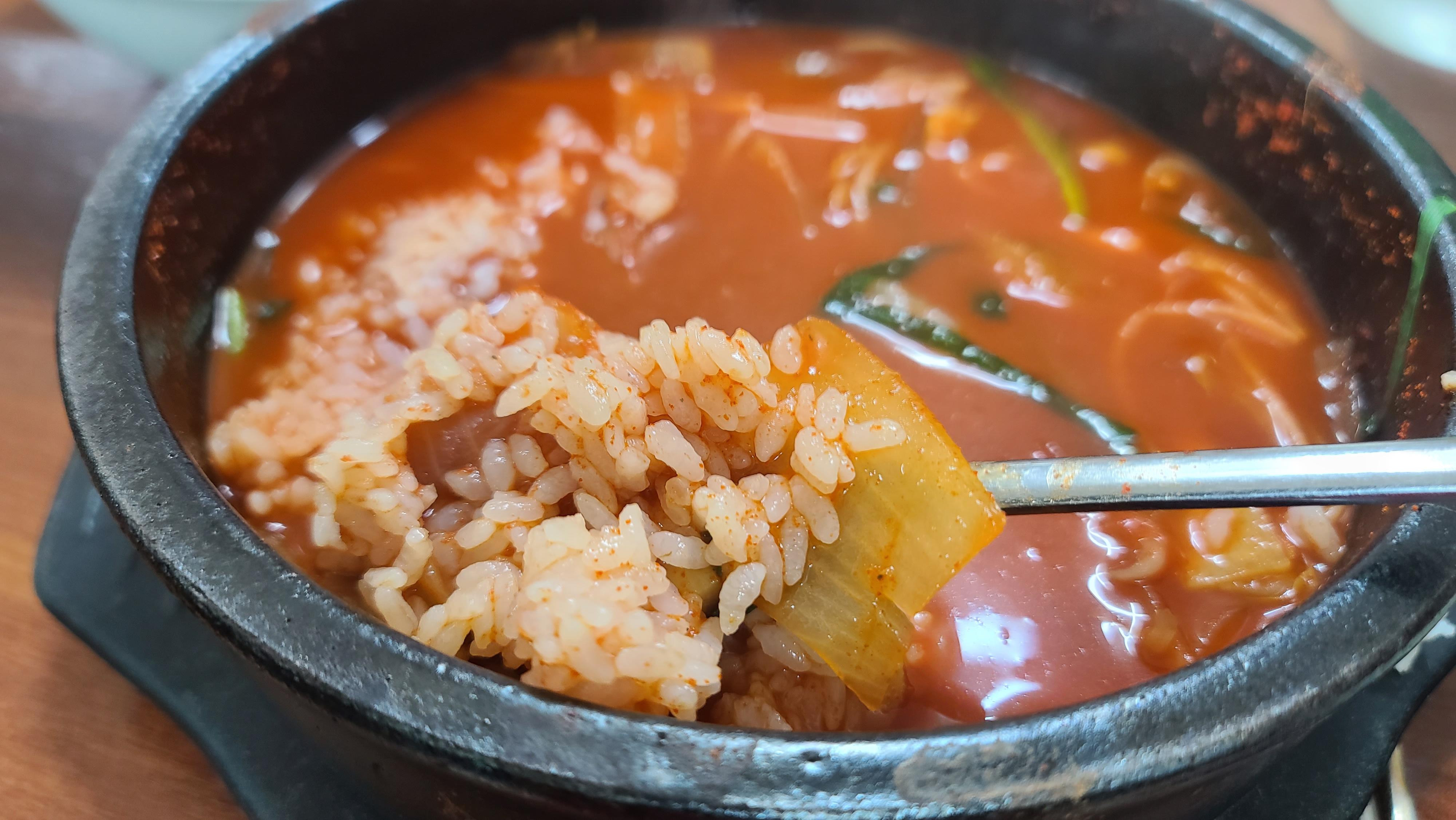 펄펄 끓는 뚝배기짬뽕의 비주얼을 담아봅니다. 뚝배기에서 짬뽕이 끓고 있으니 몸이 저절로 열이나면서 벌써부터 긴장이 되는 모습입니다. 과연 얼마나 매울까 기대하며 한입을 떠먹어봅니다.