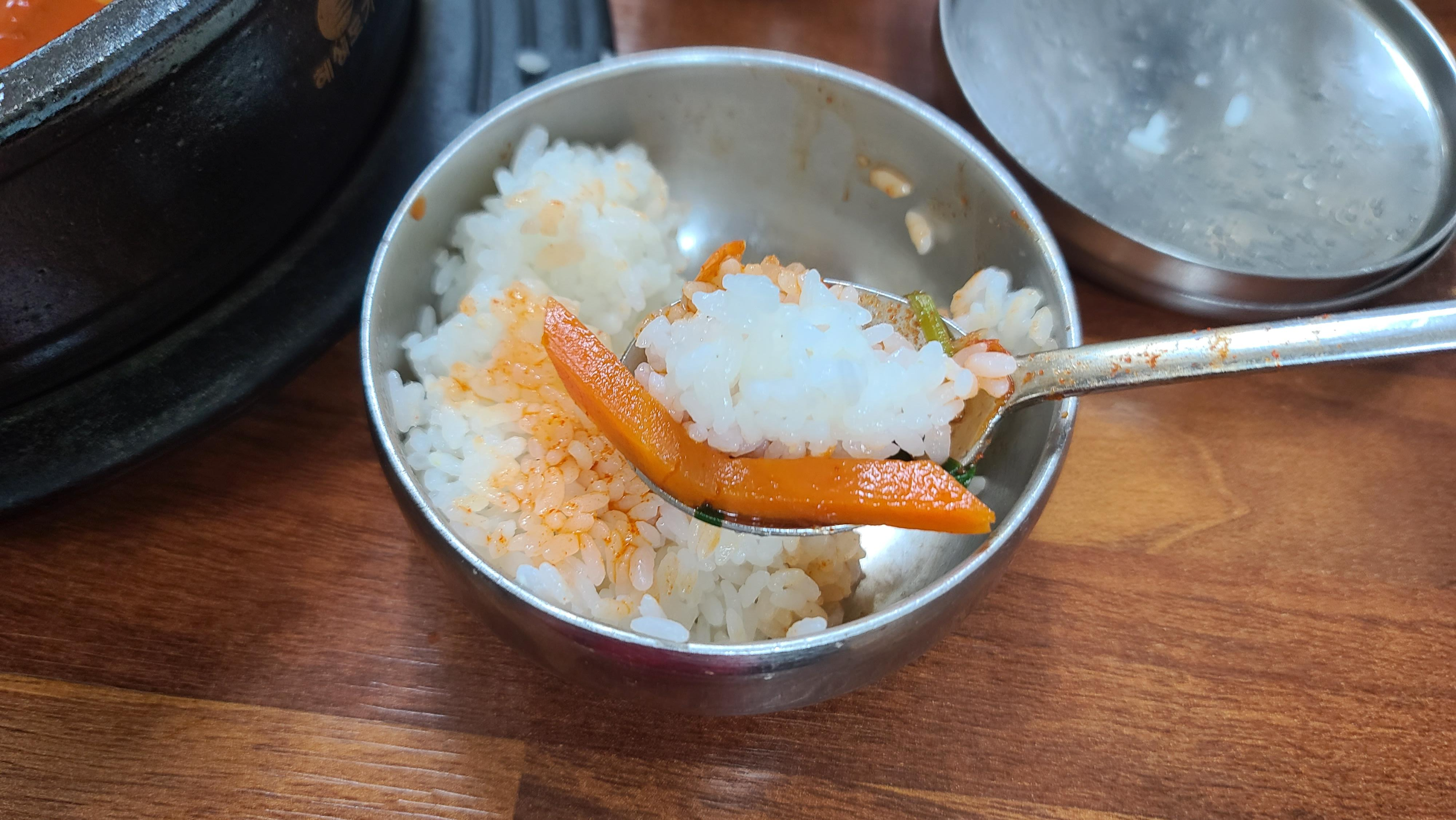 짬뽕에 밥을 말아서 일체된 느낌으로 계속 떠먹어보니 중독성있는 매운맛은 계속해서 밥을 떠먹는것을 멈추지않고 지속하게 만들어버립니다. 매운데도 멈출수가 없다는 느낌이 어떠한 것인지 깨닫게 되는 순간입니다.