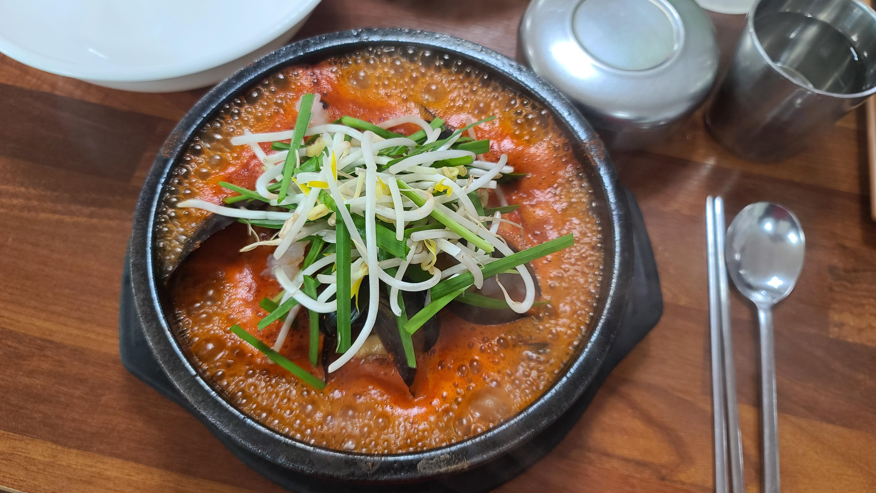 잠시 기다리자 뚝배기짬뽕밥이 나왔습니다. 돌뚝배기에 속을 달래줄 콩나물과 부추가 올라가있고 매우 매콤해보이는 비주얼이 저절로 입안에 군침을 돌게 만들고 있습니다.