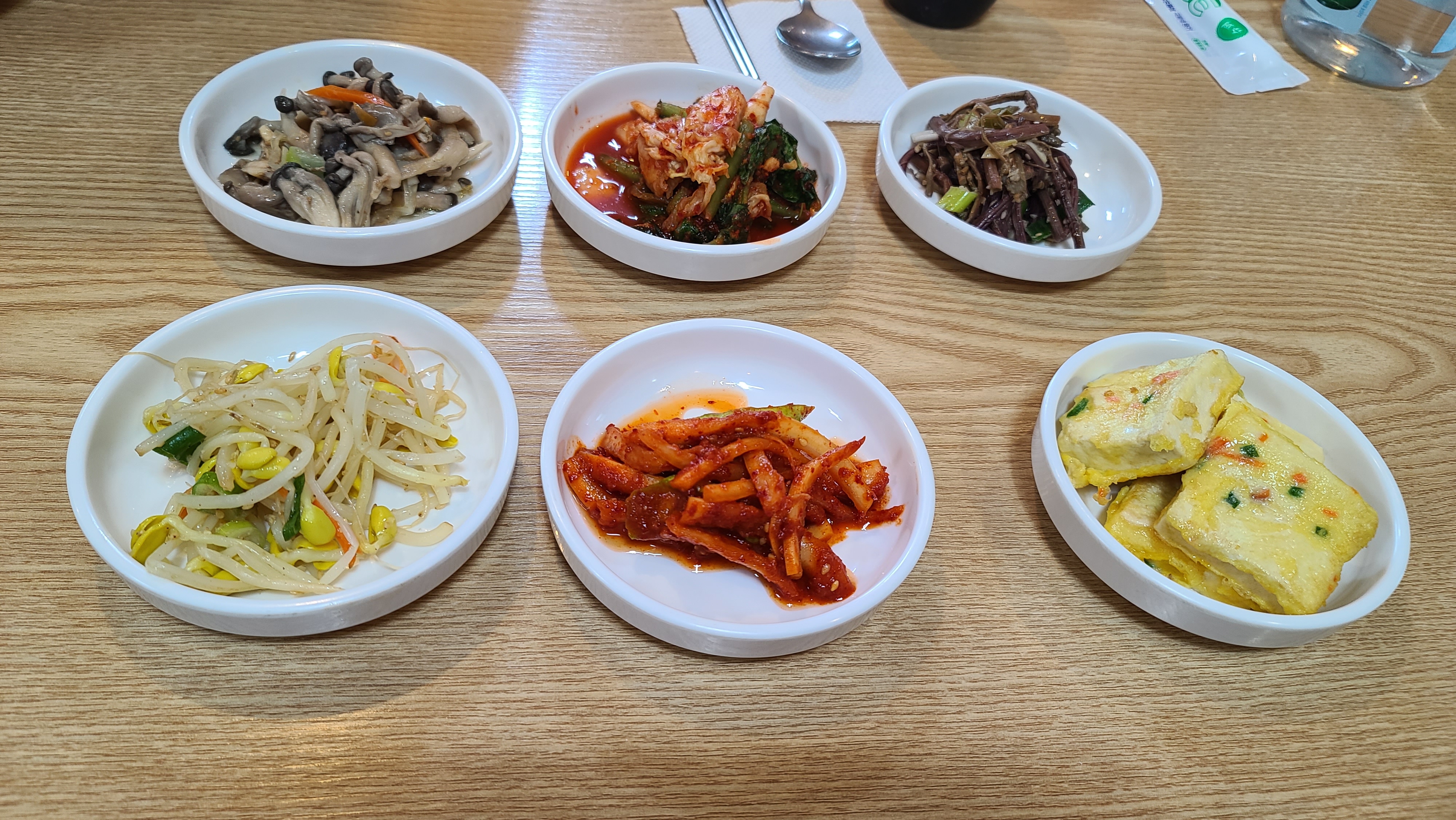 주문을 마치자 사장님께서 반찬과 물을 세팅해 주십니다. 반찬은 버섯조림, 얼갈이, 고사리, 콩나물, 도라지, 두부부침이 마련되어 있으며 참으로 정감이 가는 반찬들이 아닐 수 없습니다.