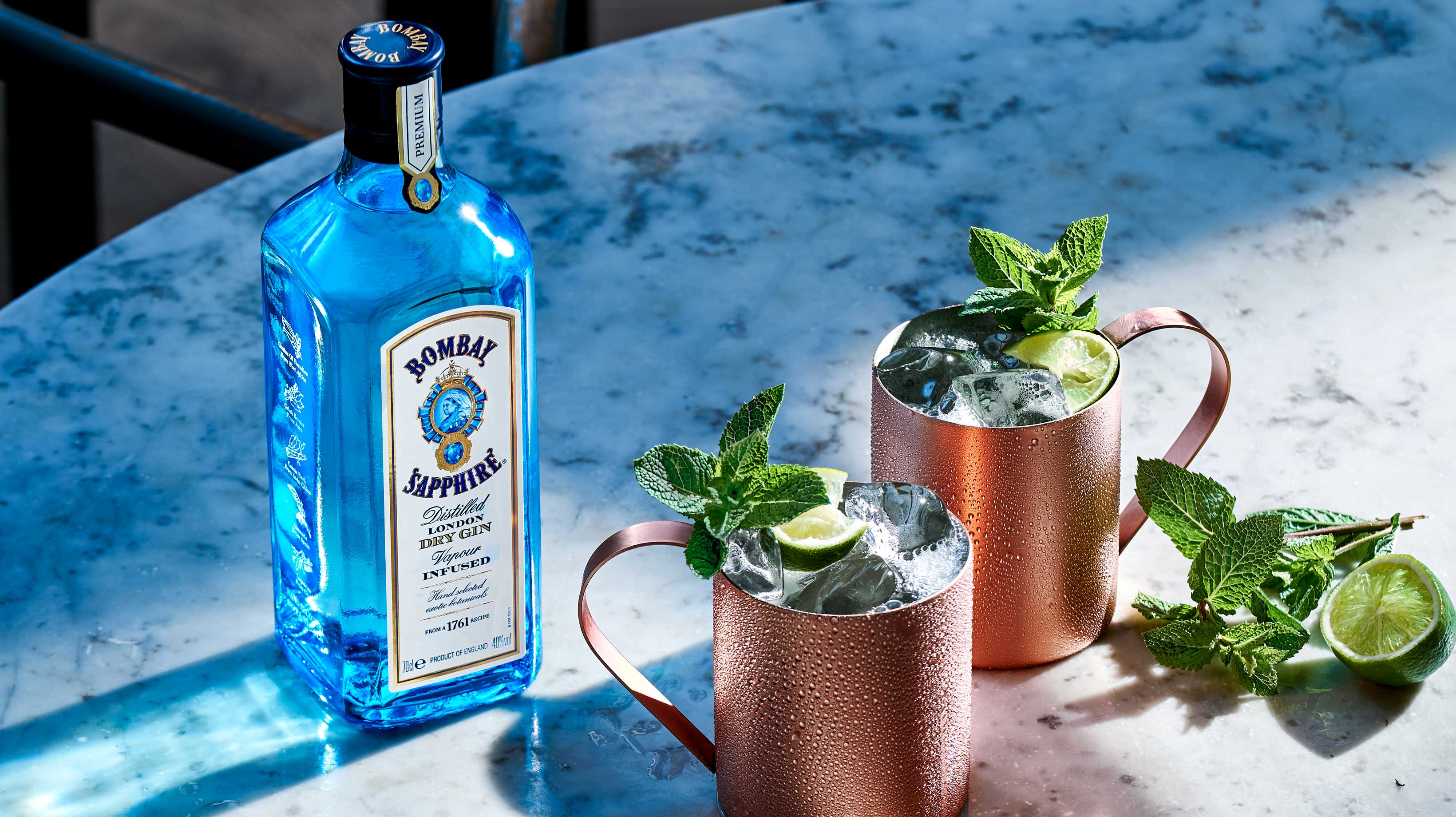 - 봄베이 사파이어 진 50ml를 얼음 가득 채운 뮬(Mule)잔에 채웁니다.