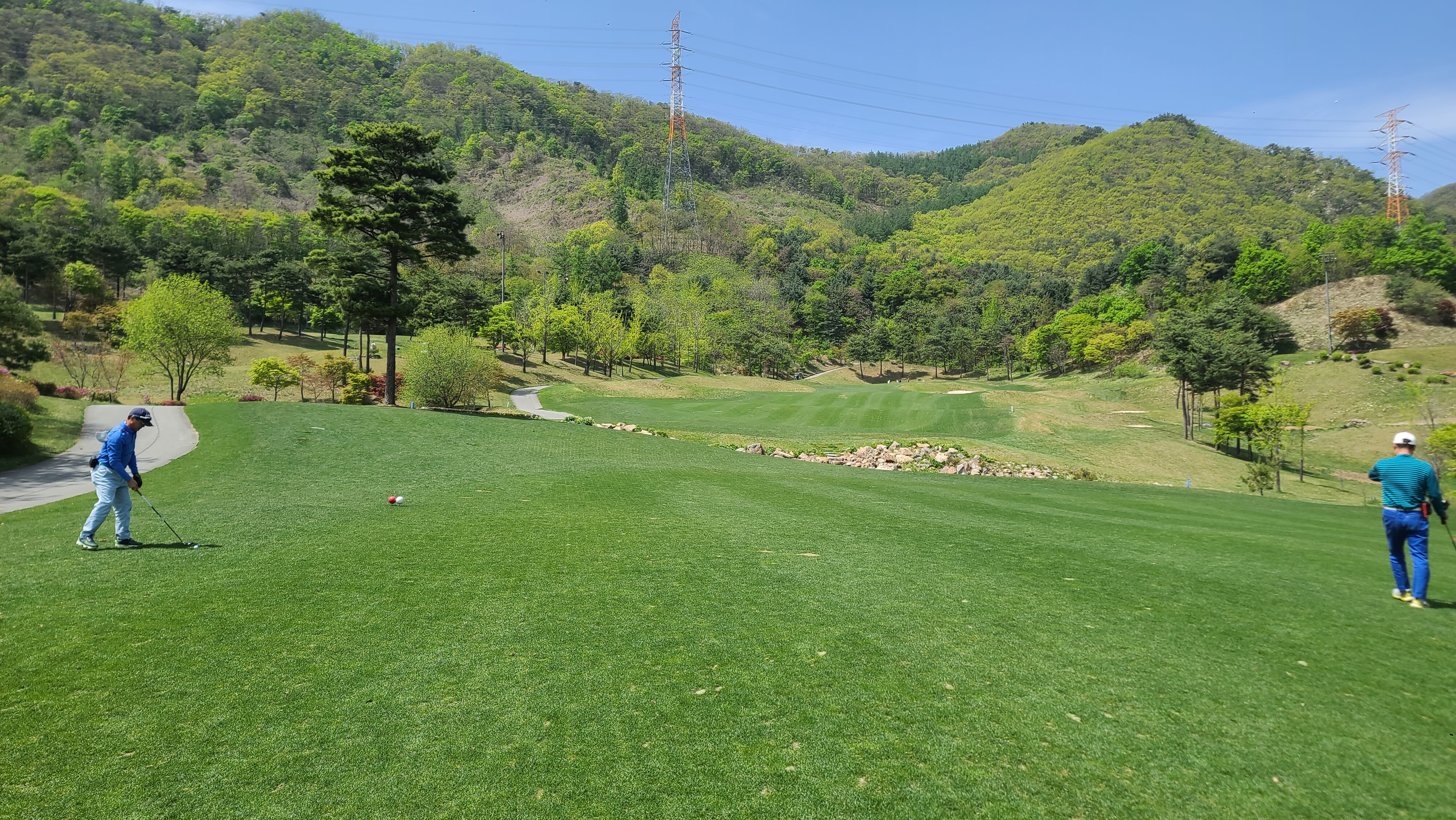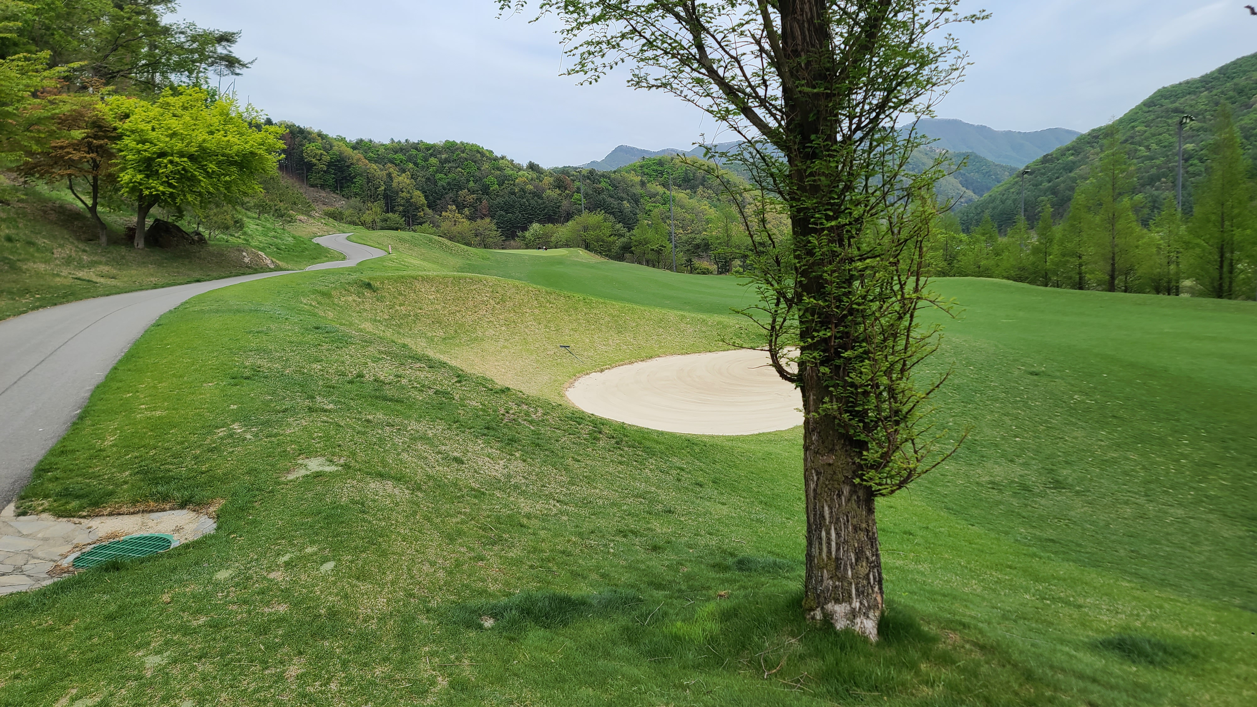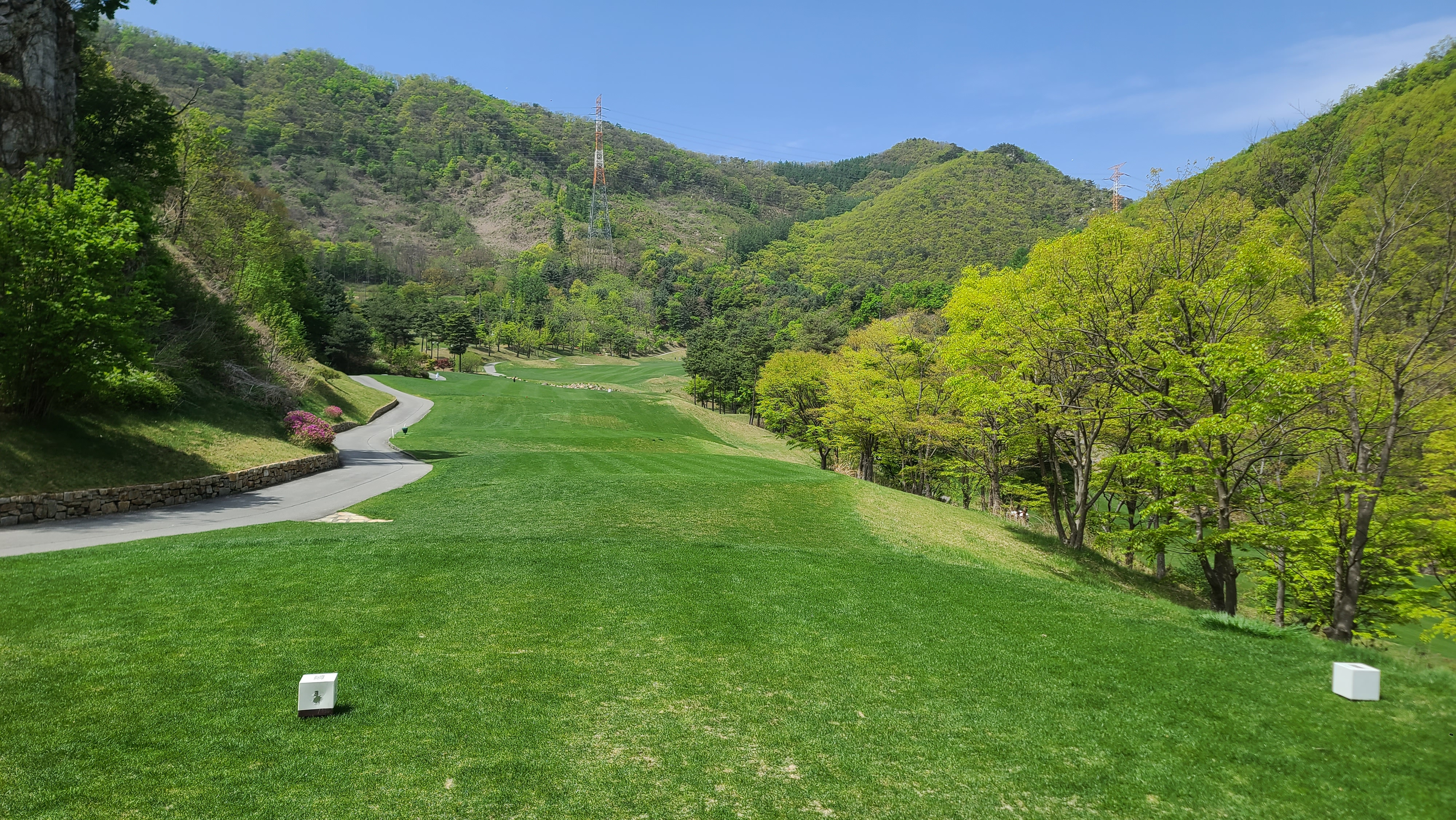 마운틴 5번 409m 거리의 내리막 파4홀입니다. 왼쪽OB, 오른쪽 헤저드로 구성되어 있으며 왼쪽은 내리막에 다른홀 세컨샷지점과 연결되어 있어 매우 주의를 요하고 공이 내려가면 찾기고 힘든 구조입니다. 반면 오른쪽은 오르막 수직 언덕으로 이루어져 있어 어느정도 슬라이스가 나도 안쪽으로 들어오는 코스이기 때문에 페이드 구질로 안정적으로 티샷을 한다면 좋은 결과를 얻을 수가 있습니다.