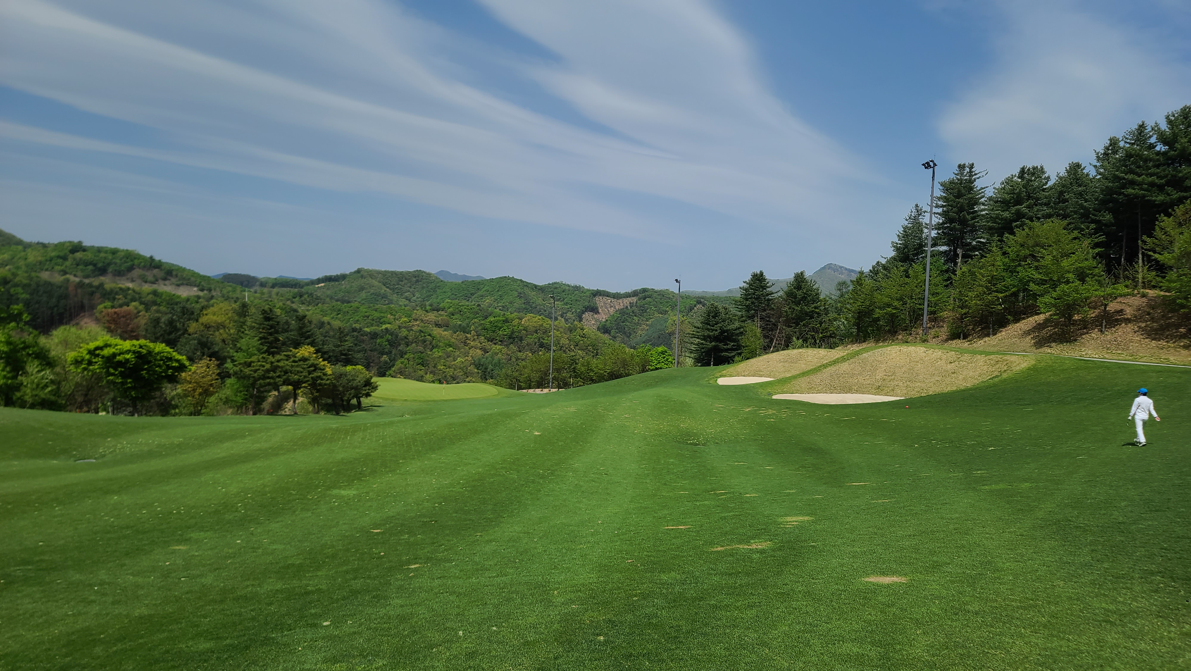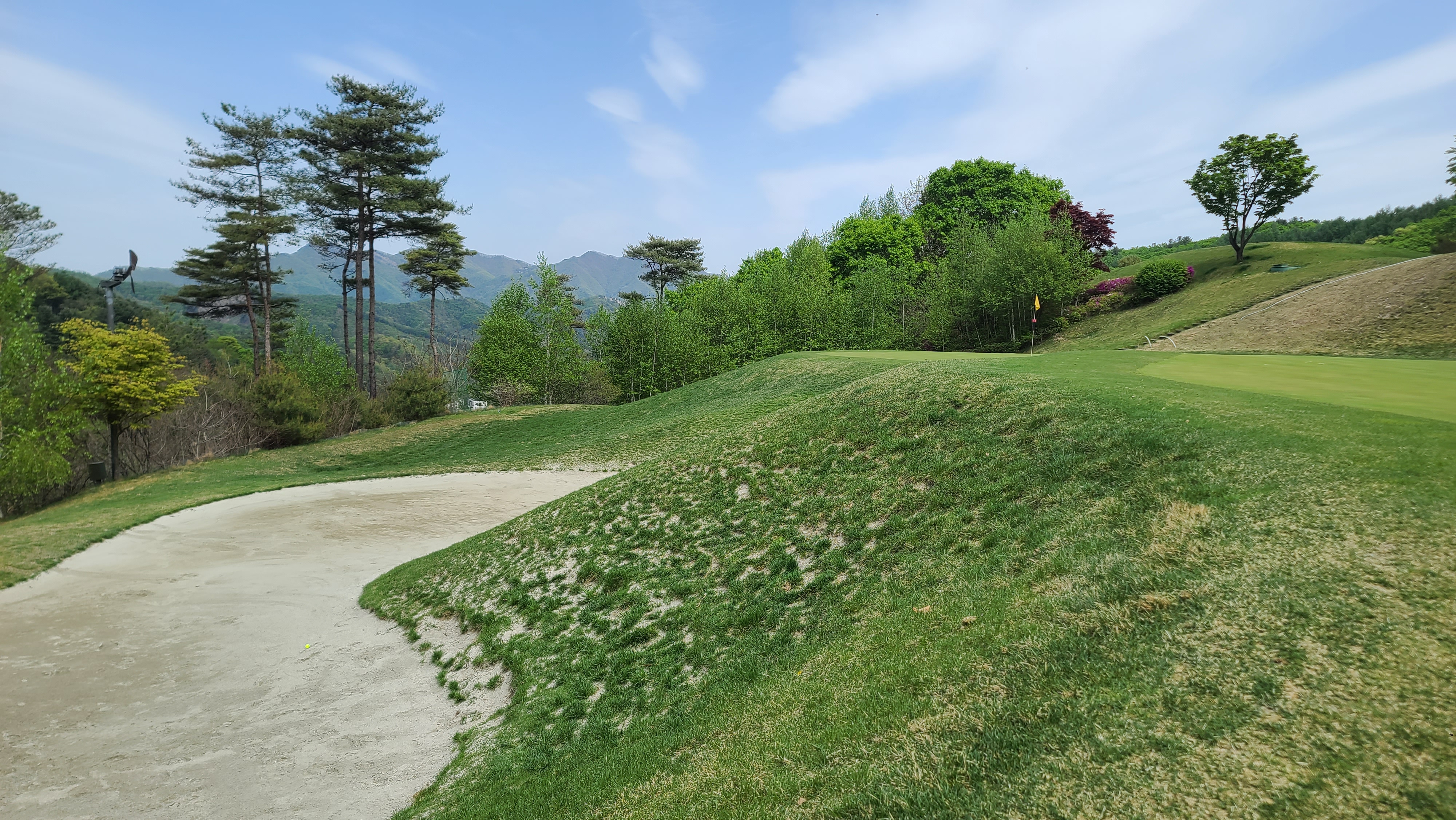 마운틴 코스의 마지막 9번 430m의 파5홀입니다. 백티이지만 비교적 거리가 짧아서 2온을 노릴수도 있는 마지막홀로 당연한 이야기지만 티샷이 무척 중요한 홀이기도 합니다. 역시 우측 슬라이스홀로 언듈레이션이 좌에서 우로 끝까지 이어져 있기 때문에 좌측으로 공략하는 것이 유리합니다.
