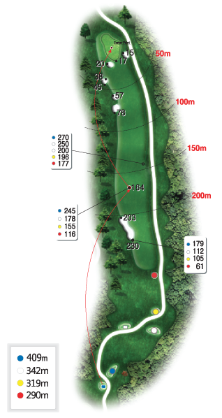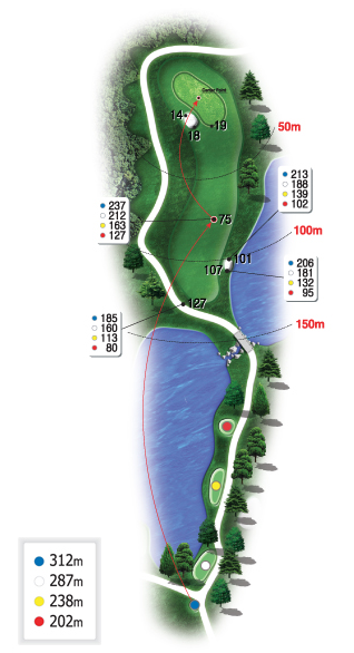 레이디 티는 계곡을 건너서 218m지점에 있기 때문에 화이트티와 거리가 무려 130m 가량 차이가 있으며 난이도가 대폭 감소하게 됩니다만 IP지점 세컨샷시 그린이 잘 보이지 않고 뒤쪽으로 공간이 없게 설계를 하였기 때문에 심리적 압박감을 마지막까지 놓칠 수가 없게 만든 짧지만 어려운 코스입니다.