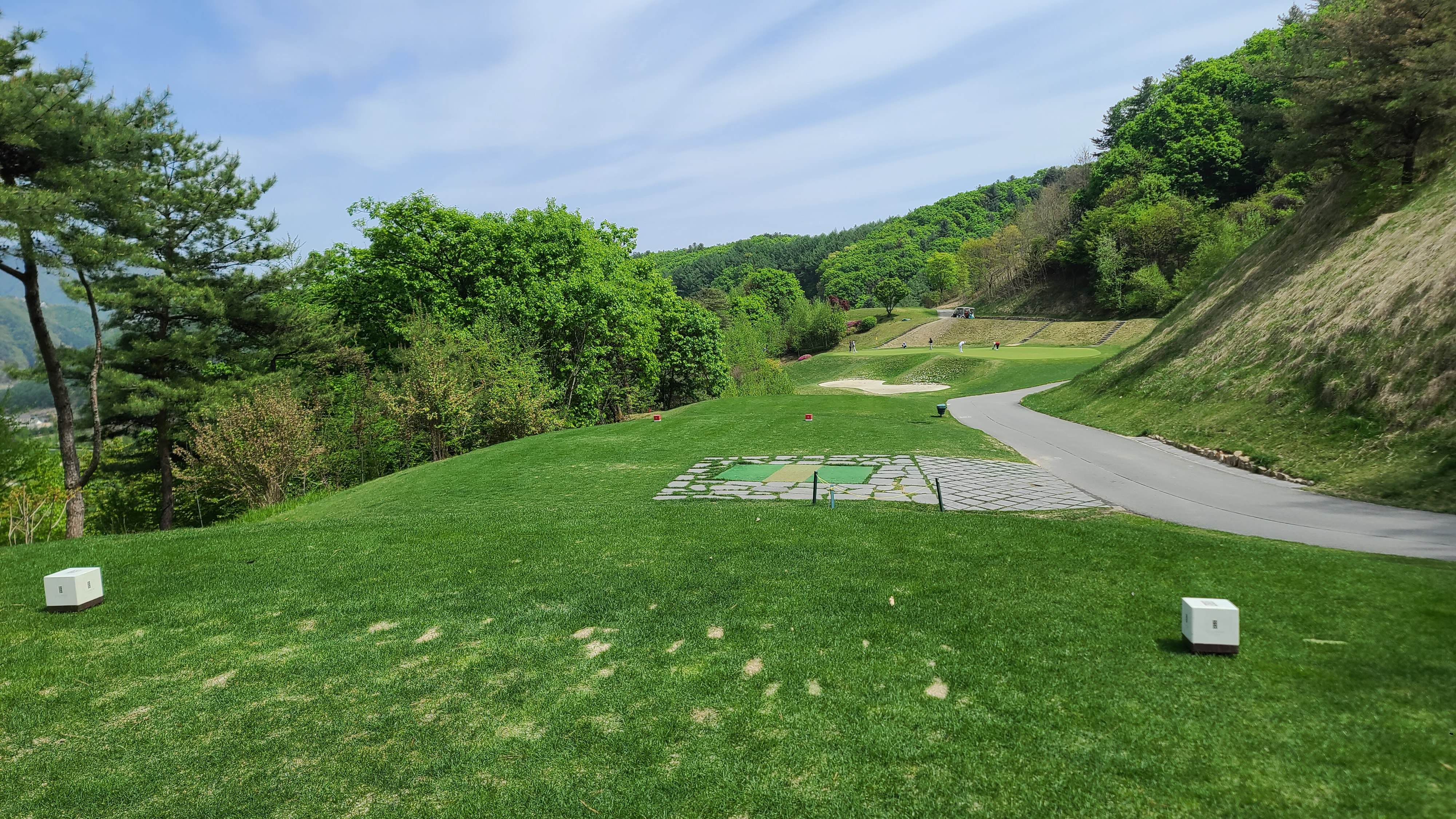 1번 파5 클럽모우에서 요즘 대부분의 화이트를 티를 백티로 해놓았기 때문에 490m에 다다르는 긴 전장의 코스입니다. 좌측 헤저드, 우측 OB 오른쪽에 다른 코스의 세컨샷지점이라 위험하기 때문에 특히 조심하여야 하고 백티기준 250m 부근이 실개천 해저드로 페어웨이가 끊어져 있기 때문에 거리와 방향성의 유의한 티샷이 요구됩니다.