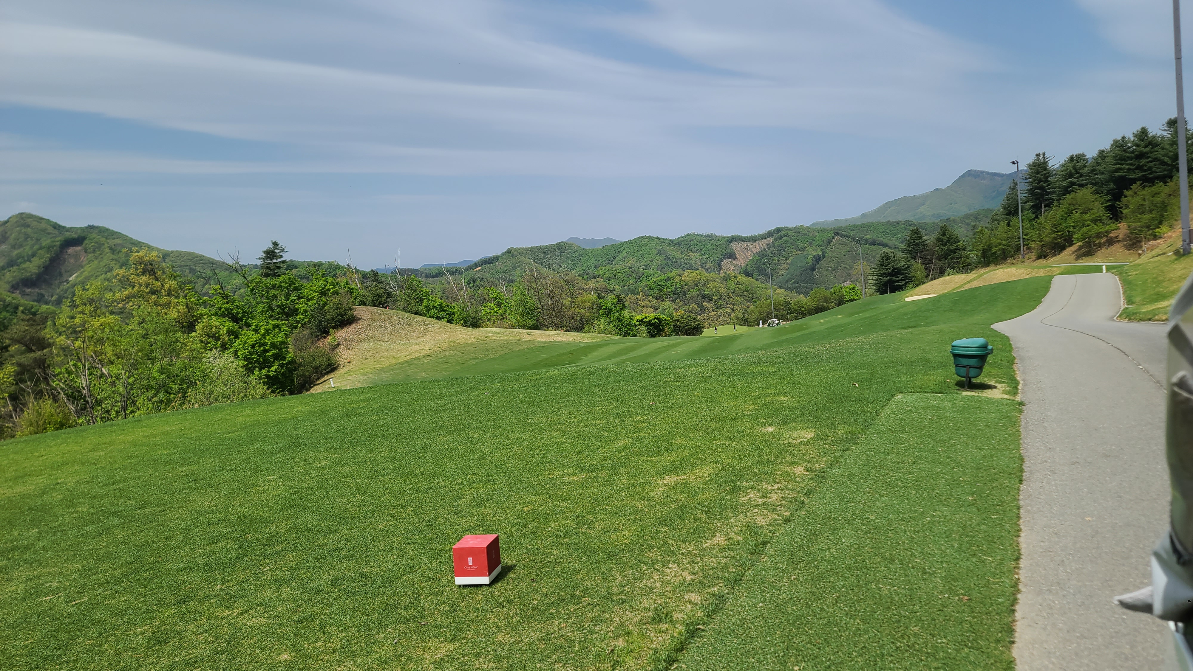1번홀 티샷을 마치고 세컨지점에서 그린을 바라보니 아직 250m 이상이 남아있습니다. 바로앞에 보이는 실개천 때문에 장타자라도 손쉽게 티샷을 지르지 못하고 끊어가는 것이 올바른 선택이라고 할 수 있습니다. 바로 앞에 보이는 빨간색과 하얀색표시의 OB티와 헤저드티도 같은 곳에 위치하고 있으며 역시 상당히 거리가 남아있기 때문에 첫홀 티샷 실패는 상당히 어려운 라운드의 시작이 될 수 있으므로 주의하여야 합니다.
