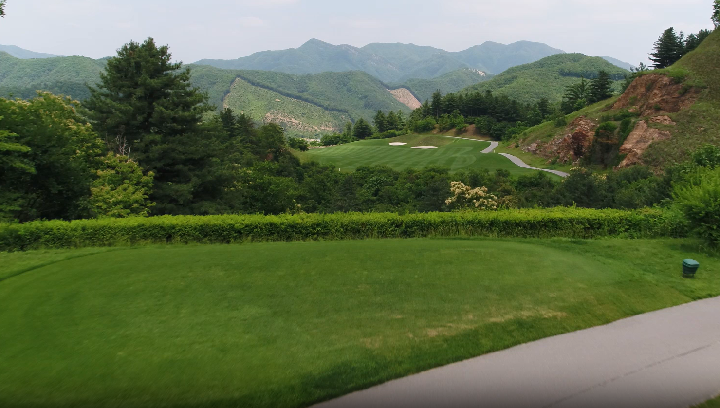 마운틴 3번 끝없이 펼쳐진 내리막의 360m 거리의 파4홀입니다. 살짝 좌 도그렉 홀로 그린이 보이는 왼쪽은 공간이 별로 없어 공을 찾기가 어려움과 동시에 IP 지점에 벙커도 깔려 있어 매우 주의하여야 합니다. 반면 오른쪽은 시야에 가려져 있지만 공간도 어느정도 있고 오르막으로 이어져 있기 때문에 페이드로 공략하는 것이 유리합니다. 티샷 이후에도 그린 왼쪽의 호수는 압박감을 가져다 주므로 신중한 공략이 필요한 홀입니다.