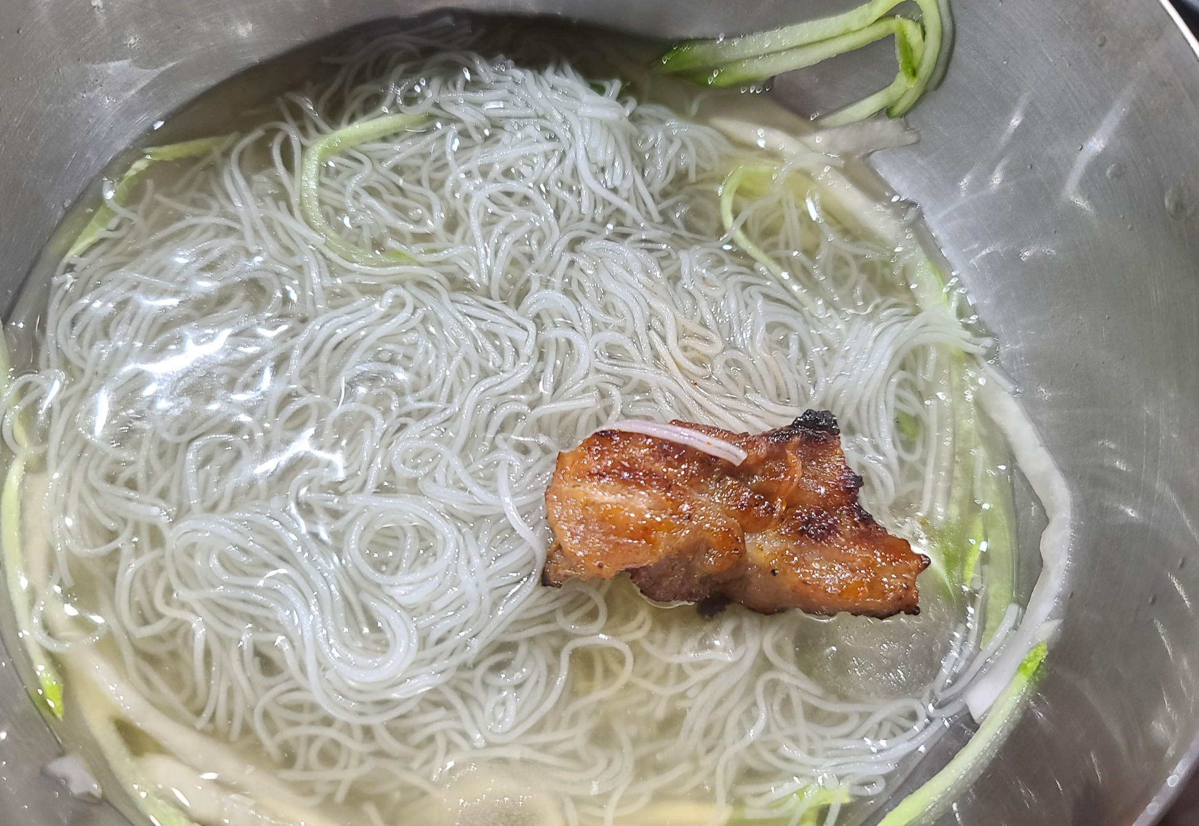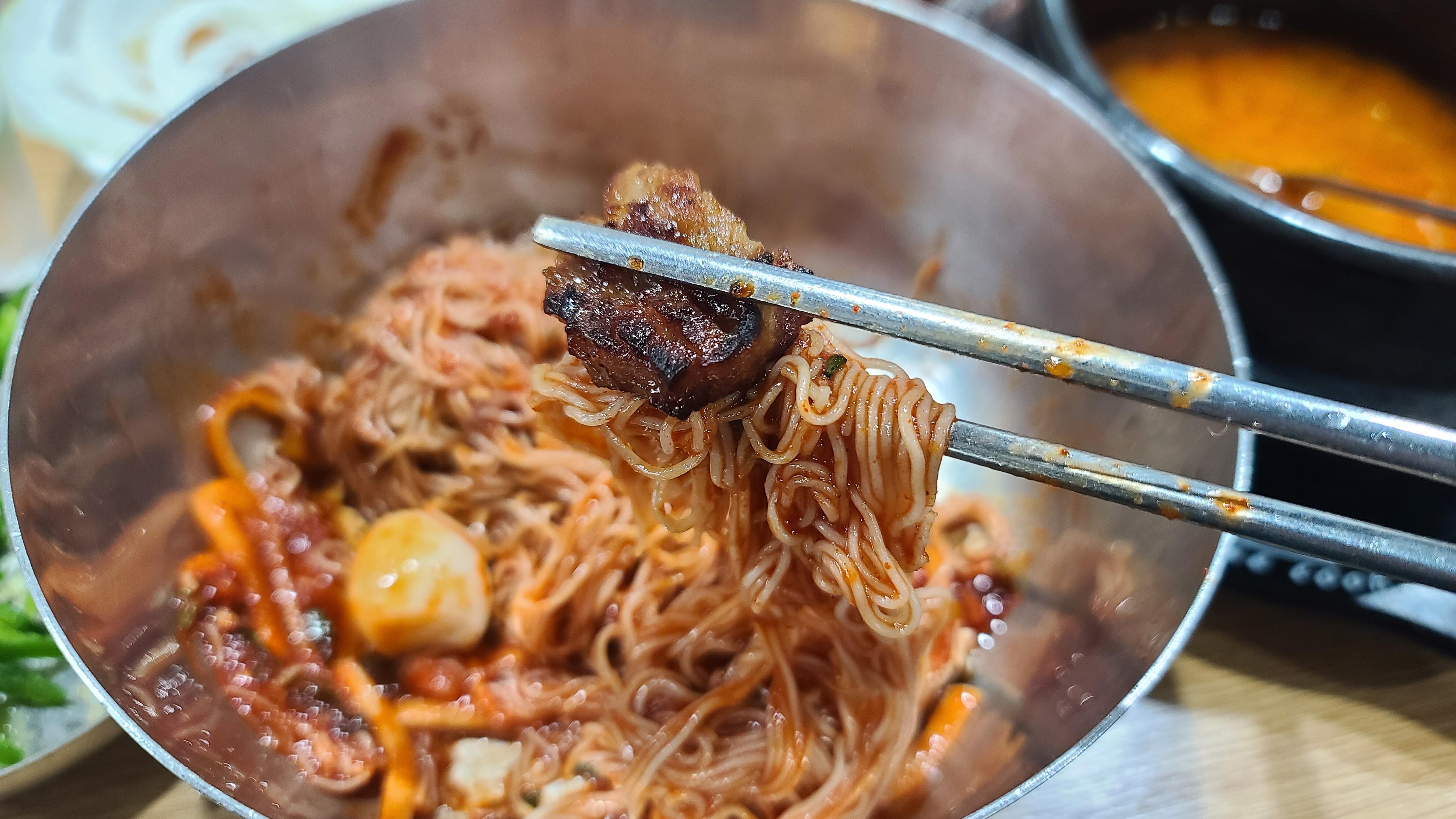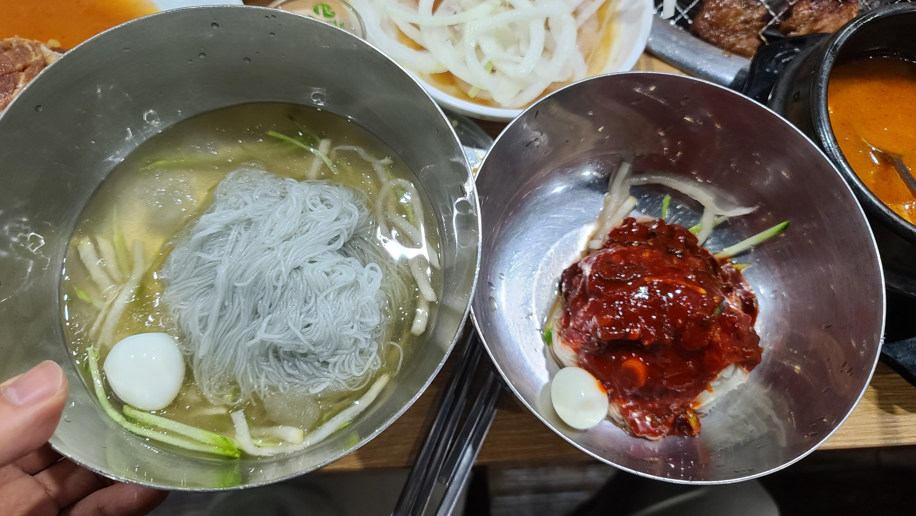 맛있는 양념 돼지갈비를 집어서 후식냉면, 취향에 따라 비냉과도 먹어보고 물냉과도 먹어봅니다. 고기는 냉면과 함께 마무리를 해야하는 사람들에게 최고의 선택이 될만한 맛이며 엄밀히 따지면 맛은 물냉이 더 나은 컨디션을 보여주고 있습니다.