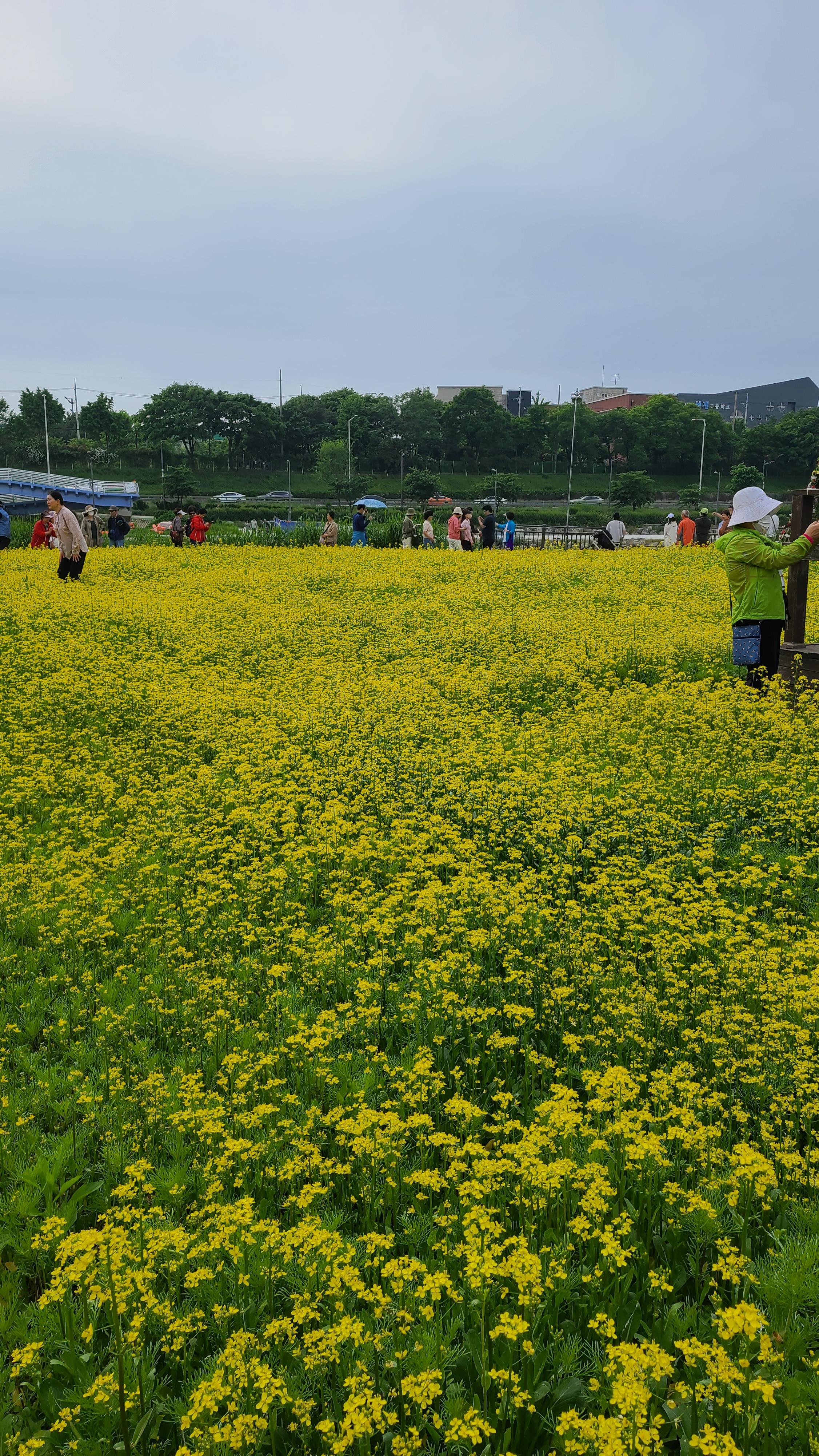 묵현초등학교 앞의 산책로는 동부간선도로를 지나는 다리가 바로 설치되어 있고 이 다리를 이용하여 반대편의 중랑천이 바로 맞닿은 푸른 유채꽃 들판의 산책로로 넘어갈 수가 있습니다. 다리위에서 반대편의 상황을 보니 이미 많은 사람들이 축제를 즐기고 있는 모습이 보여집니다.