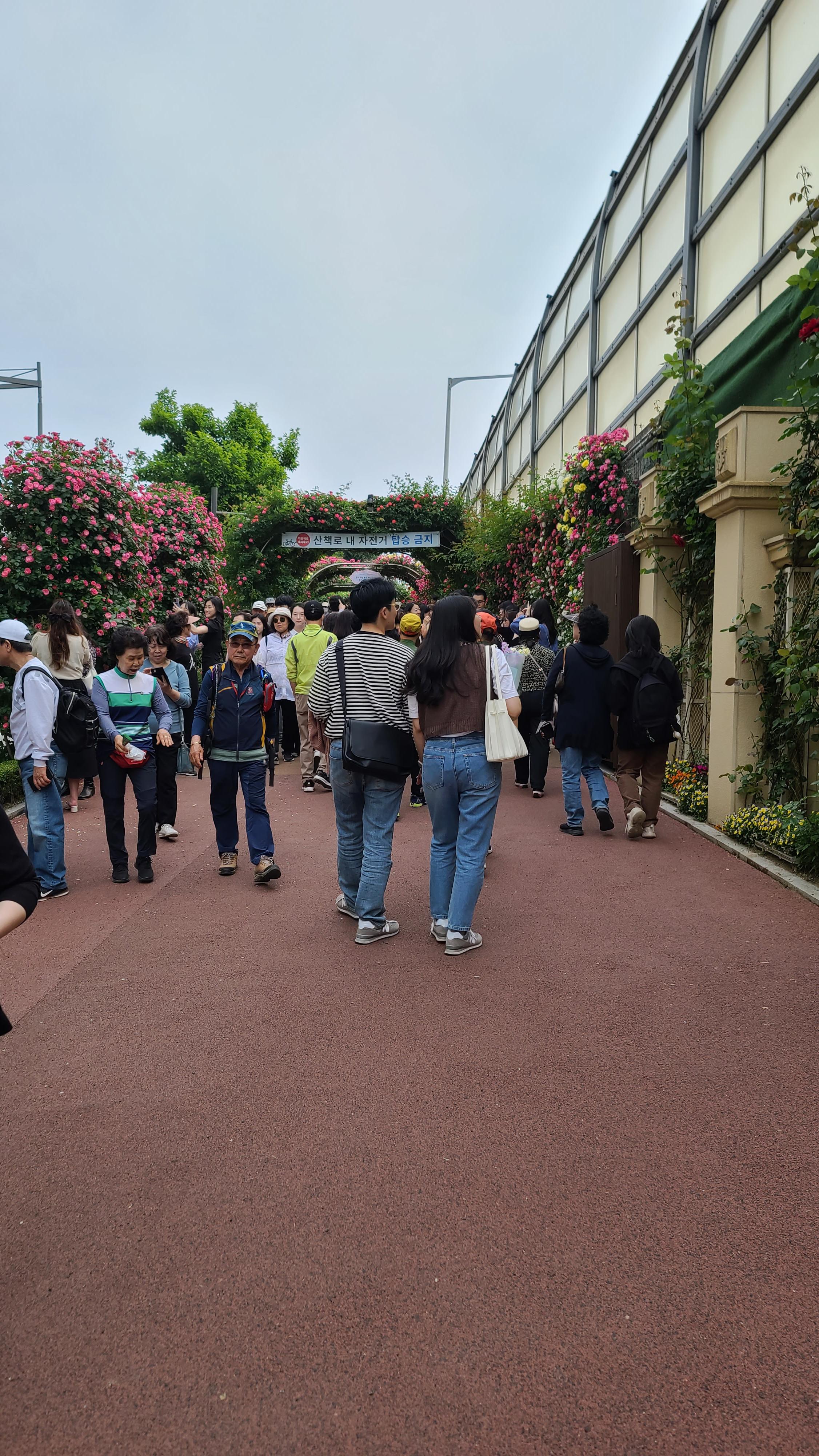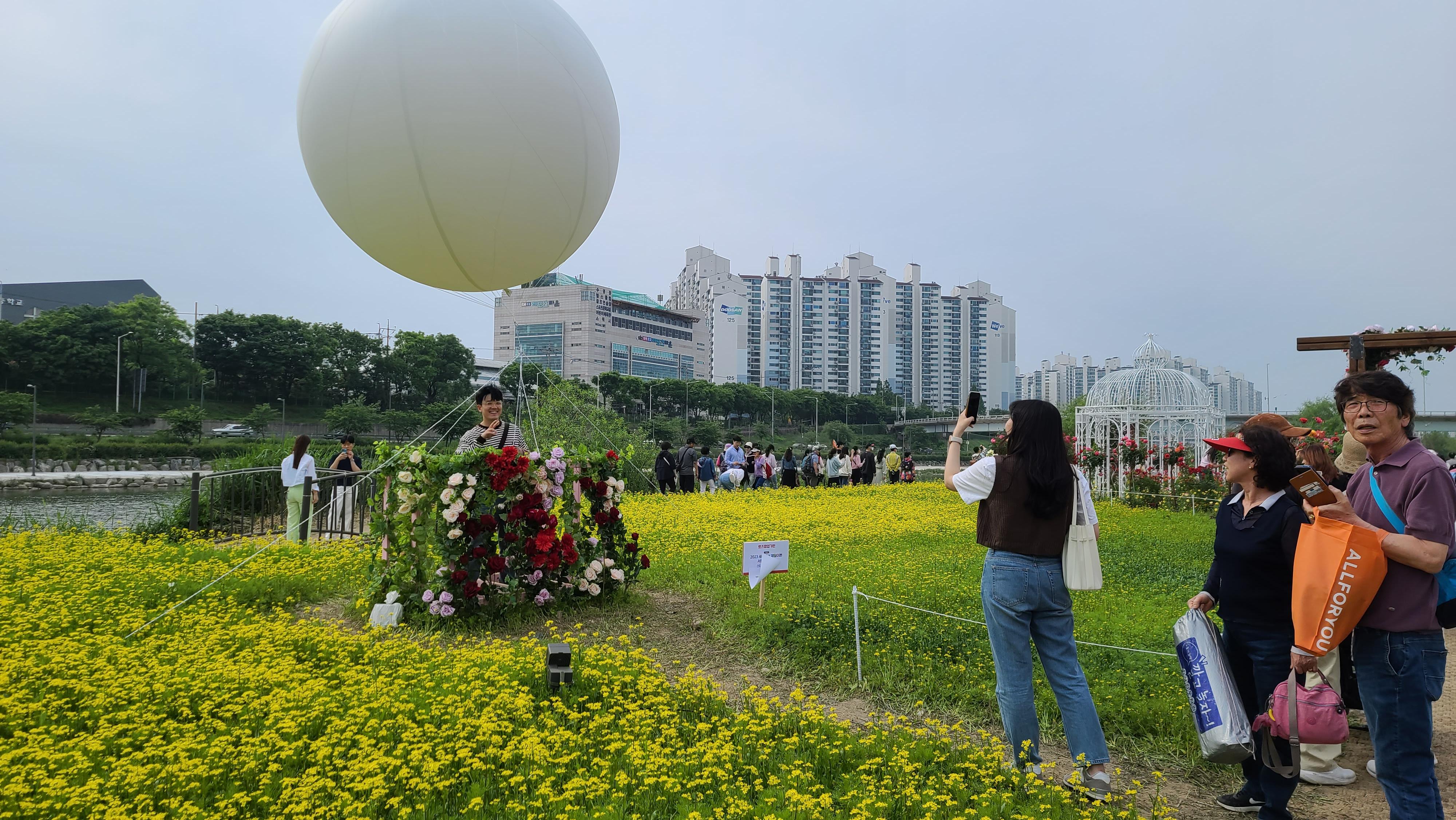 인공적으로 만들어놓은 포토존외에도 자연이 만들어준 유채꽃, 풀밭, 하천, 장미 등의 천연 포토존들이 구성되어 있으며 저마다 눈으로도 즐기고 사진도 남기고 사진과 함께 즐거운 장미축제를 즐기고 있는 모습입니다.