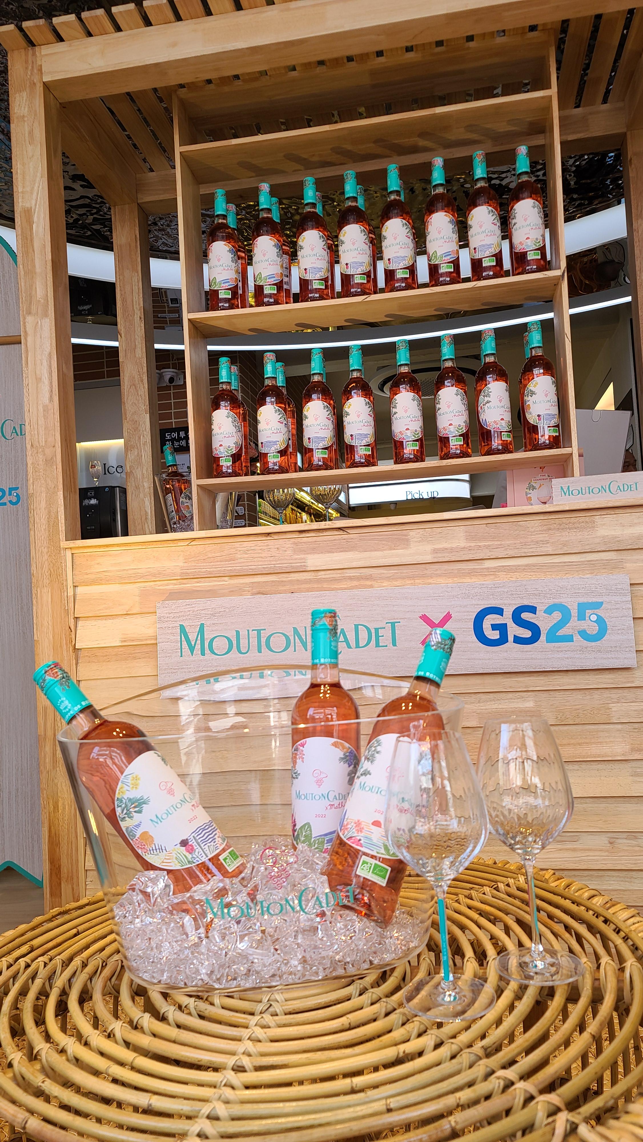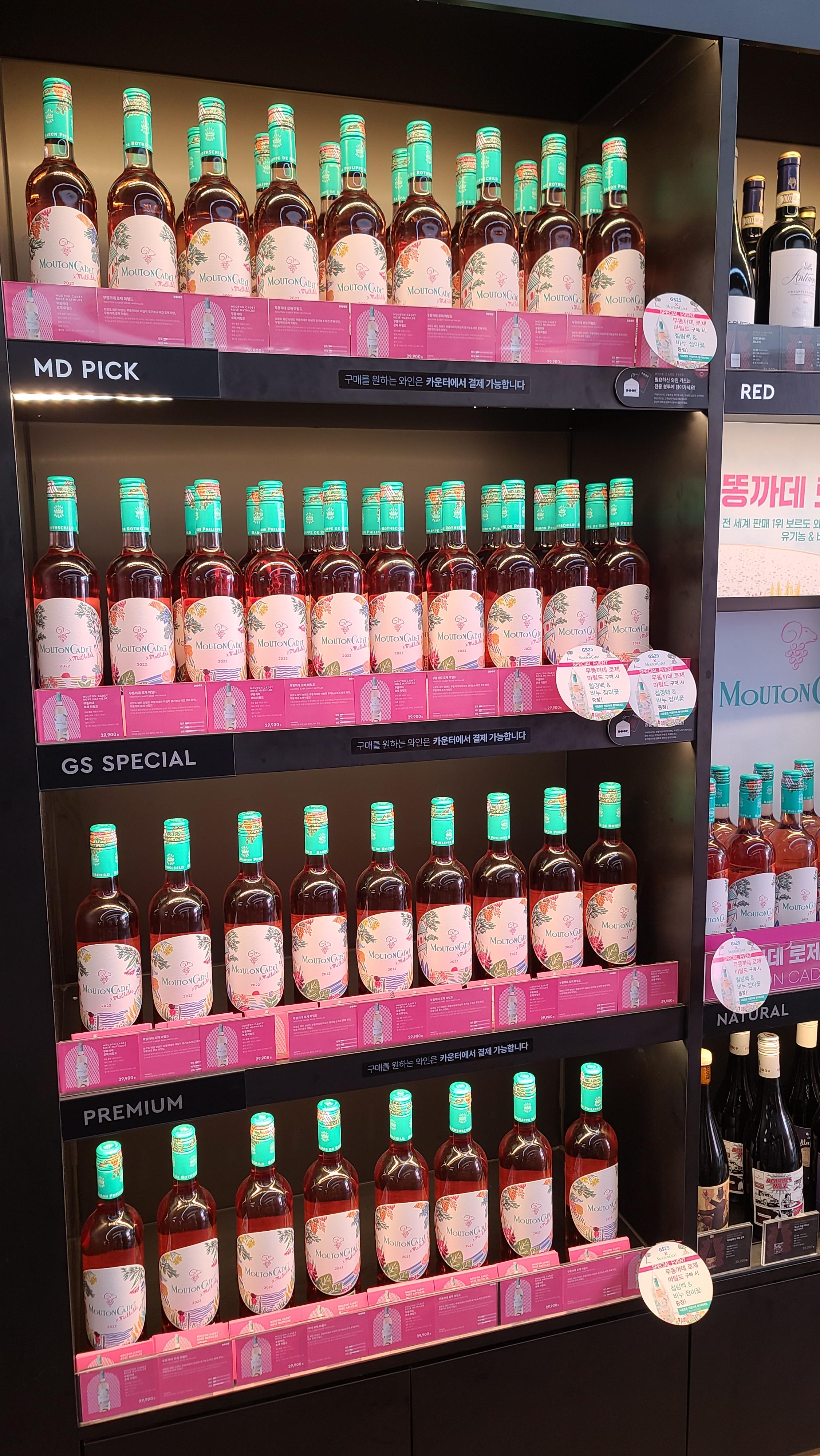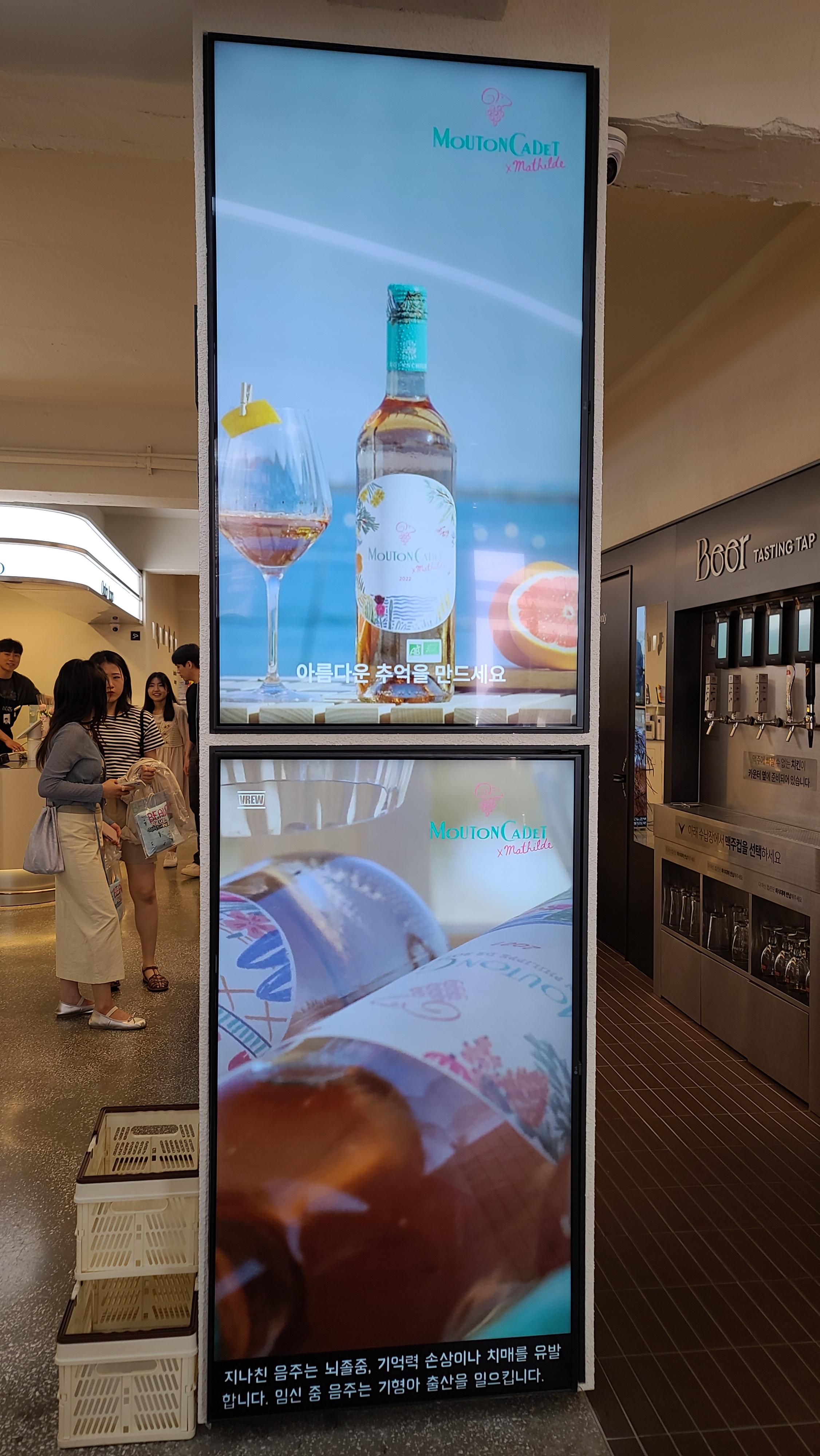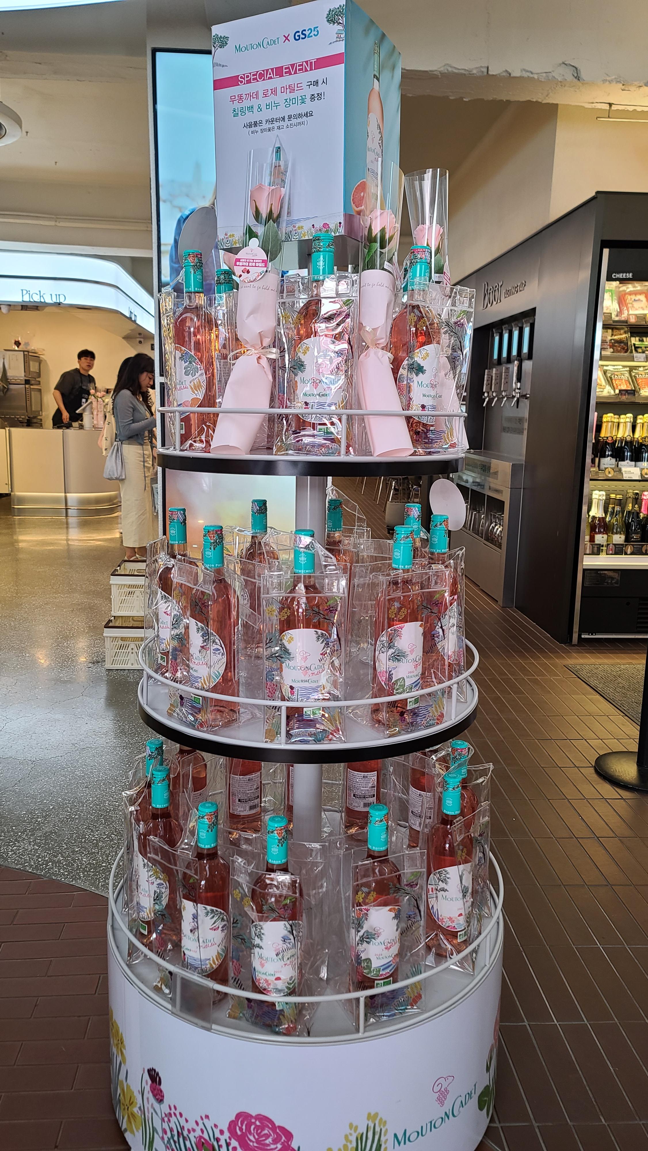 내부에서 팝업스토어의 구성을 하나하나 살펴봅니다. 타워형 선반에 무똥까데 로제 제품이 원형으로 진열되어 있고 옆으로는 여름에 즐기는 로맨틱한 로제와인의 브랜드 영상이 세로형 디스플레이에 계속적으로 흘러나오고 있습니다.