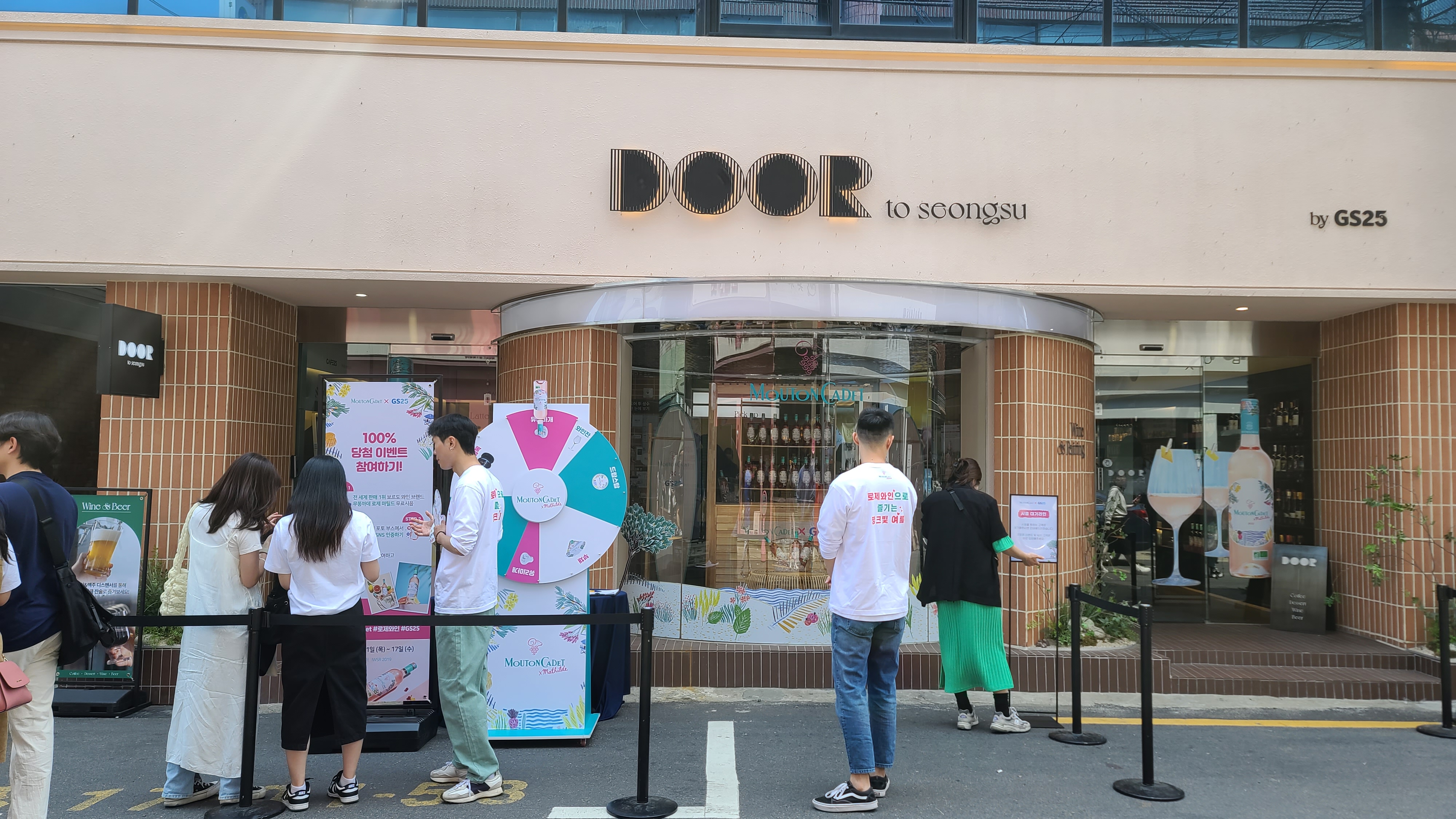 성수 카페거리 핫플 도어투성수에서 세계적인 와인 무동까데 로제 팝업스토어가 개최한다는 소식에 주류 전문가로서 기꺼이 발걸음을 성수로 옮겨봅니다. 도어투성수 앞에 도착해서 살펴보니 이미 여러사람들이 줄을서서 룰렛을 돌리거나 팝업스토어를 살펴보고 있는 모습이 보입니다.